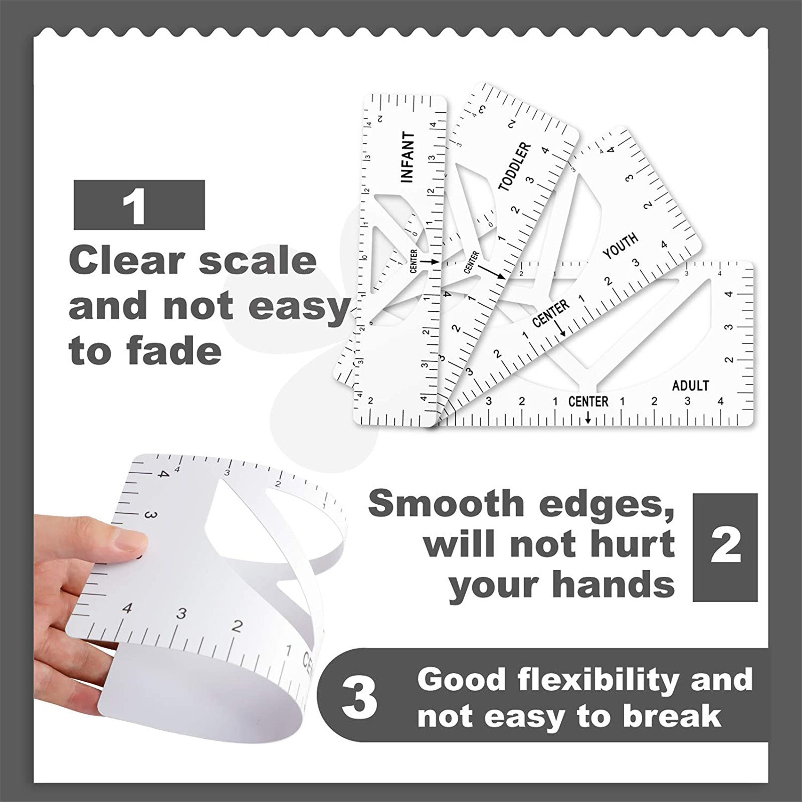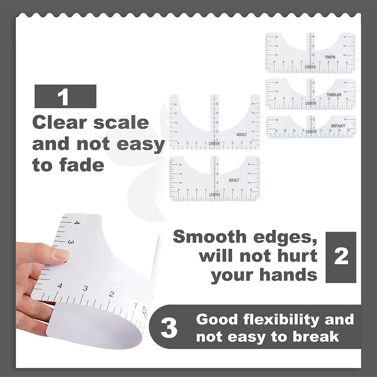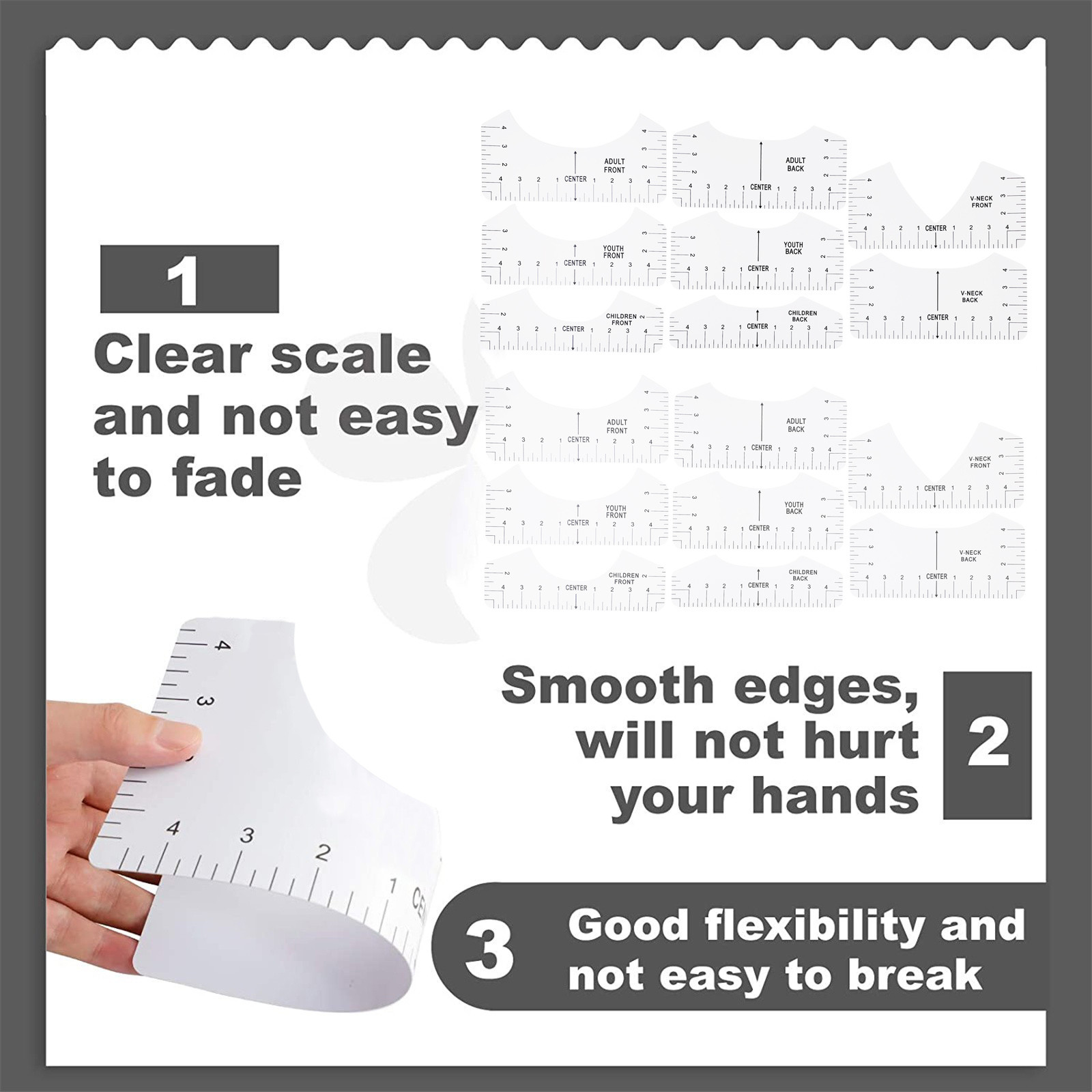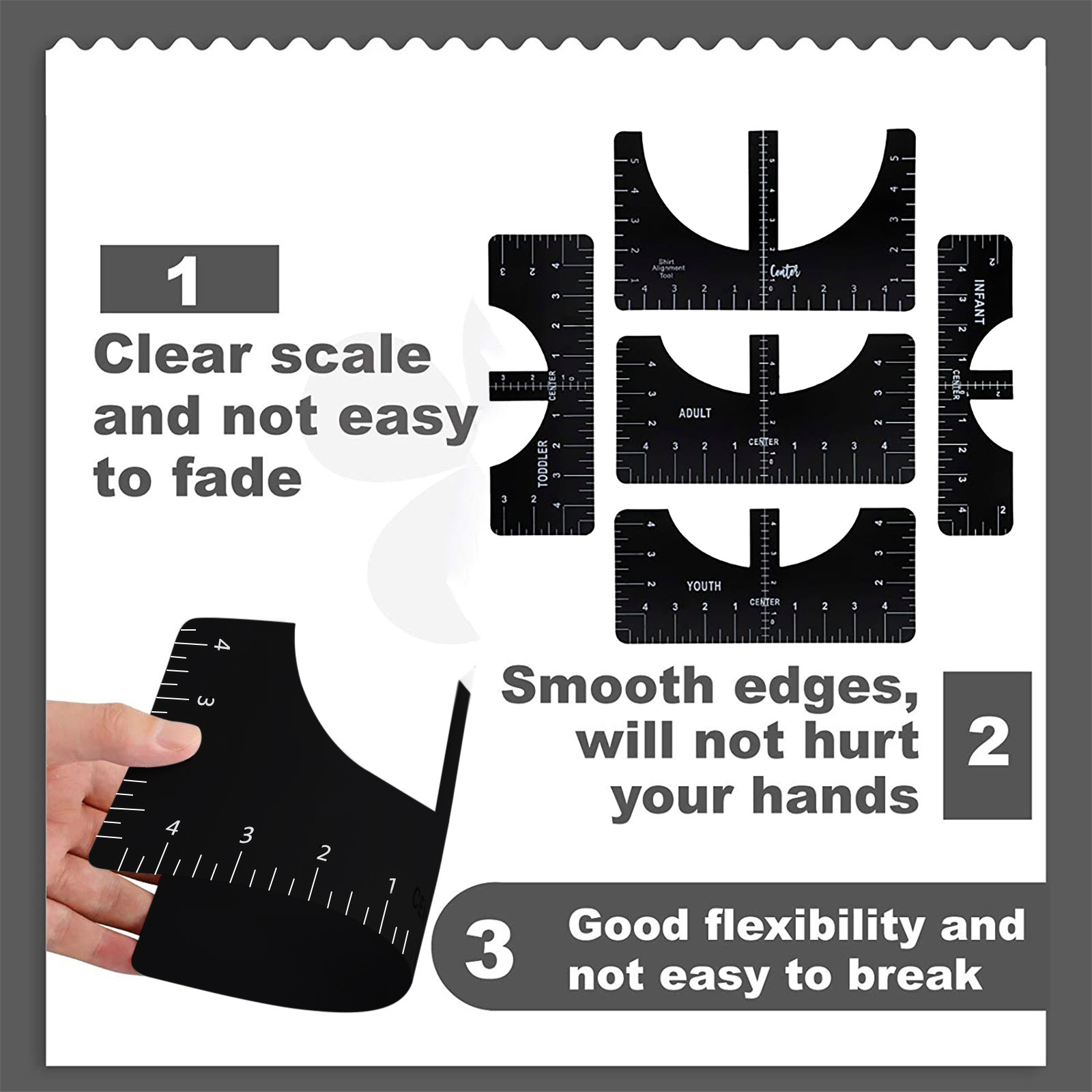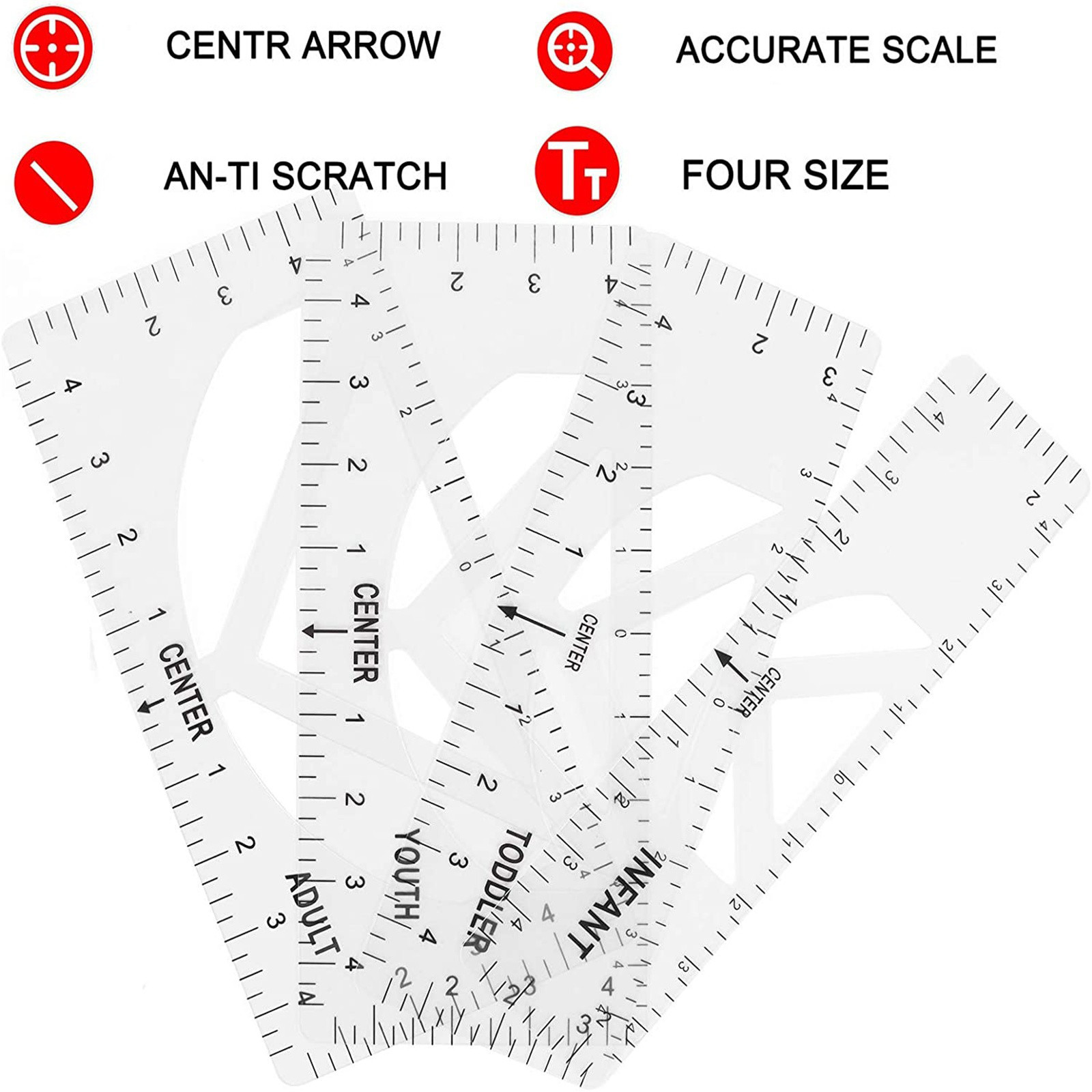 What you can get: Four sizes of sewing rulers, including adults, young children and babies, can meet the clothing needs of the whole family. It is a great craft tool to make your design and measurement more accurate and comprehensive. Easy to use: T-shirt ruler is easy to use. Just align the ruler with the collar of the T-shirt and center the design before embossing. This applies to anyone in the T-shirt business. Help you align left, center or right, and save the time of designing the center. High quality: The middle ruler is made of high-quality PVC, so there is no need to worry about the pvc ruler broken! Can be twisted at will, can be reused DIY T-shirt design: T-shirt alignment tool will help align the design with the shirt and help to align the print perfectly every time! Never worry about things not being centered anymore!High satisfaction: 100% satisfied-if you are not satisfied with our sewing ruler for any reason, please feel free to contact us. We will take full responsibility and responsibility for the quality of our products, and do our best to solve your problems quickly and efficiently!