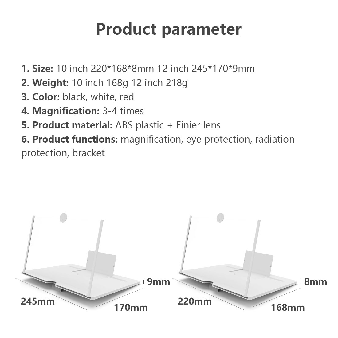 Параметры продукта 1. Размер: 10 дюймов 220*168*8 мм 12 дюймов 245*170*9 мм 2. Вес: 10 "168 г 12" 218 г 3. Цвет: черный, белый, красный 4. Увеличение: 3-4 раза 5. Материал: АБС-пластик + линза Френеля 6. Функции продукта: увеличение, защита глаз, радиационная защита, поддержка