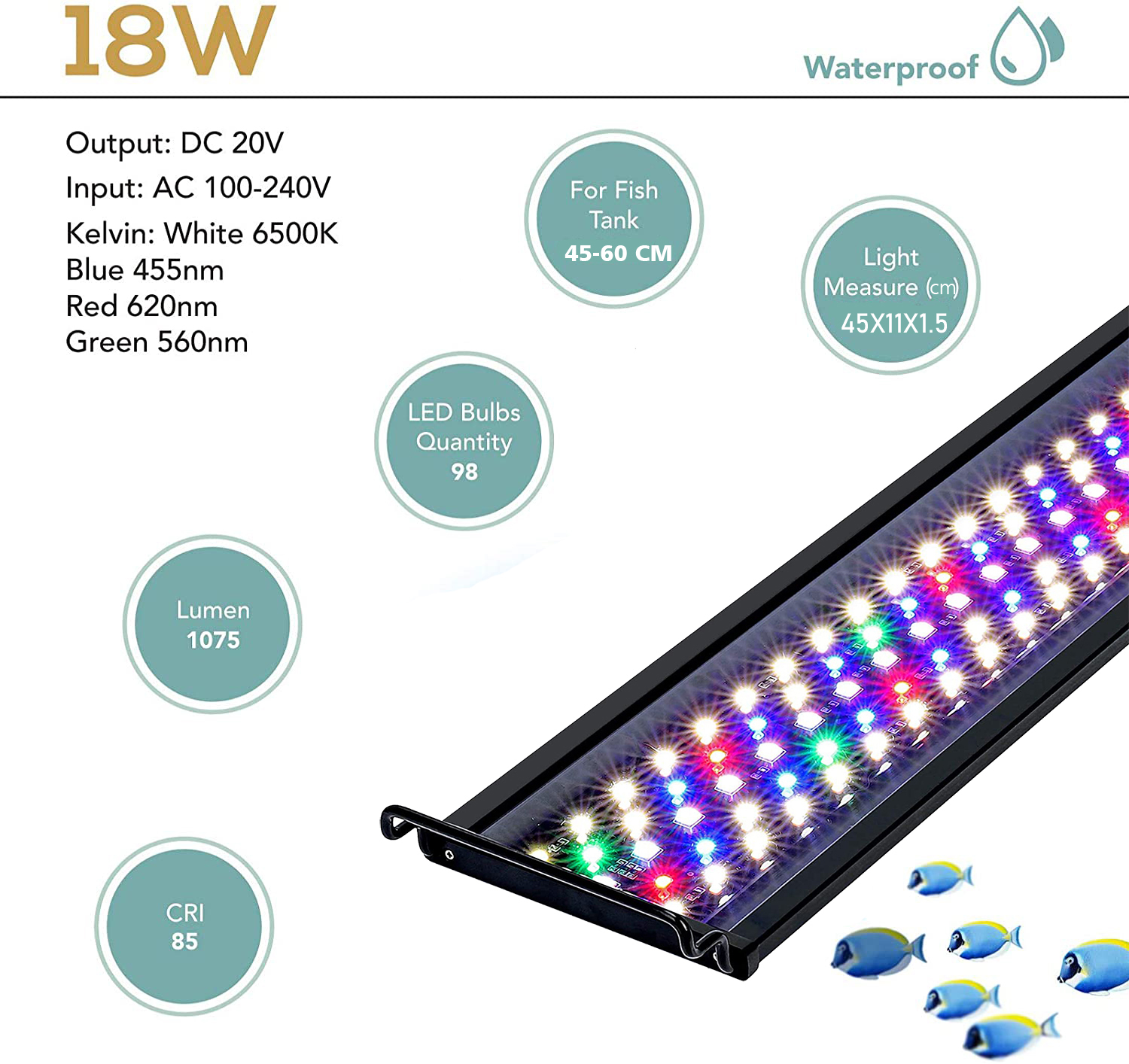 Тонкий аквариумный светильник WRGB 2 DC20V. Премиум 5050 и 2835 светодиодов. 5 рядов светодиодный бусин обеспечивают яркое освещение для вашего саженого бака. 6500K белые светодиоды сочетаются с 455nm синим, зеленым 560nm и 620nm красными светодиодами, создавая эффект полного спектра освещения. Супер яркий, делает аквариумную воду более блестящей и чистой. Мульти-размер и рекомендуется для аквариума 30 - 105 см. Идеально подходит для роста водных растений.