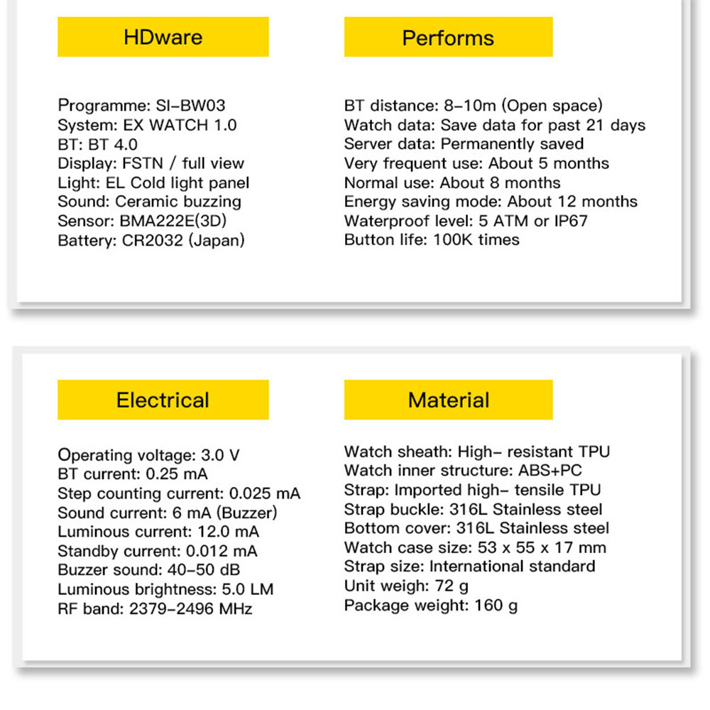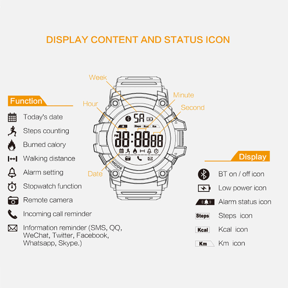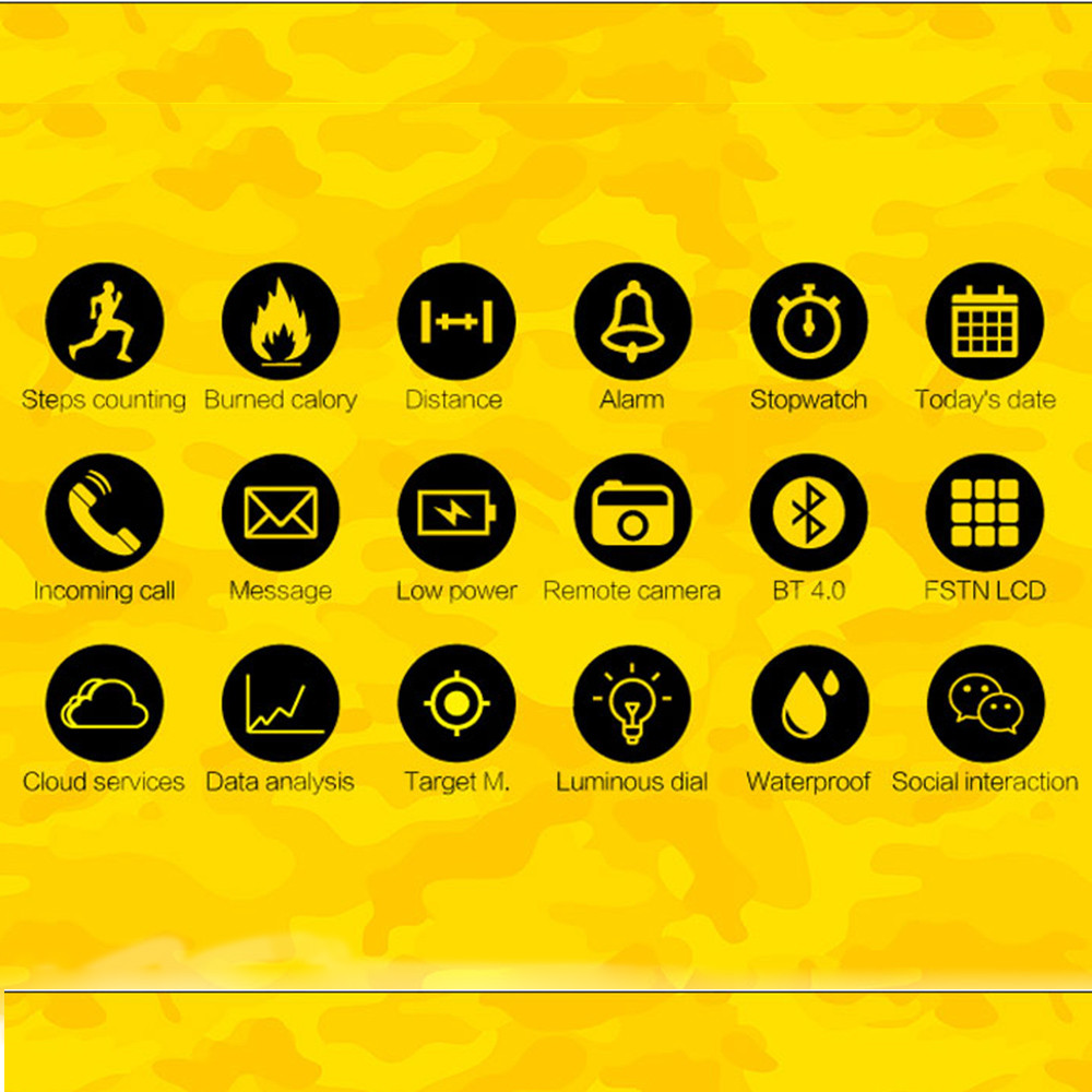 Дополнительные функции: отображение полного времени, подсчет шагов, сжигание калорий, Расстояние, будильник, режим часов, Шагомер Секундомер, дата дня, входящий вызов, Напоминания SMS, уведомления напоминания, низкая мощность, удаленная камера, облачные услуги, Анализ данных, целевой M, световой циферблат, соцвзаимодействие