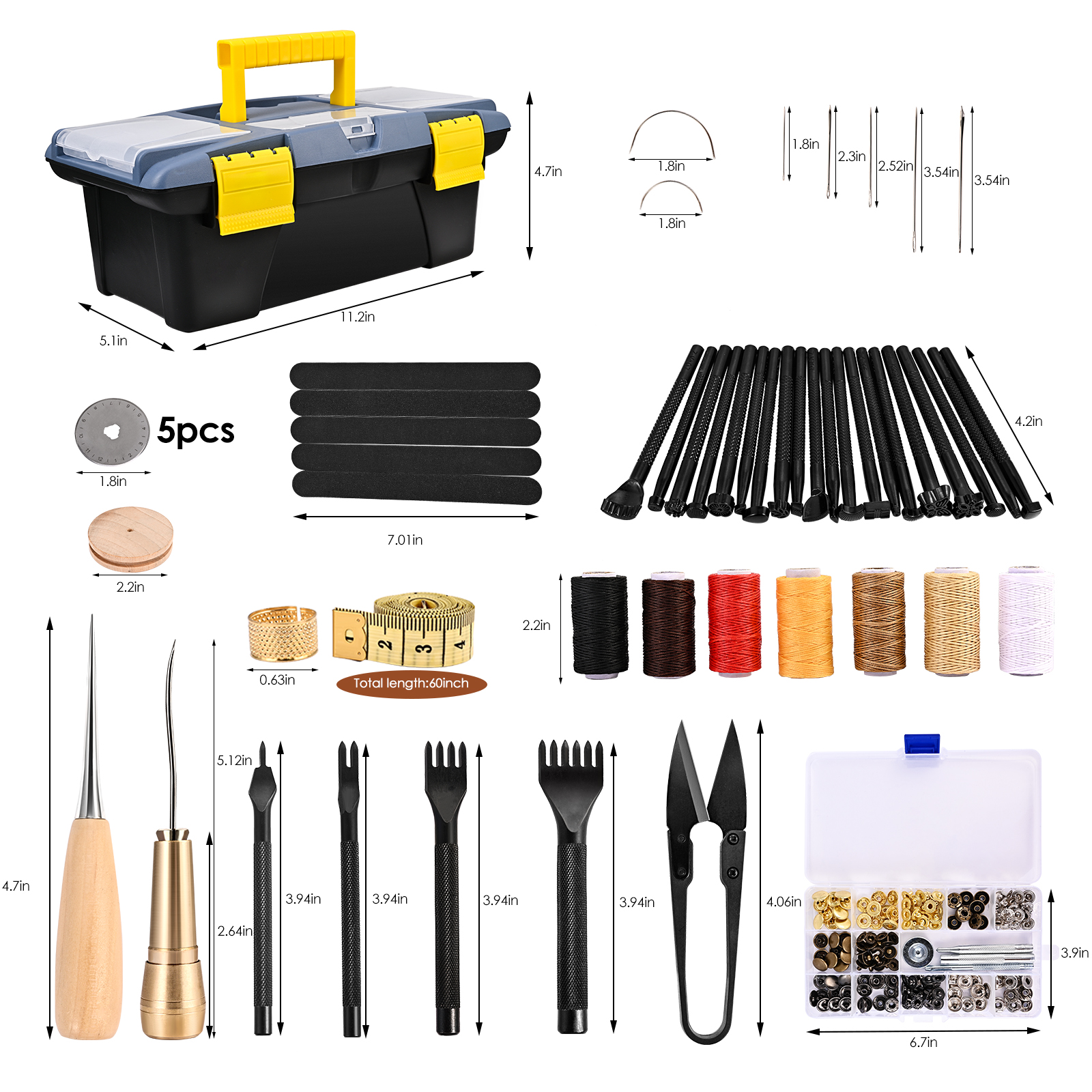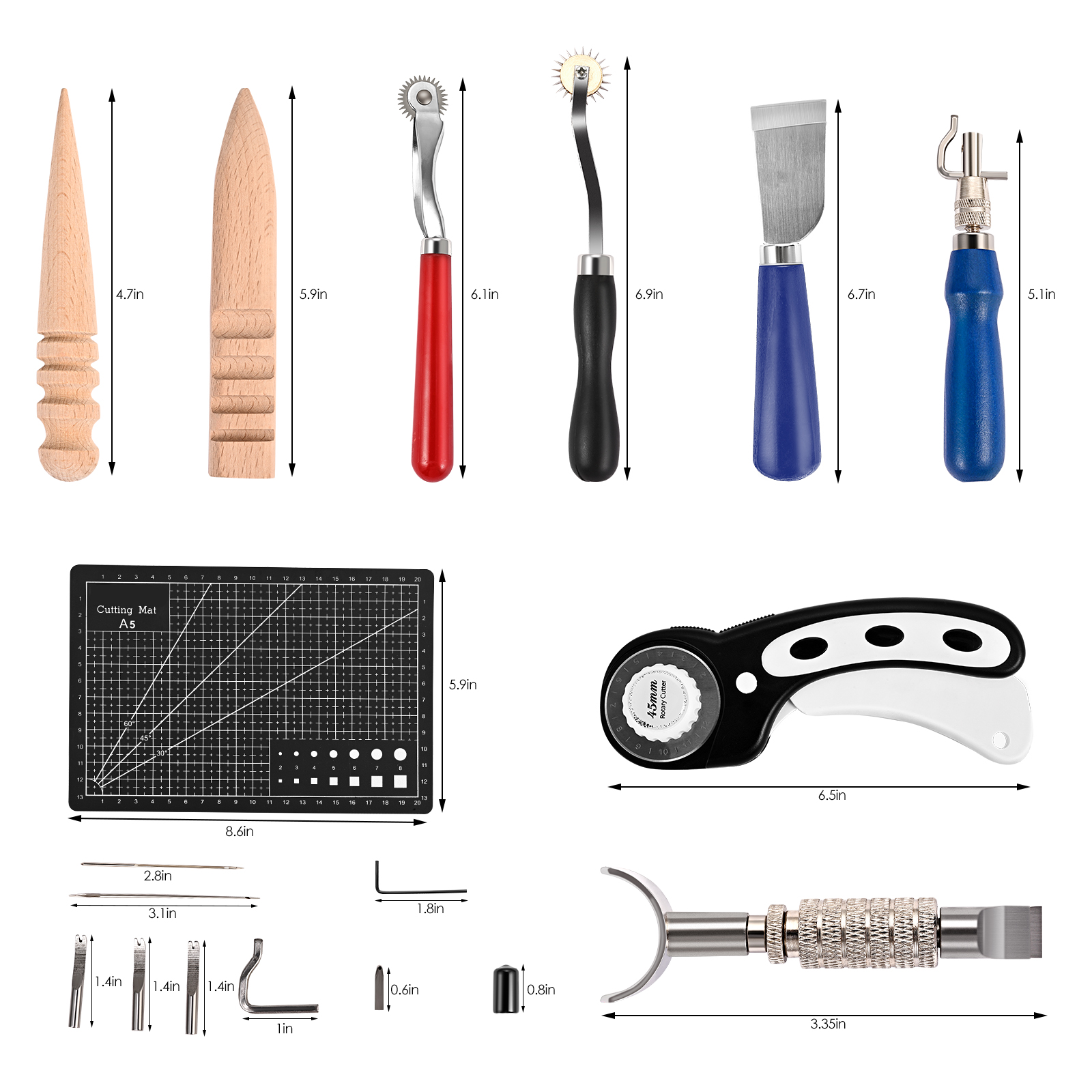 Set includes punch tool, rotary cutter kit, cutting mat, fork punch (1/2/4/6), edge cutter, sewing scissors, rotary knife, adjustable seam slotter, copper awl and other leather Repair tools can meet all our needs for handmade leather production.