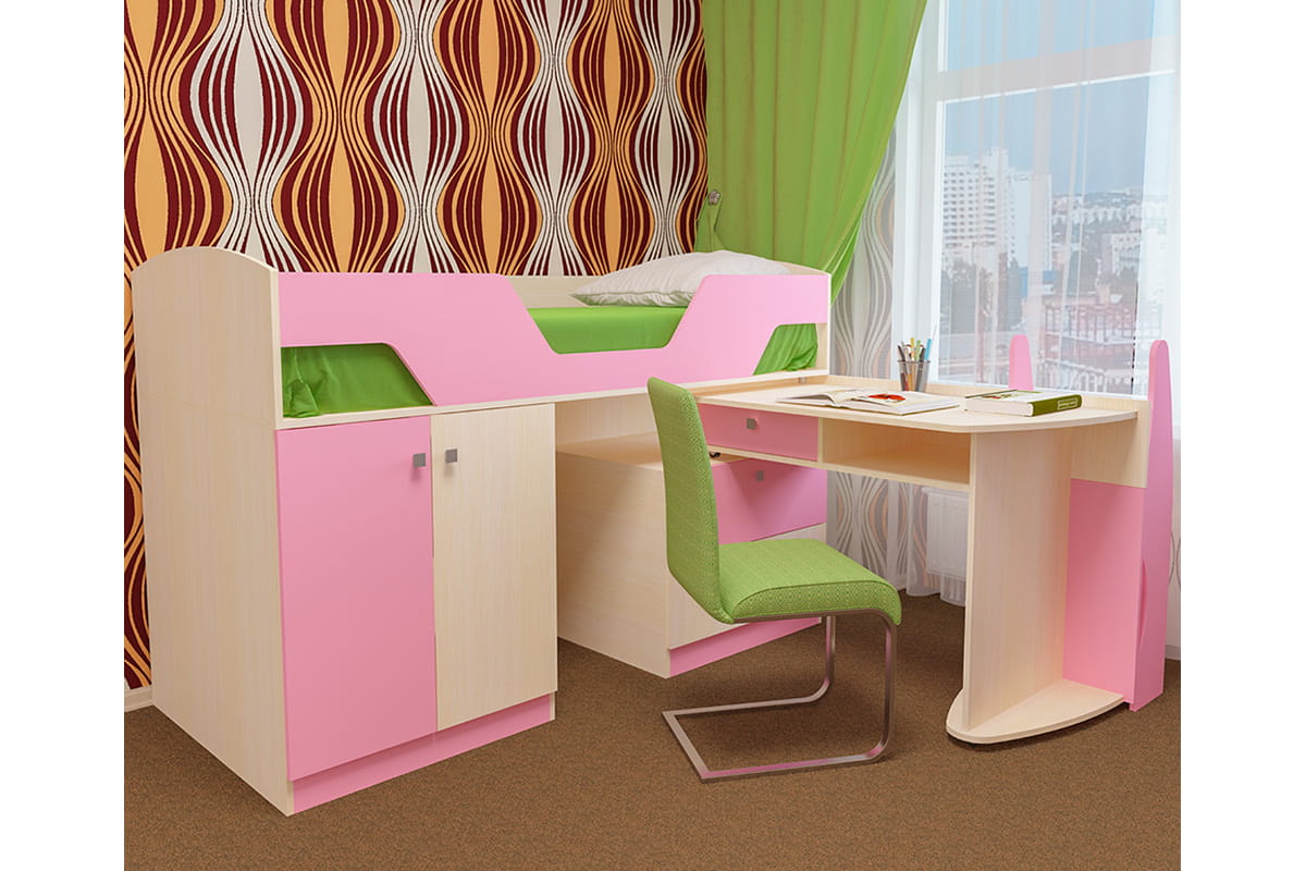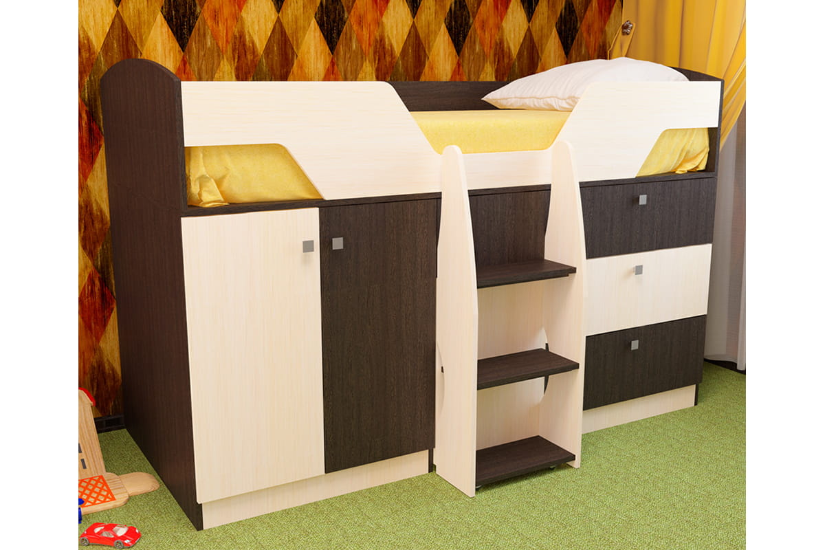 Кровать-трансформер, которая сочетает в себе спальное место размером 1800х800, рабочий стол и место для хранения. Размеры спального места позволяют использовать кровать длительное время. Оборудована специальным фасадом, удерживающим ребёнка во время сна. Кровать актуальна для небольших комнат, так как при необходимости рабочий стол разворачивается и задвигается, освобождая при этом место для игр. Конструкция устроена так, что стол выдвигается на колёсах вместе с лестницей и упрощает процесс трансформации. Кровать оборудована выдвижными ящиками и шкафом для одежды. Кровать изготовлена из качественного ламинированного ДСП толщиной 16 мм класса Е1, обеспечивающего необходимую прочность и долговечность деталей. Все края обработаны ударопрочной кромкой ПВХ, которая значительно увеличивает срок эксплуатации изделия. Для сборки используется фурнитура ведущих мировых производителей. Изделие упаковано в плоский гофрокартон, оклеенный скотчем с логотипом фабрики. На упаковках имеется ярлык, содержащий следующие сведения: наименование изделия, цвет, дата упаковки, кодовый номер упаковщика. Внутри имеется пакет с необходимой фурнитурой и подробная инструкция по сборке. Вся мебель фабрики ПИРАМИДА сертифицирована и абсолютно безопасна для здоровья.Размеры: