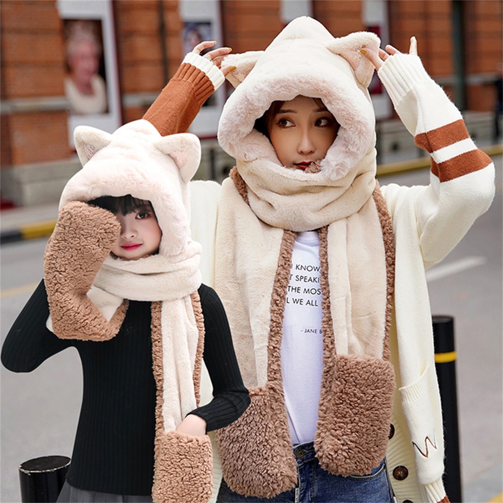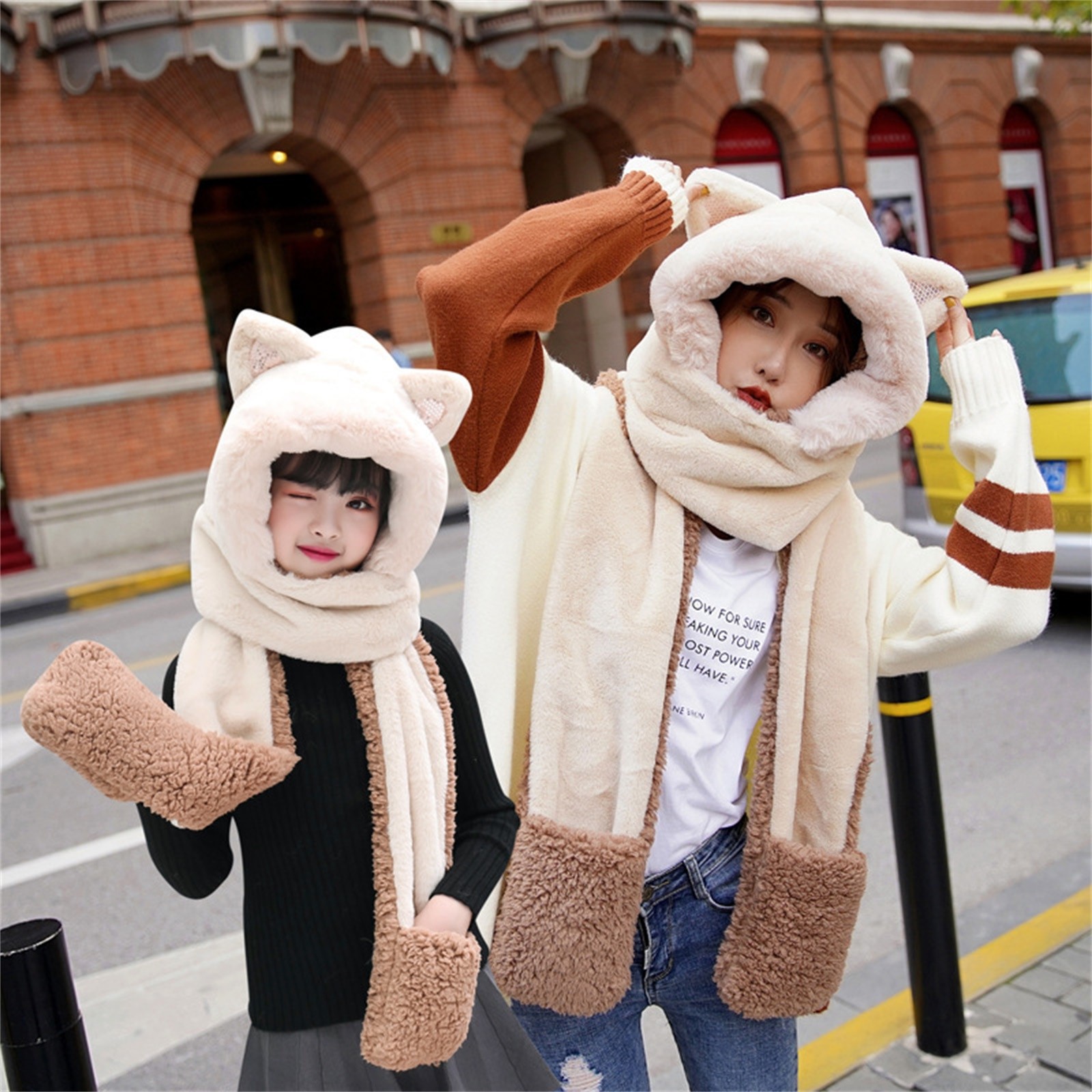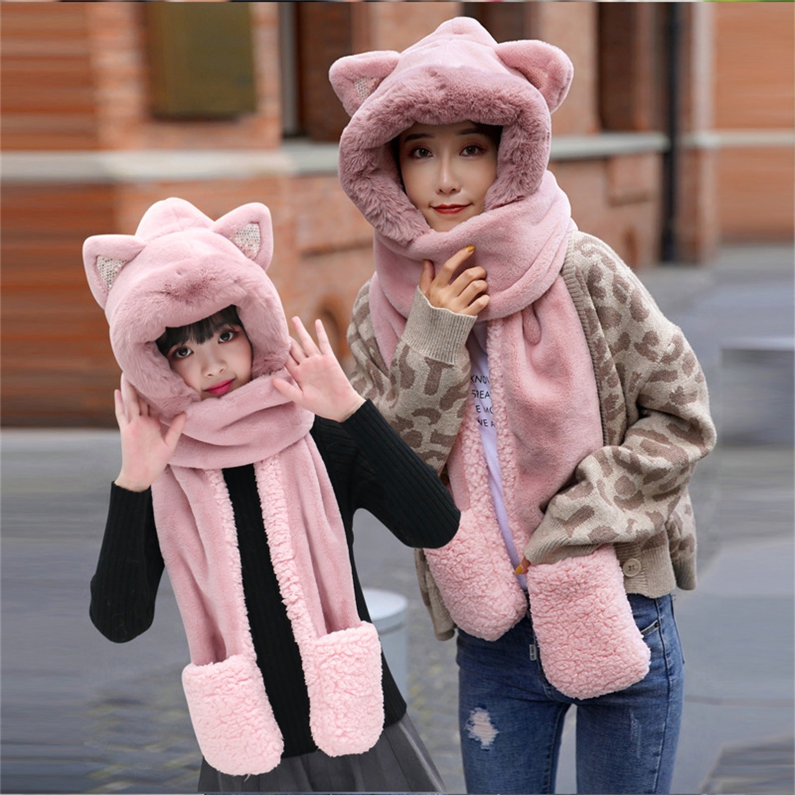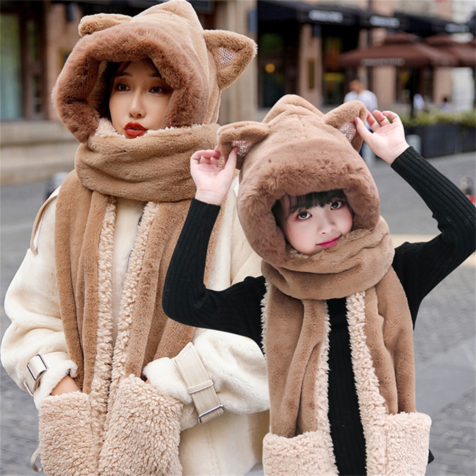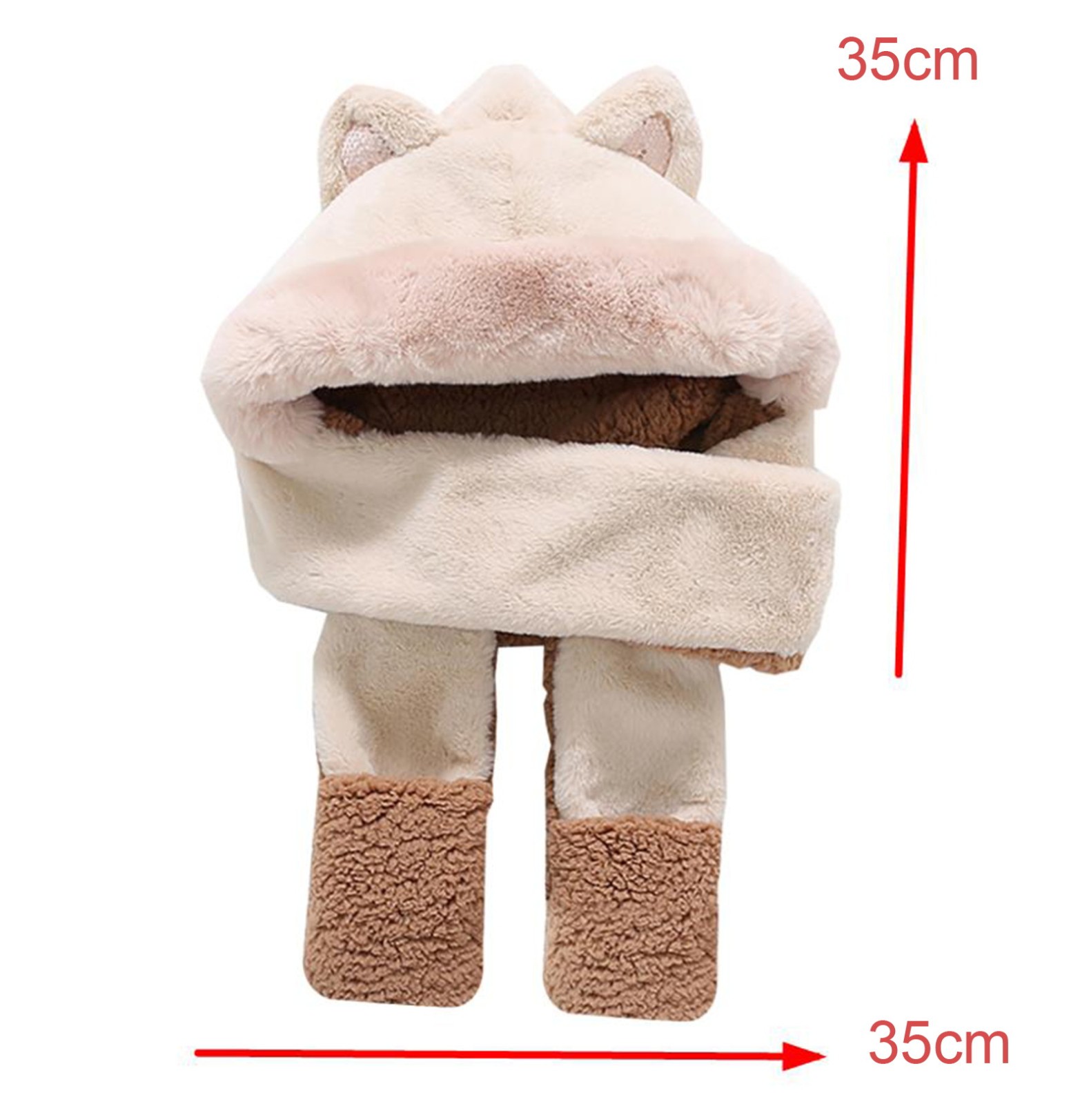 Комплект: 3 в 1; Милые зимние утепленные шапки с капюшоном и ушками животных