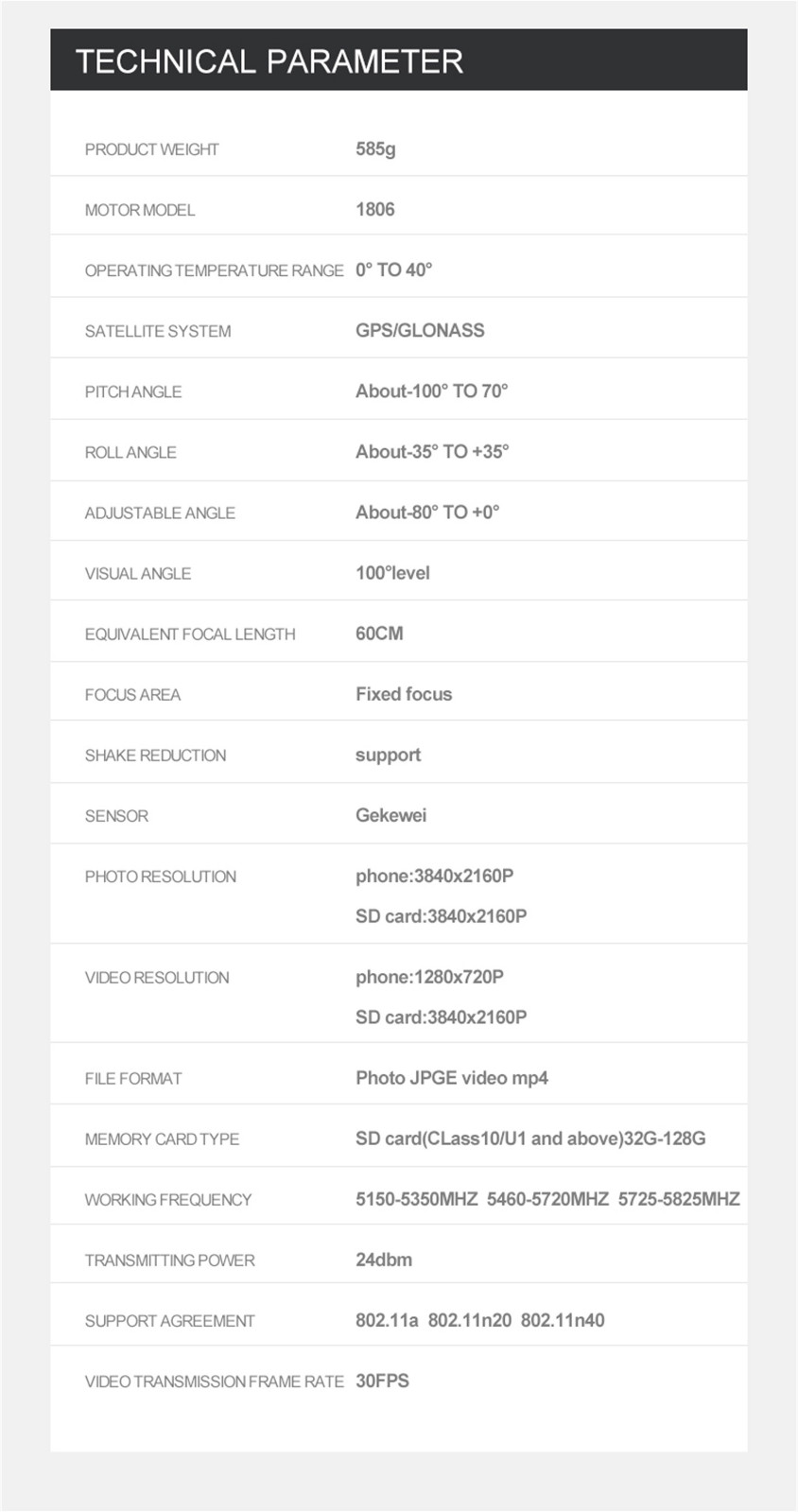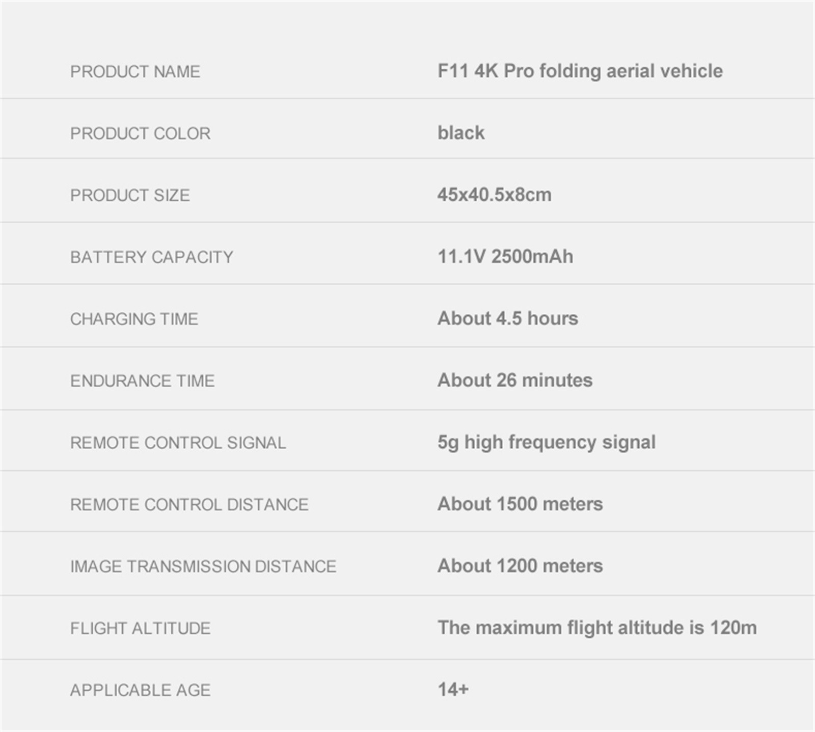 Наименование товара: Бесщеточный GPS Дрон F11S Pro 4K RC Регулятор частоты: 2,4 ГГц Частота кадров: 30 кадров в секунду Расстояние управления: 1500 м (свободное взаимодействие и отсутствие окклюзии) Изображение: около 3-10 м GPS следуй за мной: около 30 м Хранение: Поддержка sd-карты (не входит в комплект) Аккумулятор дрона: 11,1 В 2500 мАч Возраст: 14 + VIdeo Разрешение: 1280x720P по телефону, 3840x2160PОт sd-карты Разрешение фото: 3840x2160P по телефону, 3840x2160PОт sd-карты Батарейка контроллера: батарейка 3,7 V 300 мА-ч Размер квадрокоптера: 450x405x80 мм (в разложенном виде) 176x105x80 мм (в сложенном виде) Вес: около 585 г Мотор: 1806 бесщеточный мотор Время зарядки: около 4,5 часов Время полета: около 25 минут Двойной режим GPS/ГЛОНАСС: Да 5G Wi-Fi расстояние передачи изображения: 1000-1200 м (свободные помехи и Без окклюзии) Камера: 120 градусов широкоугольная камера (90 градусов регулируемый угол на пульте дистанционного управления Контроллер)Посылка: