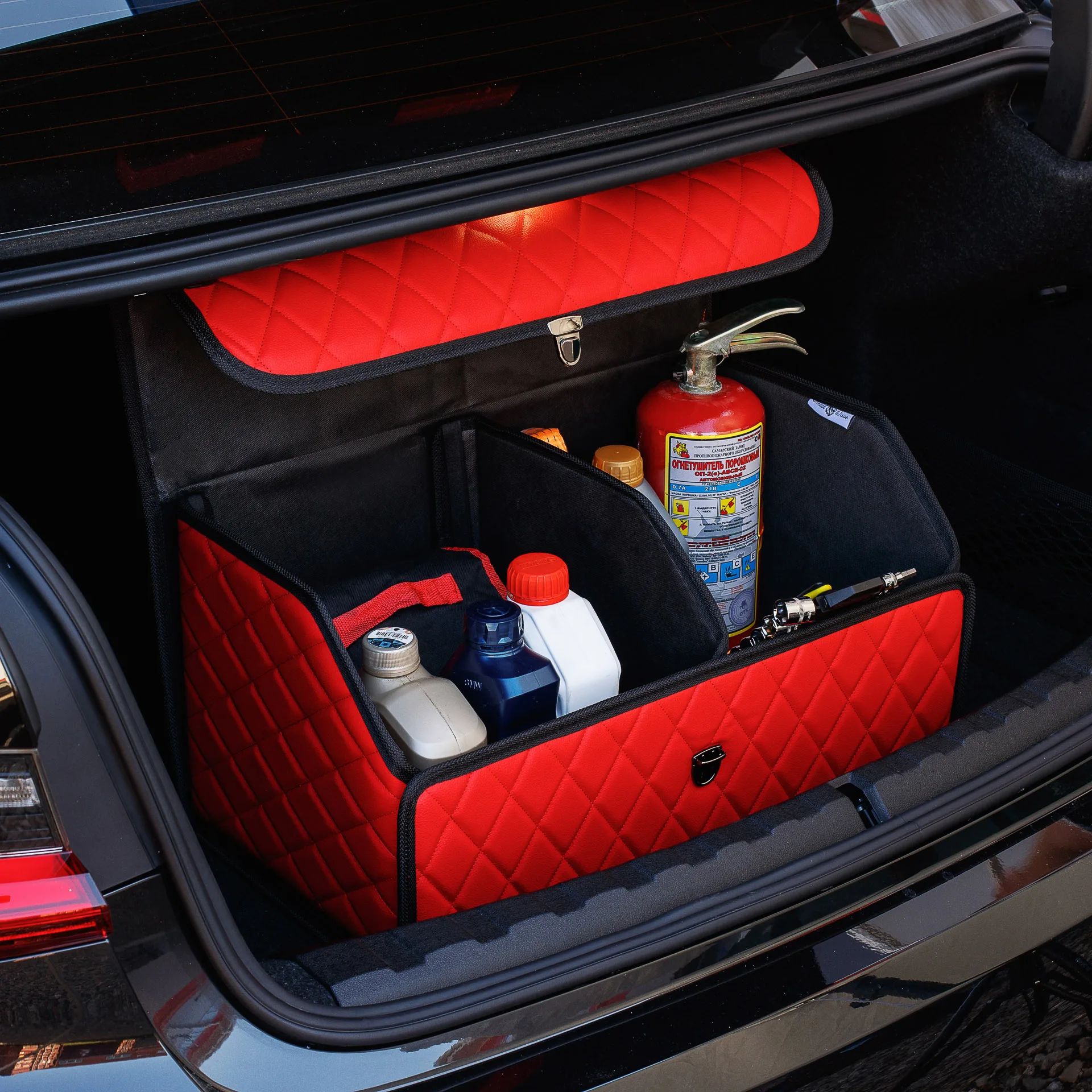 Вместится все: огнетушитель, аптечка, бутылки с водой, тряпки. Износостойкий, качественный материал экокожа приятен на ощупь. Гидрофобная пропитка основы бокса обеспечит долгий срок службы. Армированные нити и крепкие липучки выдержат даже сильную нагрузку.