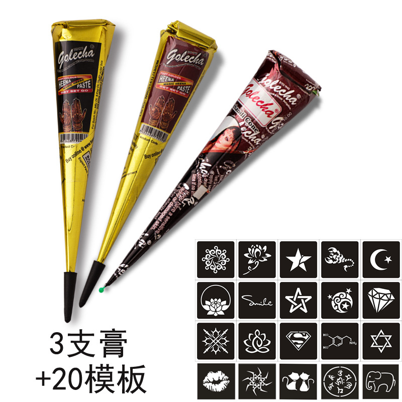 Этот набор содержит три пасты для татуировок (черный, коричневый, красный) и 20 шаблонов (6*6 см)