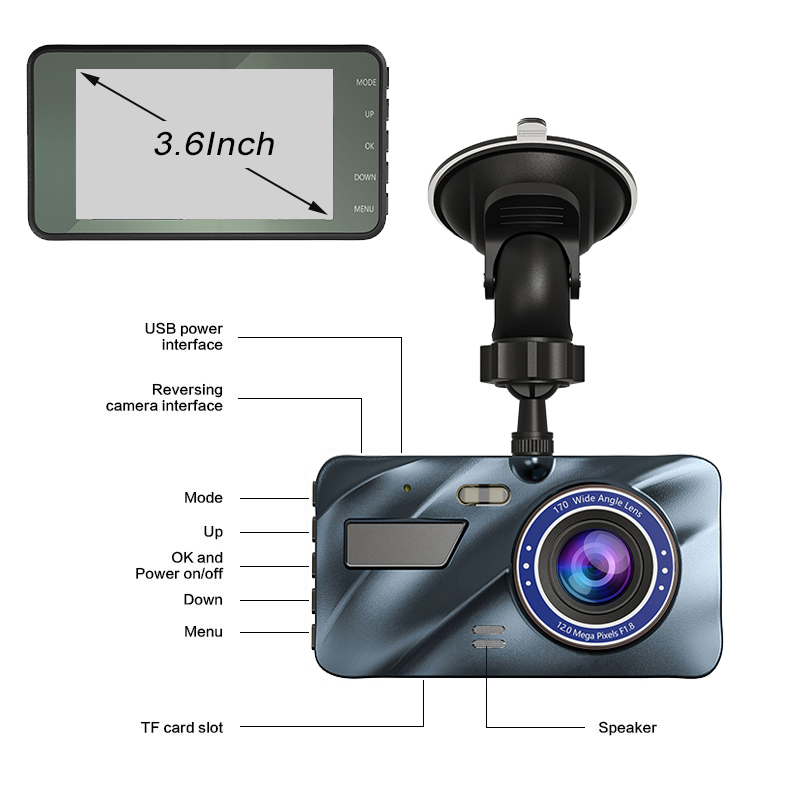 Особенности Разрешение видео: 1080P/720P. Размер экрана: 3,6 дюймов Формат видео: AVI Формат фото: JPEG Функция: циклическая запись/Обнаружение движения/гравитационное определение/мониторинг парковки Угол Линзы: 170 градусов. Язык дополнительно: китайский/английский/русский/японский/французский/немецкий/испанский и т. Д. TF :8G ~ 32GB (C10) Рабочее напряжение: 5 В постоянного тока Рабочий ток: 2000 мА Частота: 50 Гц/60 Гц Температура хранения:-20 ℃-70 ℃ Рабочая температура: 0 ℃-60 ℃ Аккумулятор: 200 мА, встроенный. Посылка включает в себя: 1 х Автомобильный видеорегистратор Автомобильное зарядное устройство-1 шт. 1 x Руководство пользователя 1 x кронштейн