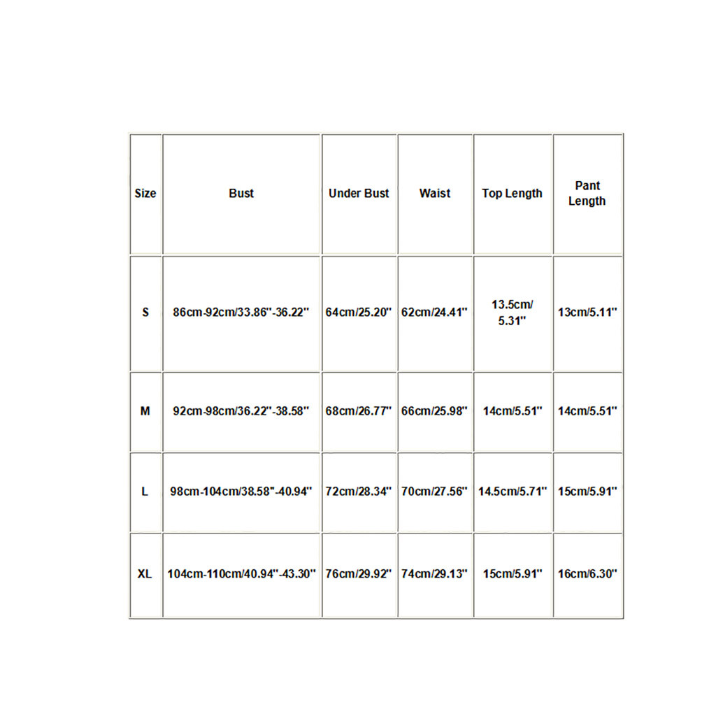 Size Bust Under Bust Waist Top Length Pant Length S 86cm-92cm/33.86''-36.22'' 64cm/25.20'' 62cm/24.41'' 13.5cm/ 5.31'' 13cm/5.11'' M 92cm-98cm/36.22''-38.58'' 68cm/26.77'' 66cm/25.98'' 14cm/5.51'' 14cm/5.51'' L 98cm-104cm/38.58''-40.94'' 72cm/28.34'' 70cm/27.56'' 14.5cm/5.71'' 15cm/5.91'' XL 104cm-110cm/40.94''-43.30'' 76cm/29.92'' 74cm/29.13'' 15cm/5.91'' 16cm/6.30''Ключ пришёл быстро. Заказал для своего авто. Цена не высокая, для такого девайса. Долго искал в... Читать отзыв полностью...