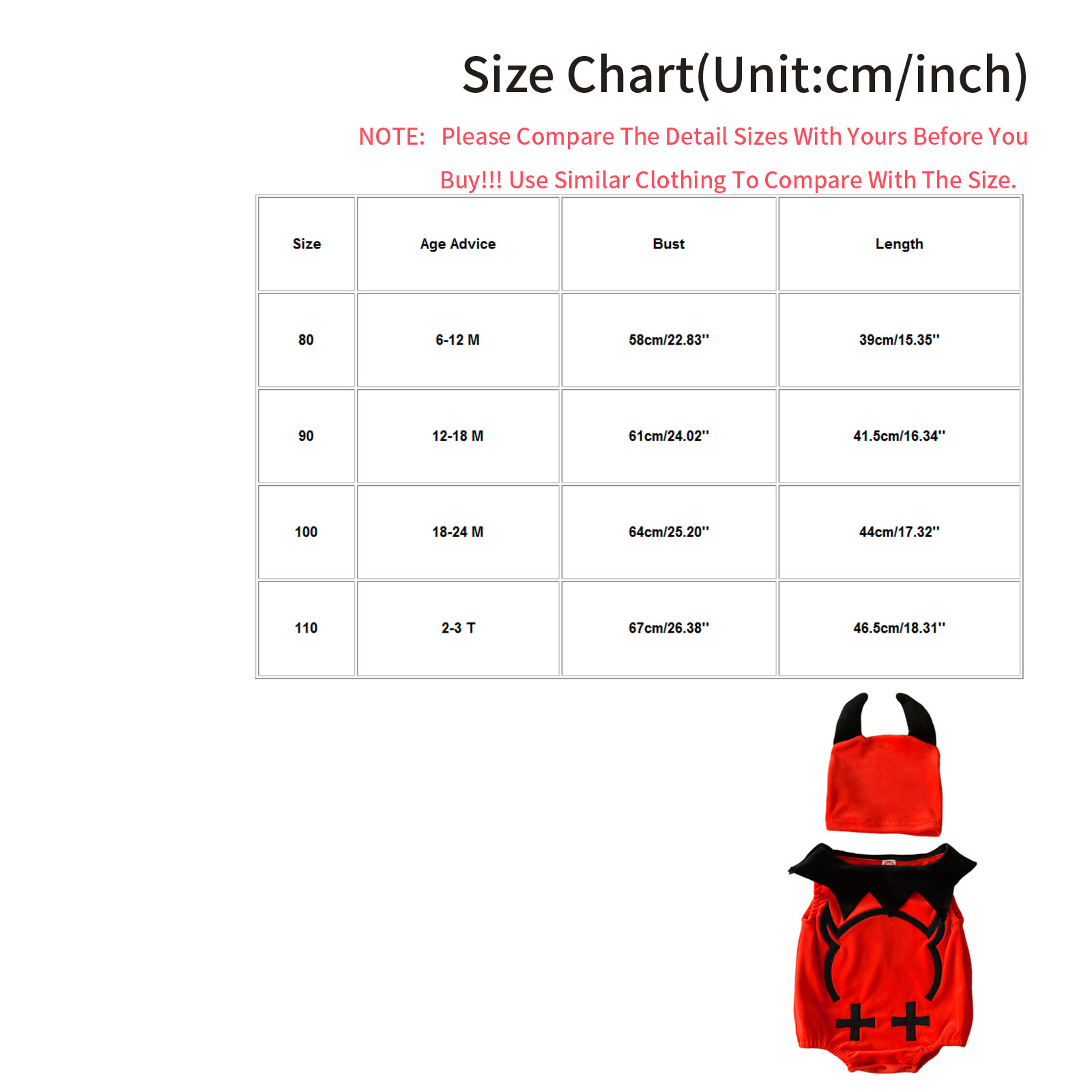 Size Age Advice Bust Length 80 6-12 M 58cm/22.83'' 39cm/15.35'' 90 12-18 M 61cm/24.02'' 41.5cm/16.34'' 100 18-24 M 64cm/25.20'' 44cm/17.32'' 110 2-3 T 67cm/26.38'' 46.5cm/18.31''