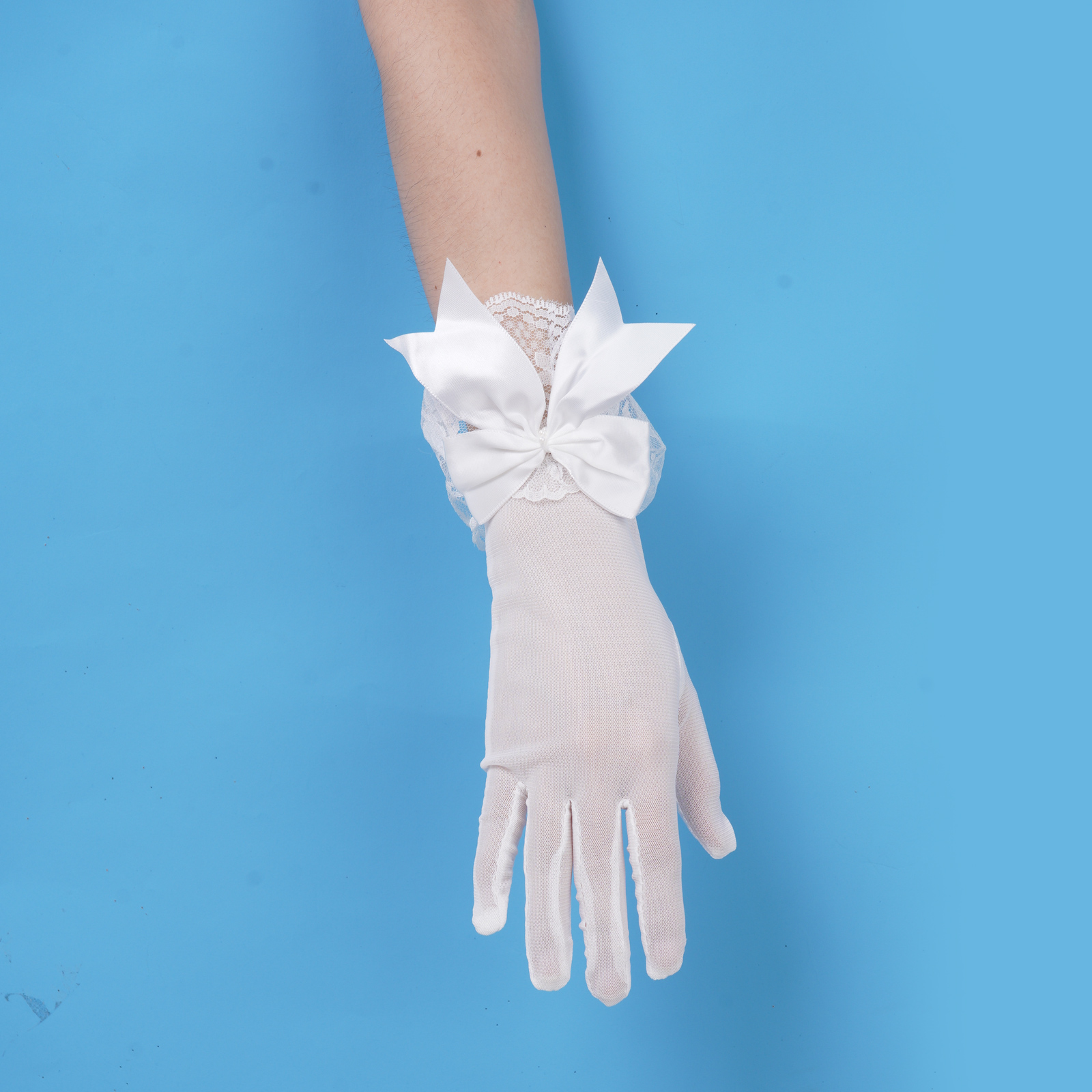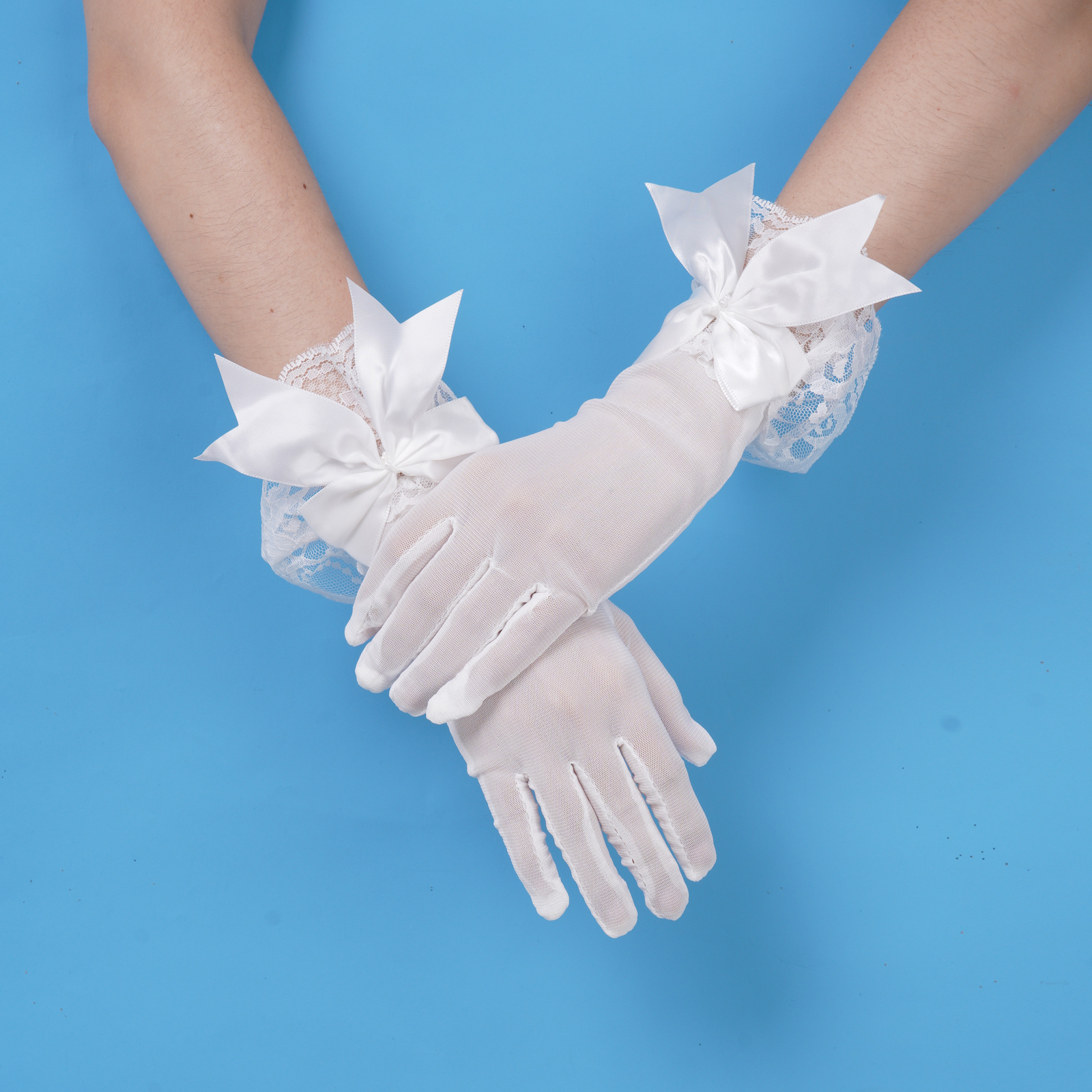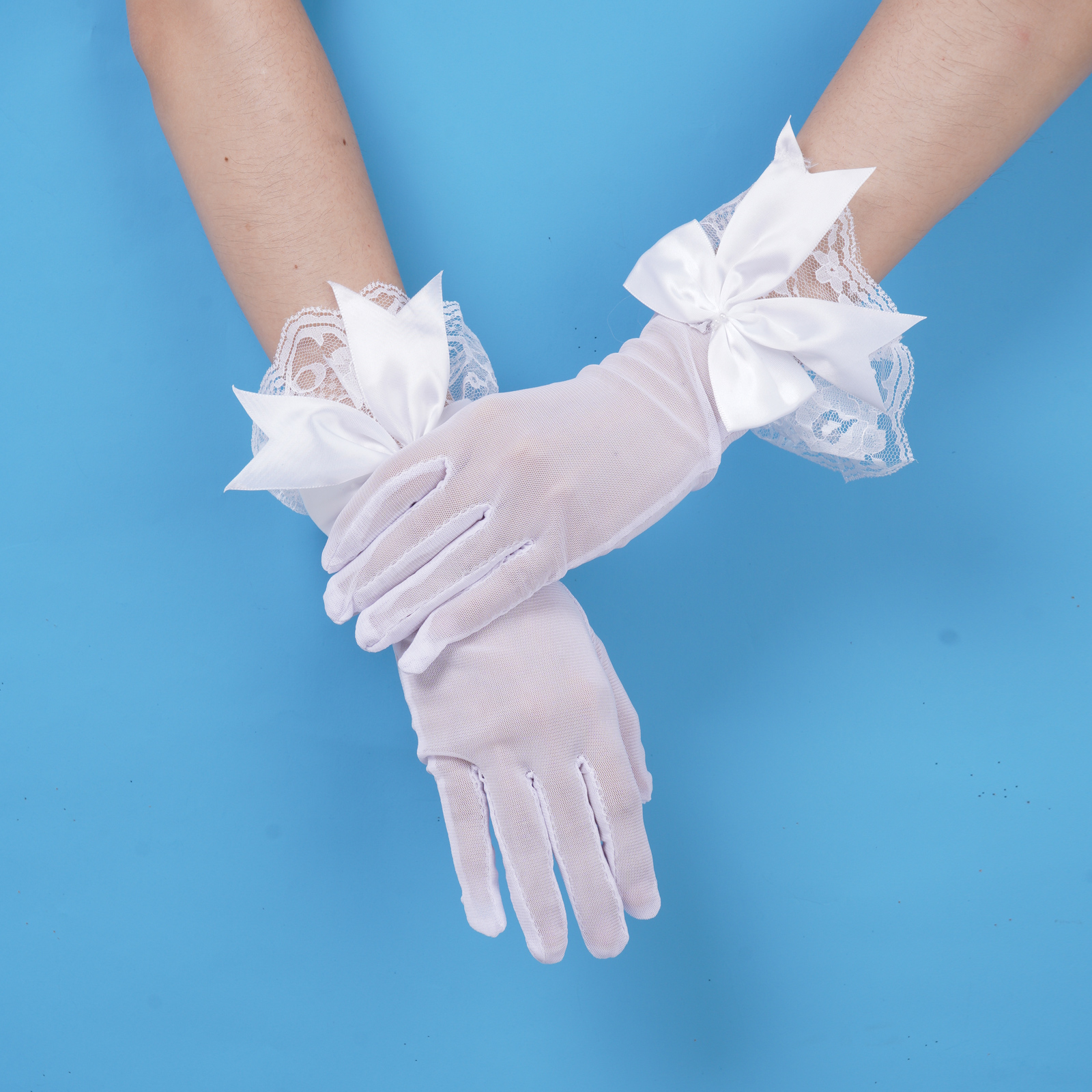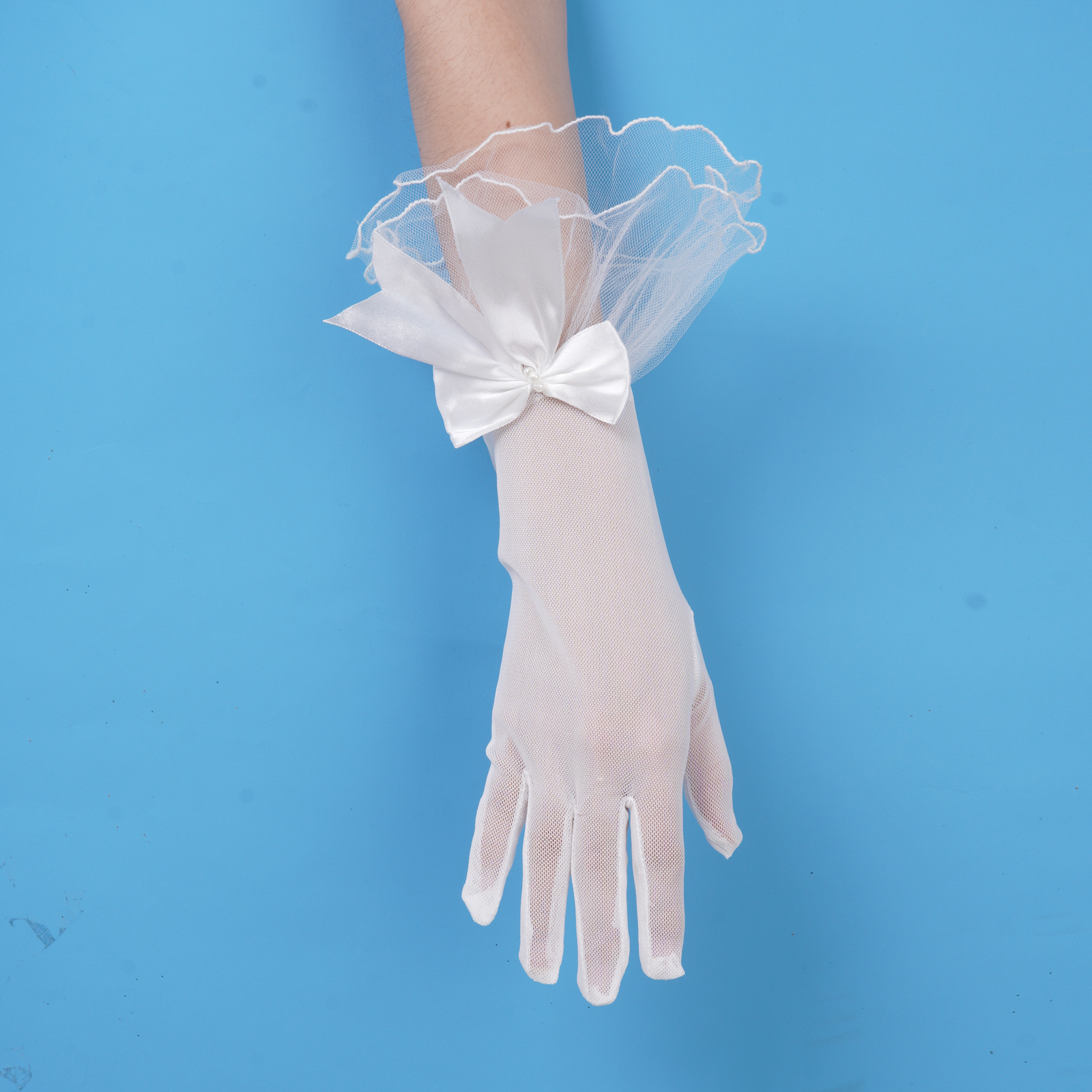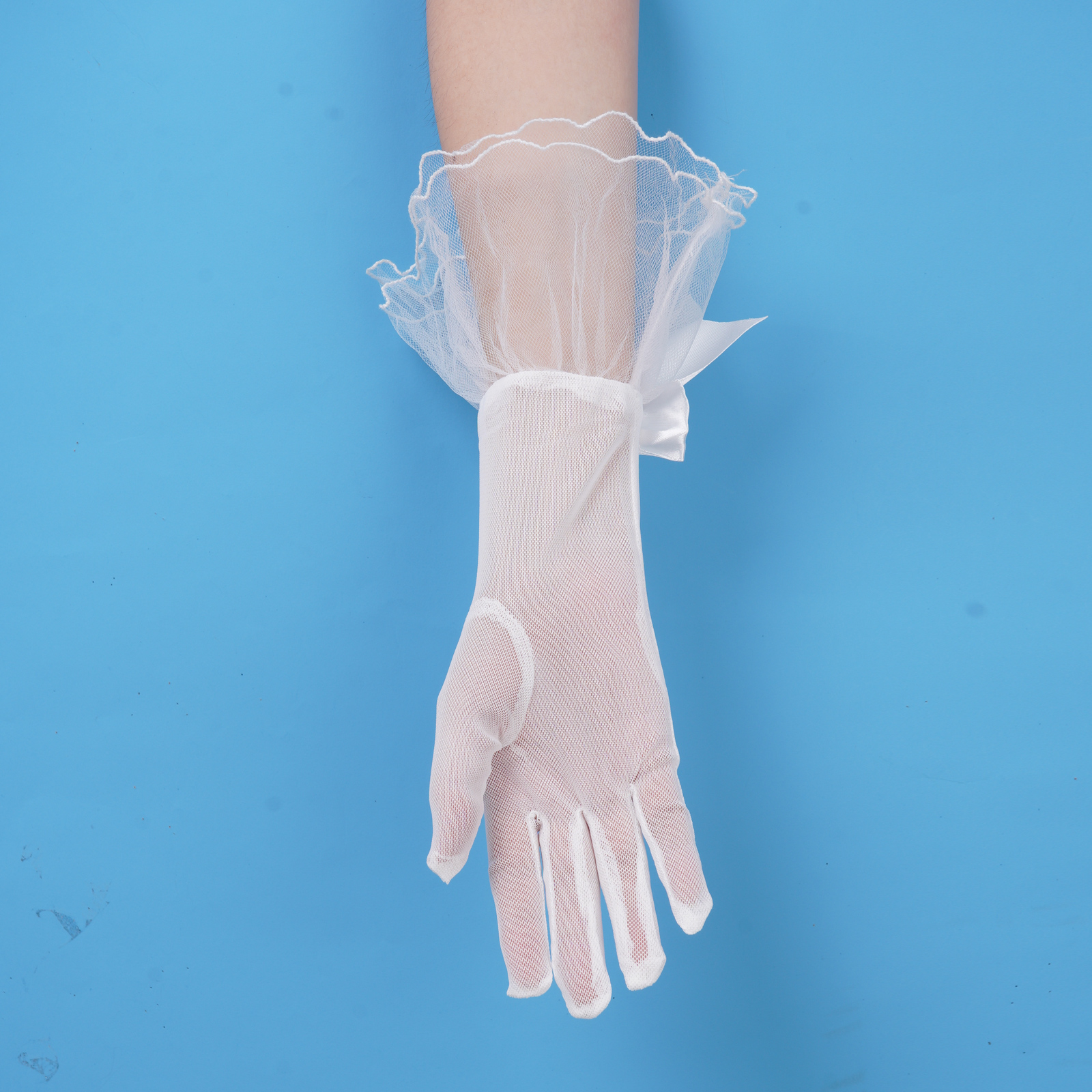 Дизайн с сеткой и цветочным кружевным узором, длина запястья, атласный бант с искусственным жемчугом и оборками на запястье придает женственность и привлекательность.