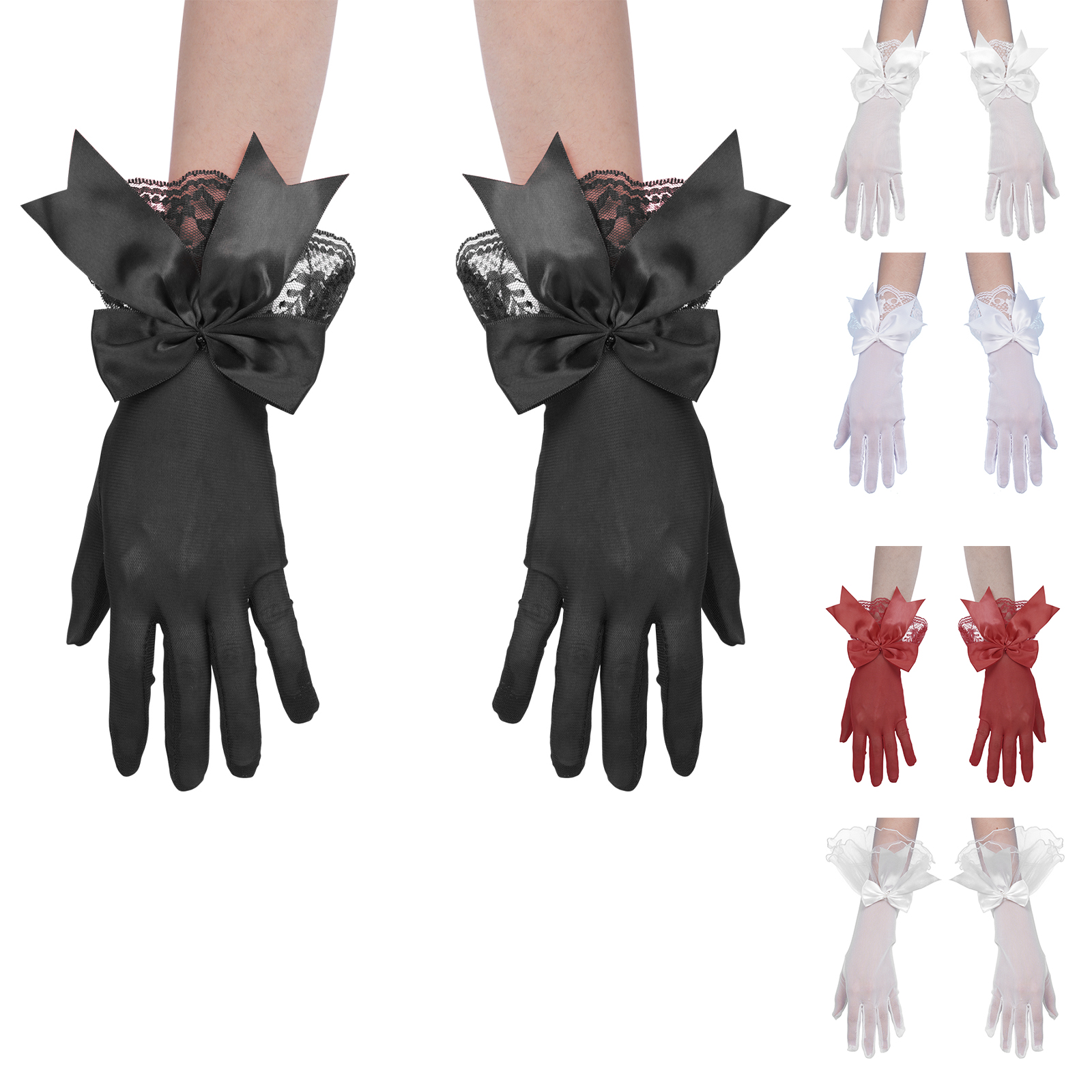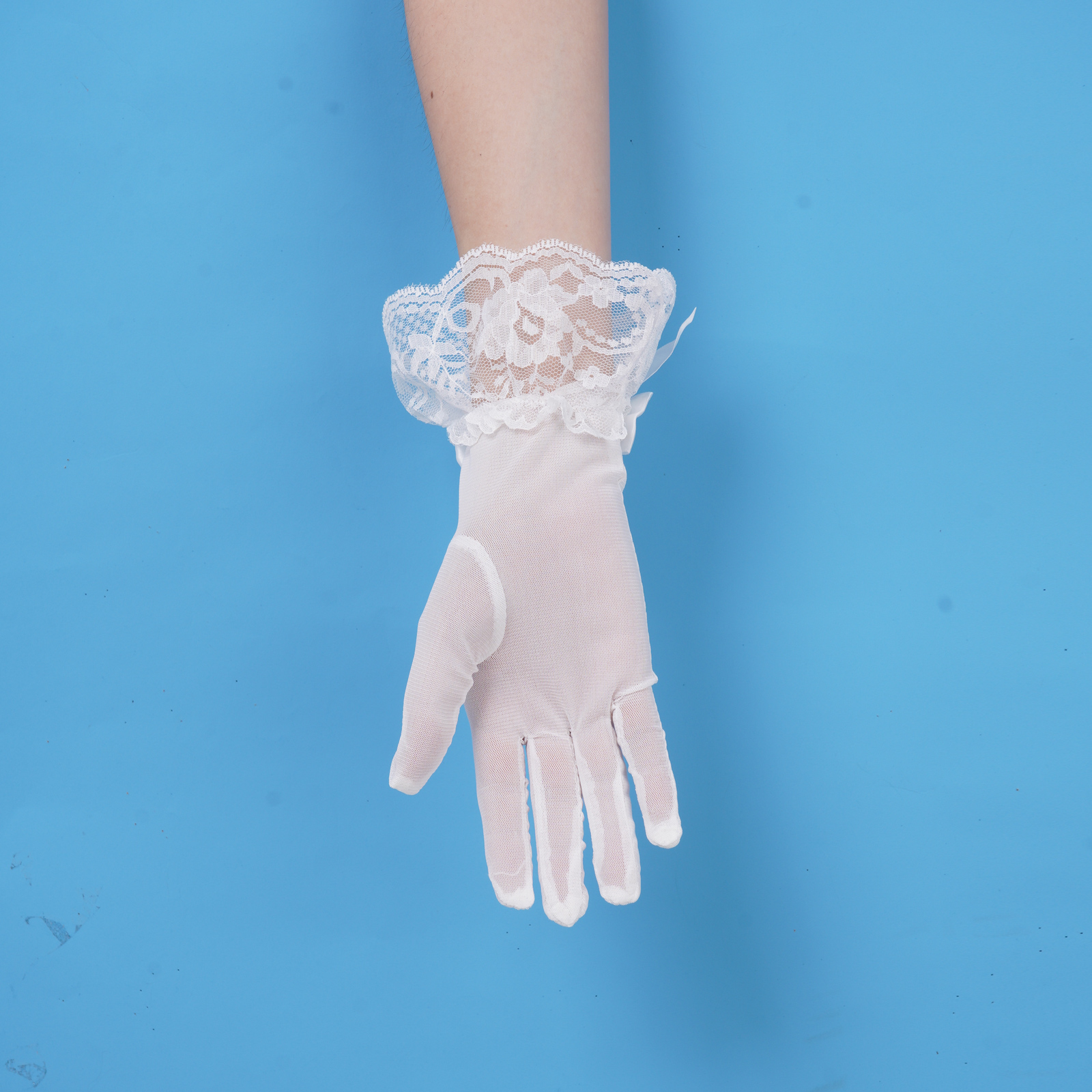 Элегантные Короткие сетчатые перчатки для женщин и девочек, длина запястья, атласные однотонные перчатки с цветочным кружевом и рюшами для свадебной вечеринки.