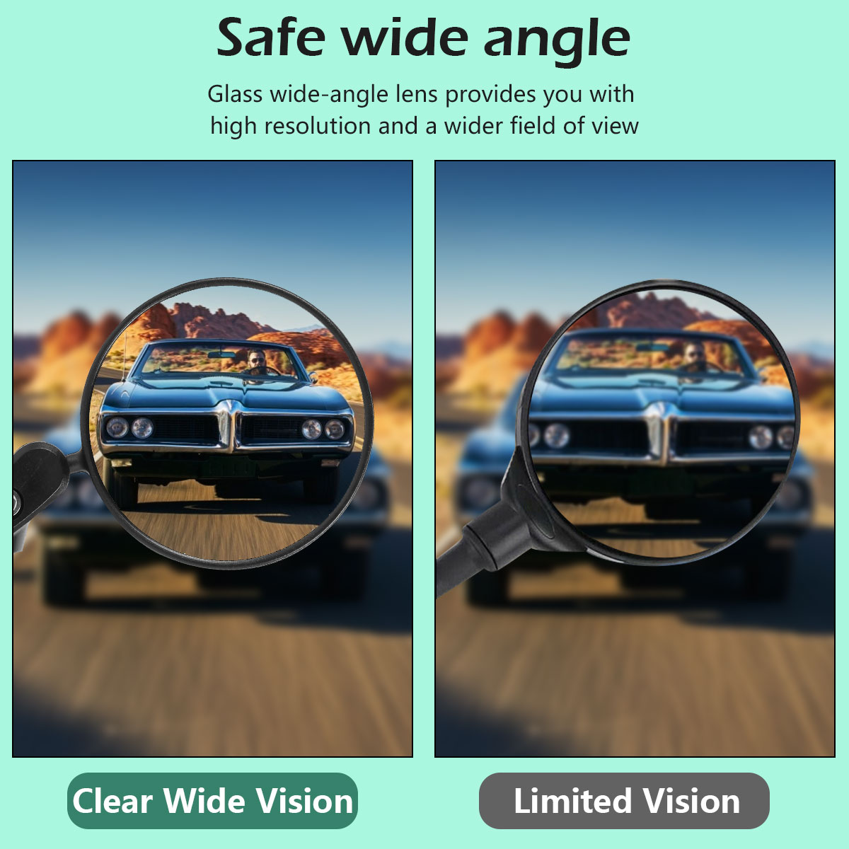 【Прочный материал и вращающийся на 360 ° 】Зеркала заднего вида для велосипеда изготовлены из корпуса линз ABS, акриловых линз и высокопрочного кронштейна для ПК, интегрированный кронштейн имеет более высокую твердость, не легко сломать и устойчив к старению. Угол обзора может регулироваться произвольно, а основание может поворачиваться на 360 °. Зеркало заднего вида для велосипеда полированное, водонепроницаемое и пыленепроницаемое.