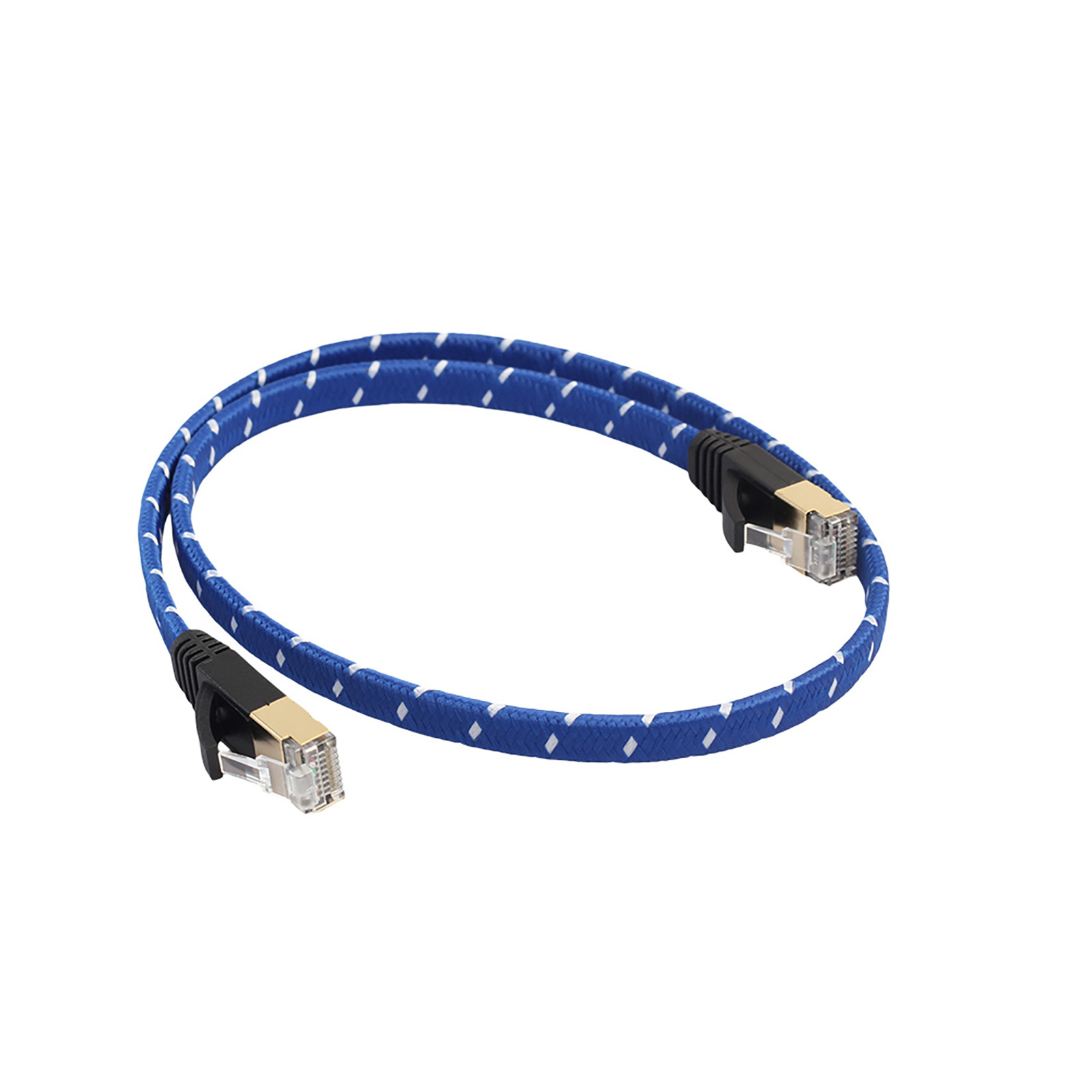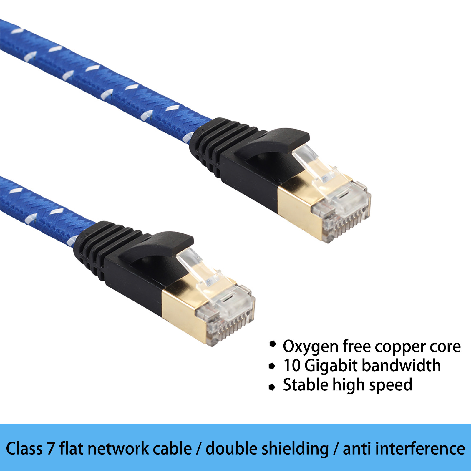 Suitable for computer and switches, hubs, ADSL, routers, modems and hubs, routers connected. metal case shield crystal head Product Type: CAT7-1 Product length: 0.5m,1m,1.8m,3m, 5m, 8m,10m,15m,20m Product Color: Blue Wire structure: eight core twisted (patented technology) Product head: metal case shield crystal head Product Wire Gauge: 30AWG Sheath material: imports of environmentally friendly PVC (PVC) + woven network Insulation material: high density polyethylene HDPE Conductor material: oxygen-free copper (purity 99.99%), stranded strand Wiping Sheath: Polyvinyl Chloride (PVC) Number of plugs: ≥1000 times Scope: computer and switches, hubs, ADSL, routers, modems and hubs, routers connected.Specifications: