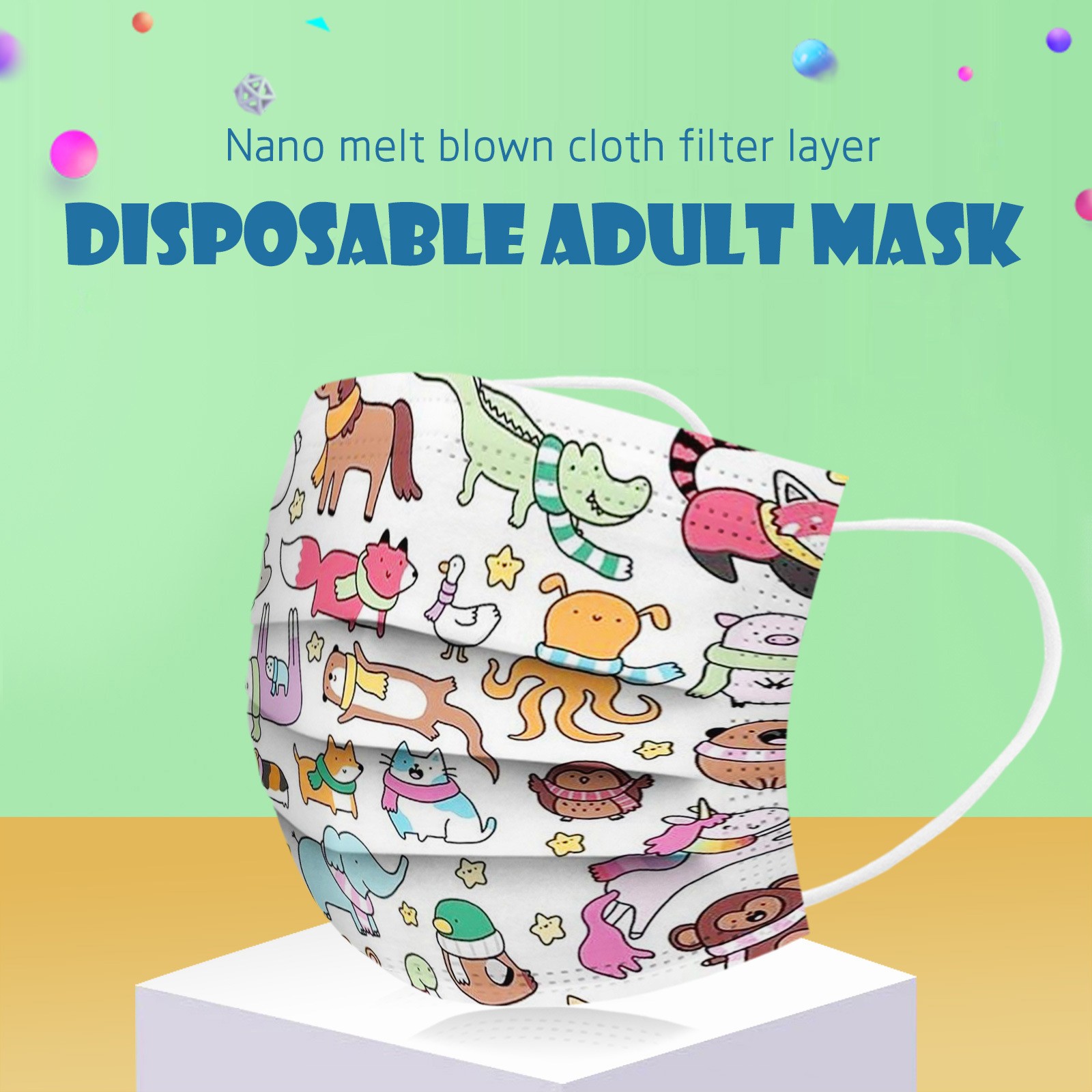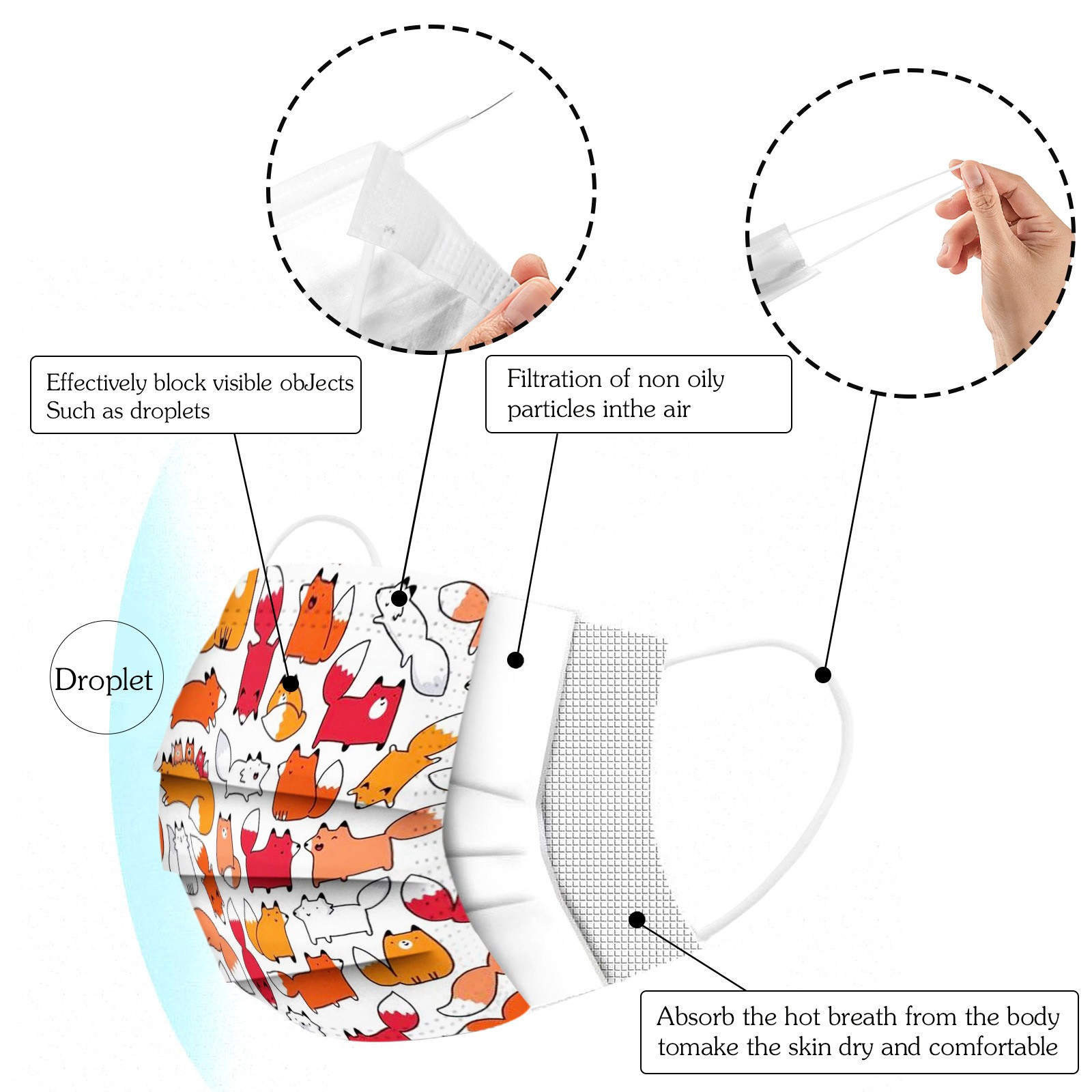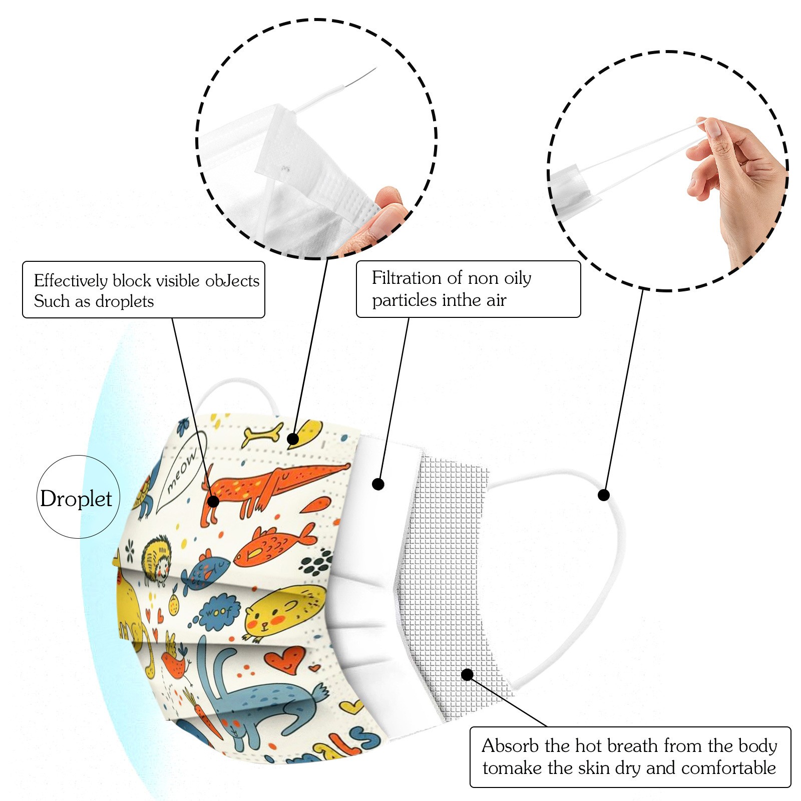 3 слоя мелтблаун ткани одноразовые маски, он безопасен для здоровья и безопасный для вас, чтобы использовать. Дышащий материал и милые узоры, что делает его полезным и модным. СпециальныйРасплавленная тканьДизайн, обеспечивает некоторую защиту от автомобильных выхлопных газов, пыльцы и т. д. эластичная петля для ушей, легко носить и не давит на уши. Маникюрный салон или любые другие области, где может потребоваться защита