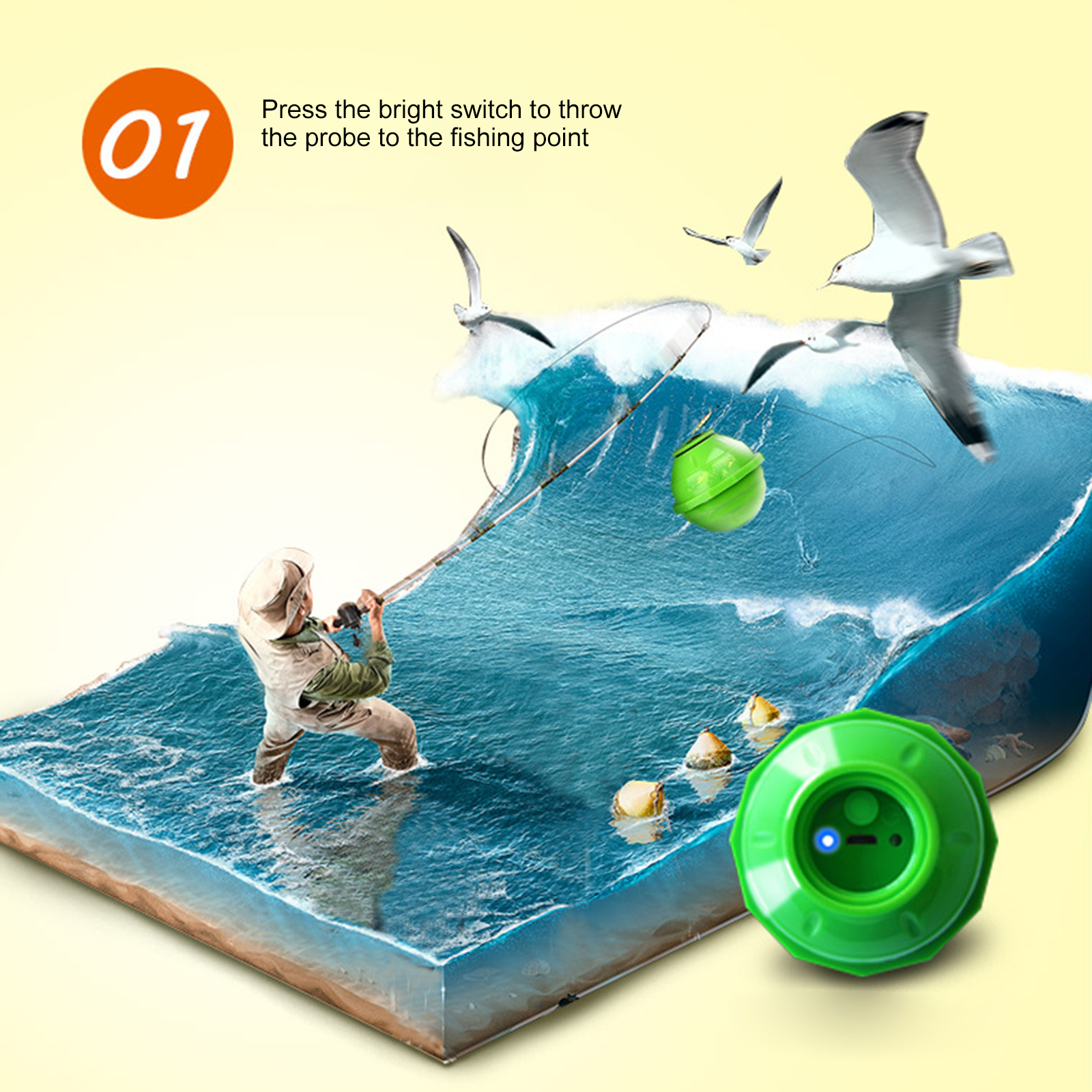 2. Нажмите, чтобы сделать светильник переключателя вверх, чтобы бросить зонд в точку рыбалки, отсканировать положение рыбной школы и передавать данные обнаружения на мобильный телефон или планшет в режиме реального времени
