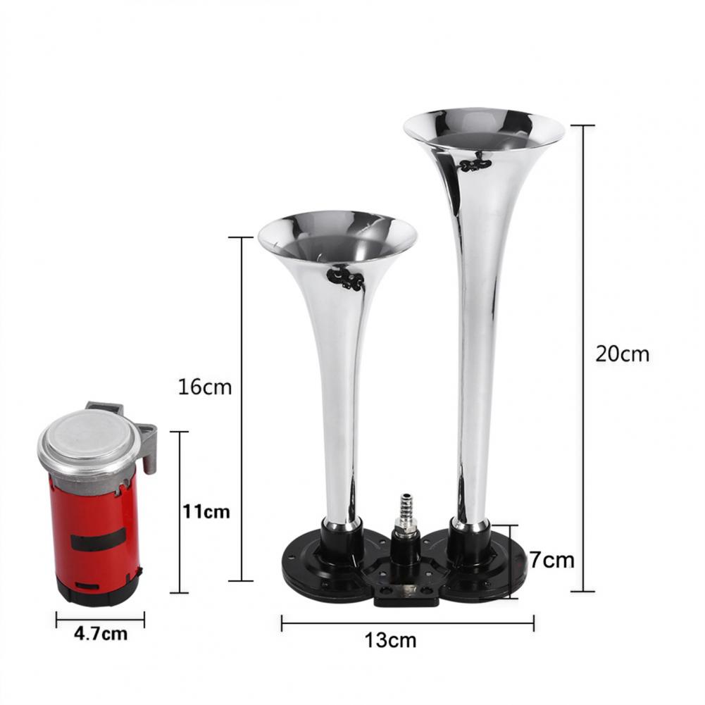 Длина этого воздушного рога составляет 20 см, ширина-13 см, а высота-7 см. Длина короткого рога 16 см, длинного рога 20 см. Длина компрессор работает на высоком каблуке 11 см, а ширина 4,7 см. Длина поддержка 15,3 см, а ширина 8,5 см.