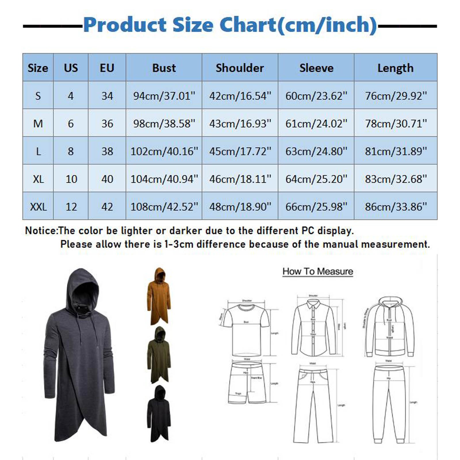 Please allow 1-3cm differs due to manual measurement, thanks (All measurement in cm and please note 1cm=0.39inch)Size US EU Bust Shoulder Sleeve Length S 4 34 94cm/37.01'' 42cm/16.54'' 60cm/23.62'' 76cm/29.92'' M 6 36 98cm/38.58'' 43cm/16.93'' 61cm/24.02'' 78cm/30.71'' L 8 38 102cm/40.16'' 45cm/17.72'' 63cm/24.80'' 81cm/31.89'' XL 10 40 104cm/40.94'' 46cm/18.11'' 64cm/25.20'' 83cm/32.68'' XXL 12 42 108cm/42.52'' 48cm/18.90'' 66cm/25.98'' 86cm/33.86''