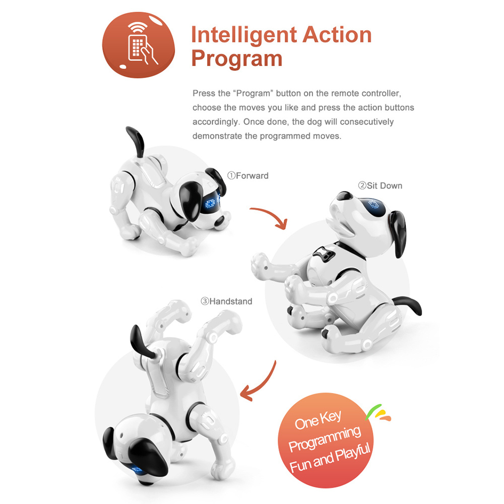 8. Интеллектуальное Программирование действий: через пульт дистанционного управления, нажмите кнопку программирования и нажмите несколько желаемых кнопок действий; После завершения щенок может осуществлять несколько действий непрерывно.