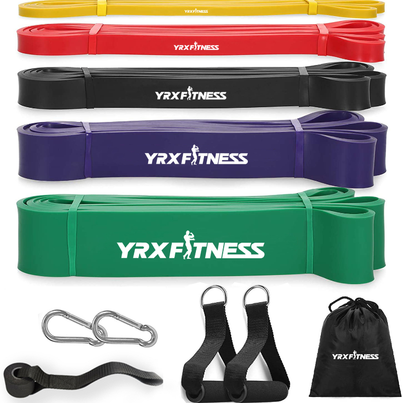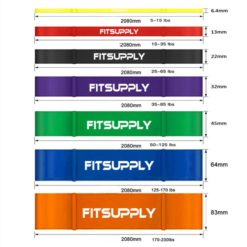 Каждая полоса с различными цветами и четко отмечена диапазоном натяжения: желтый 8-15LBS, красный 15-30LBS, черный 25-65LBS, фиолетовый 35-85LBS, зеленый 50-125LBS.