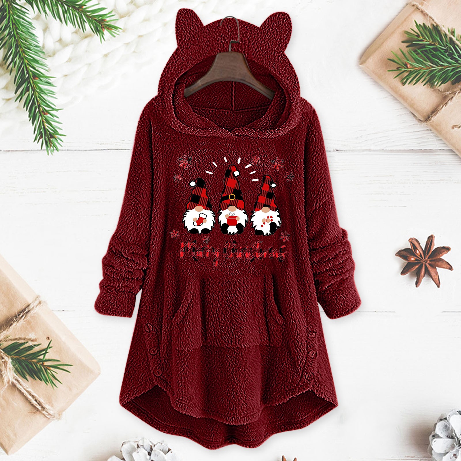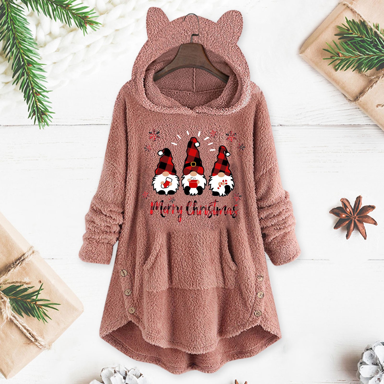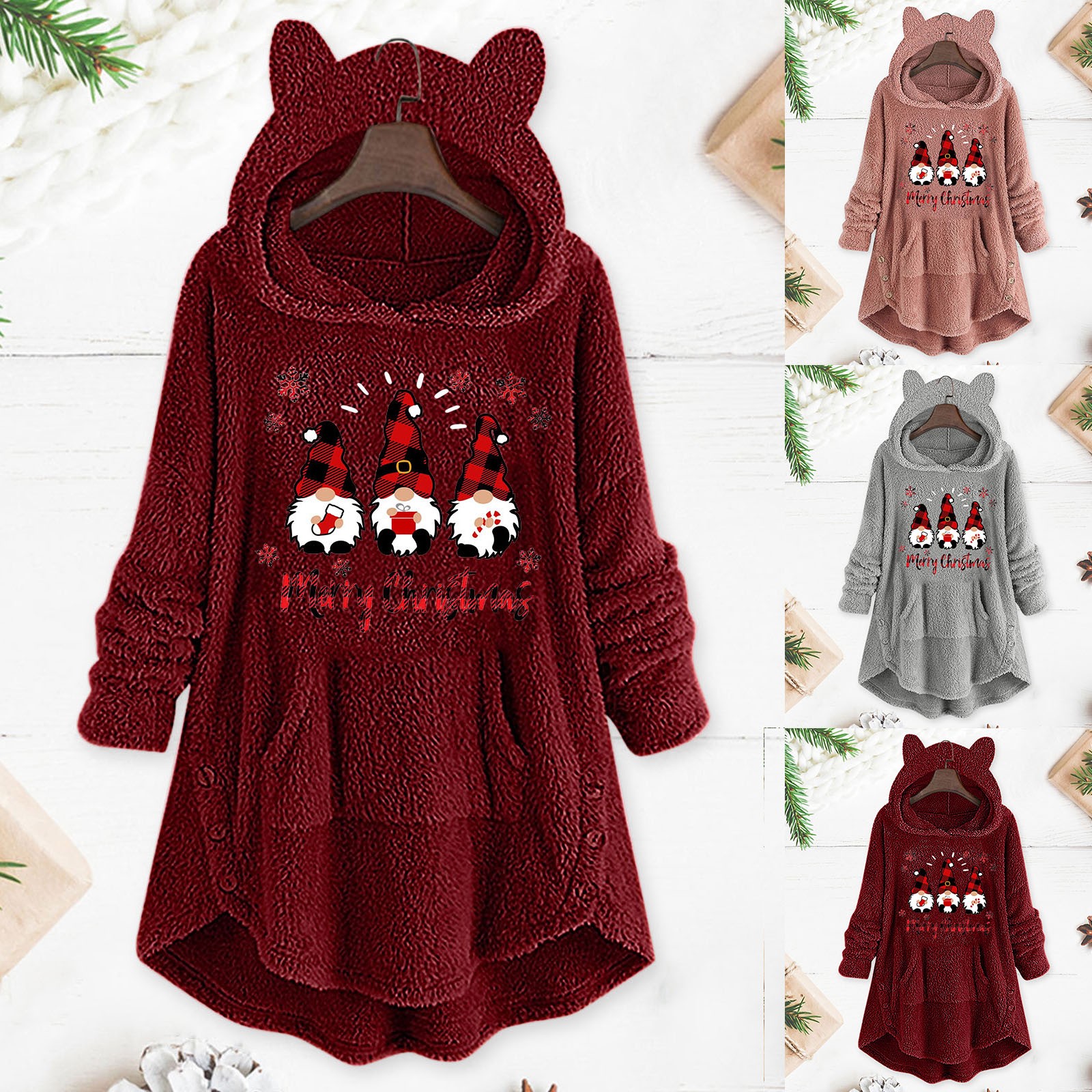Милые Рождественские толстовки с принтом гнома, женские пуловеры с капюшоном в виде кота, зимние теплые флисовые Свободные толстовки с карманом