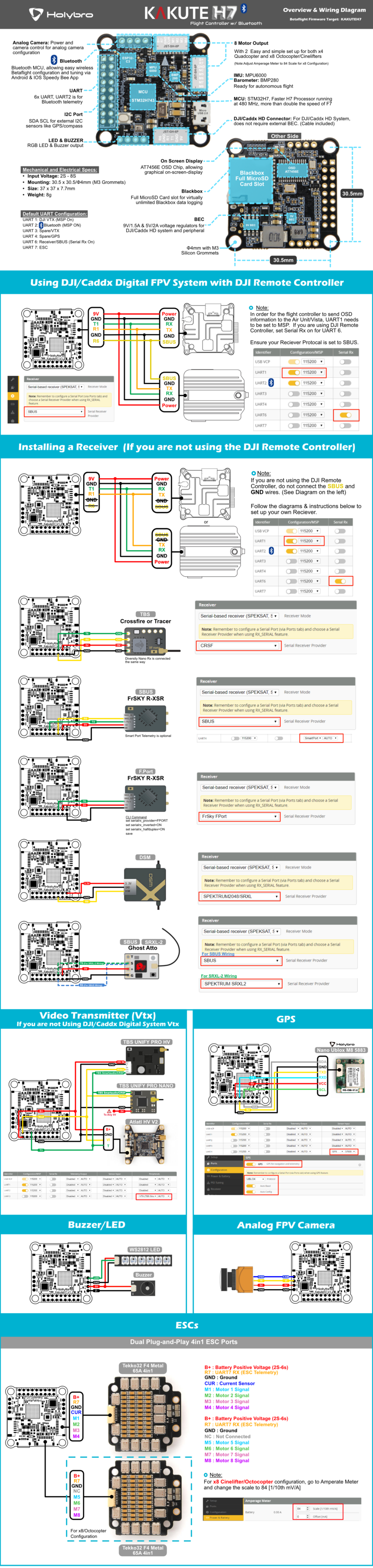 Контроллер полета Holybro Kakute H7 полон функций, включая интегрированный Bluetooth, двойной разъем и воспроизведение 4в1 ESC порты, разъем камеры HD, барометр, OSD, 6x UARTs, полный черный ящик Слот для Карт MicroSD, 5 В и 9 В BEC, легкая Пайка и многое другое.