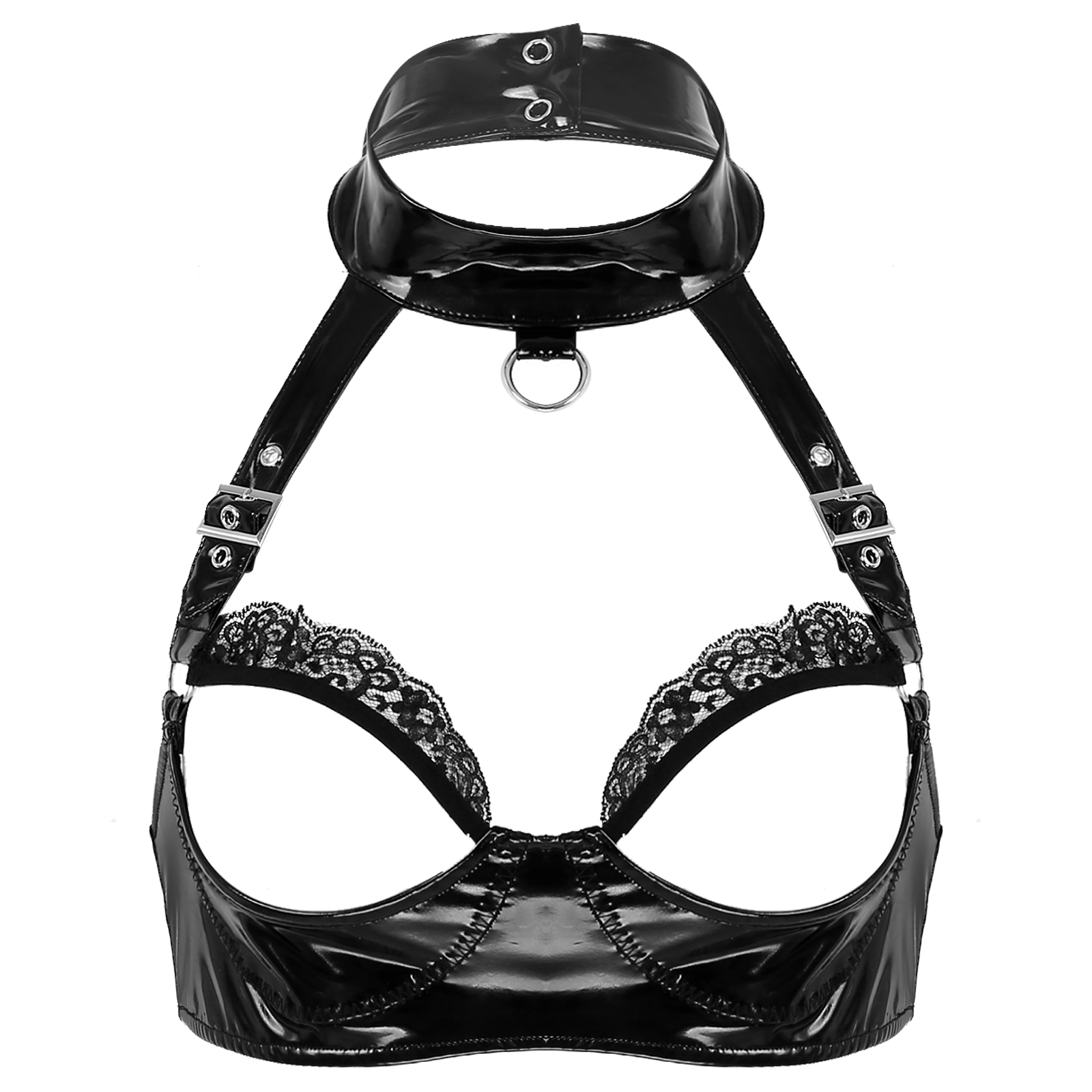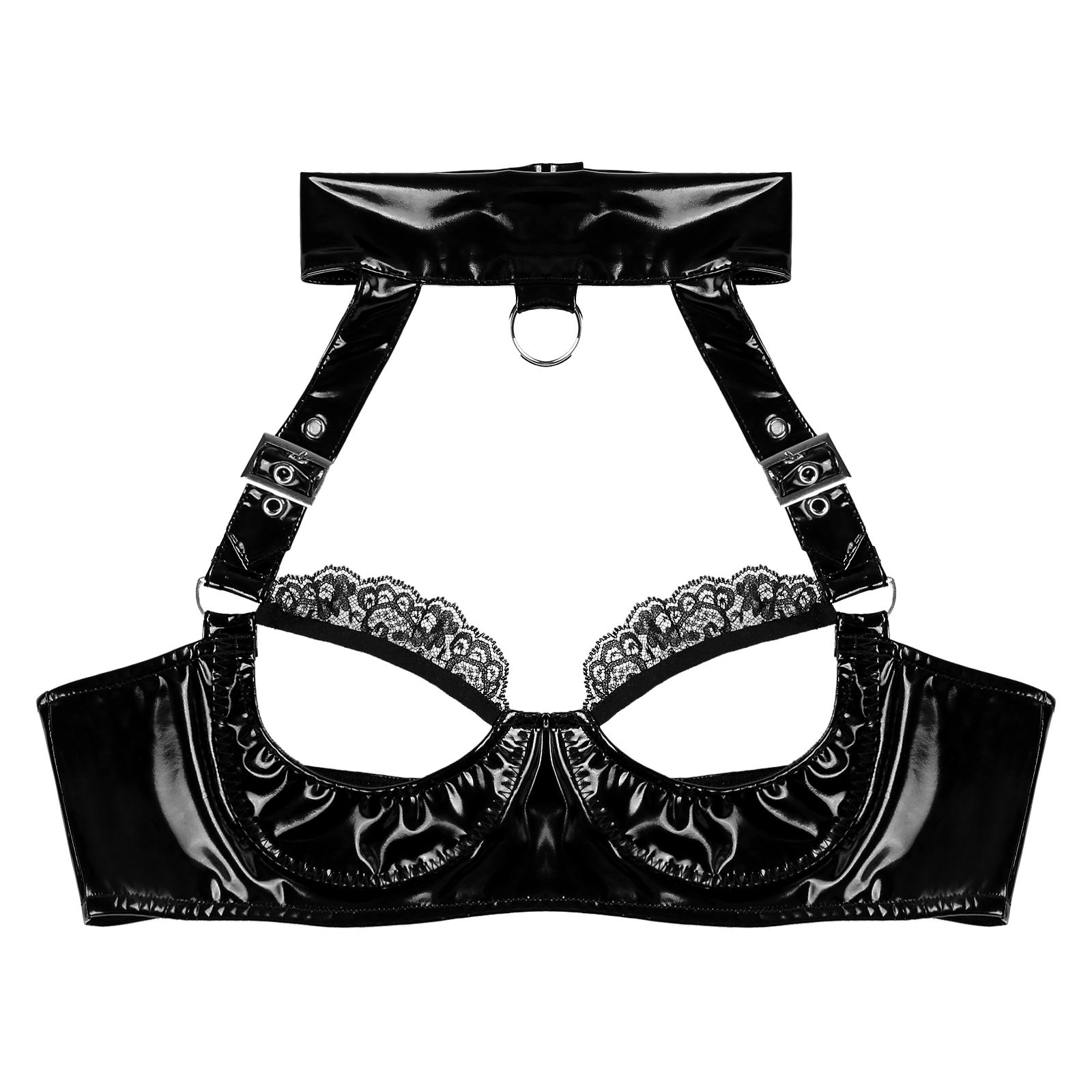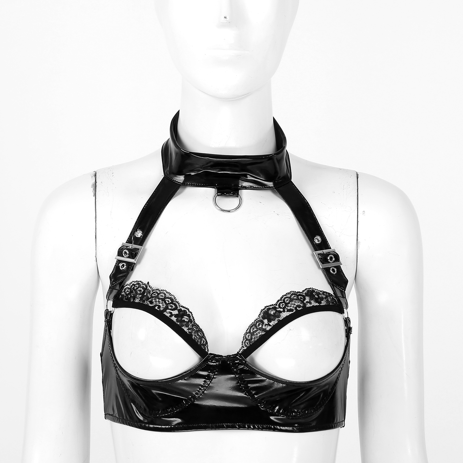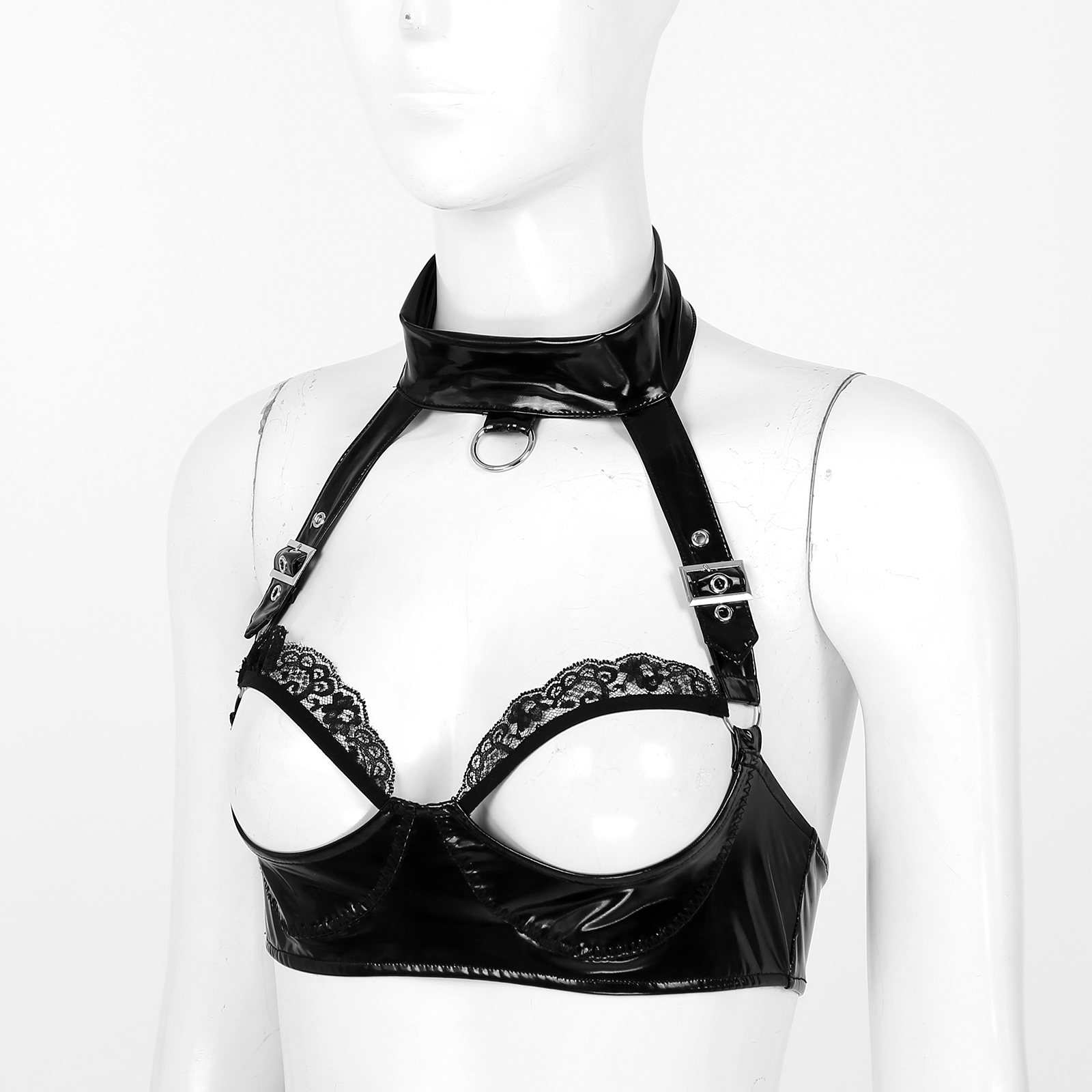 Женский кружевной бюстгальтер из лакированной кожи с вырезами на шее.