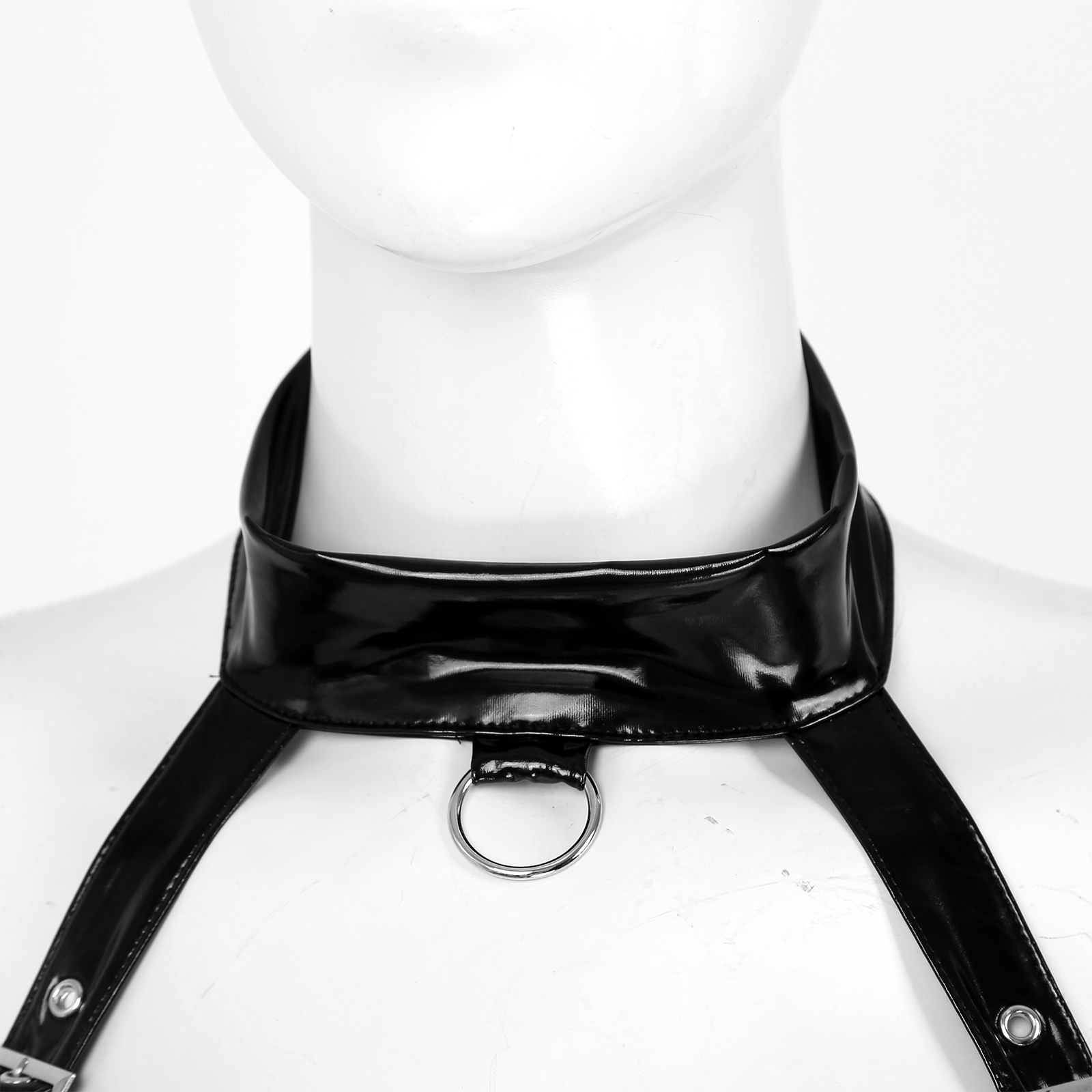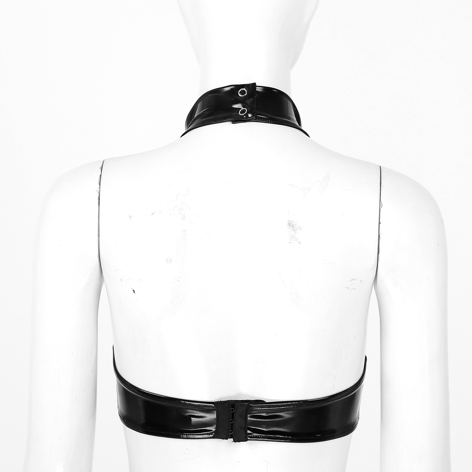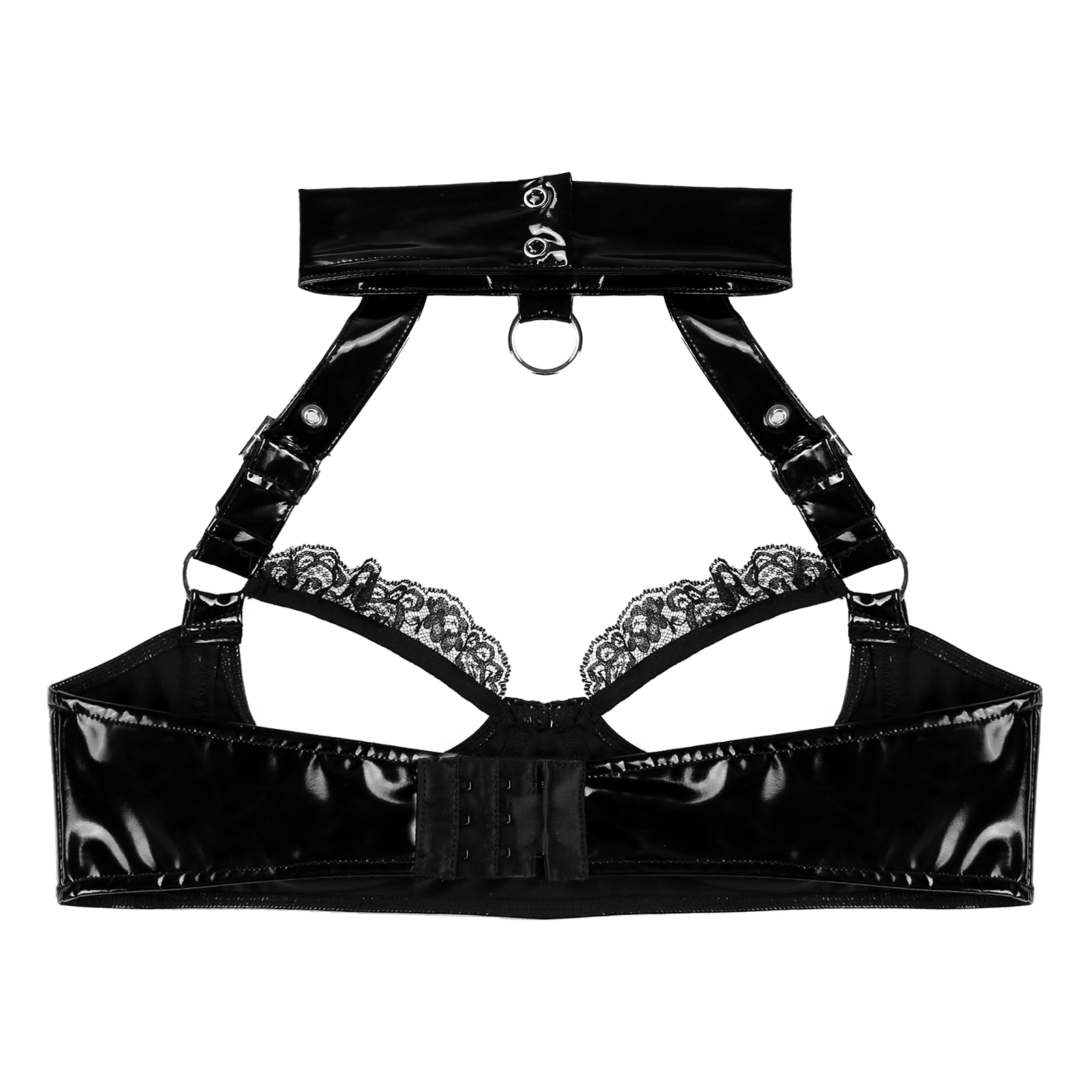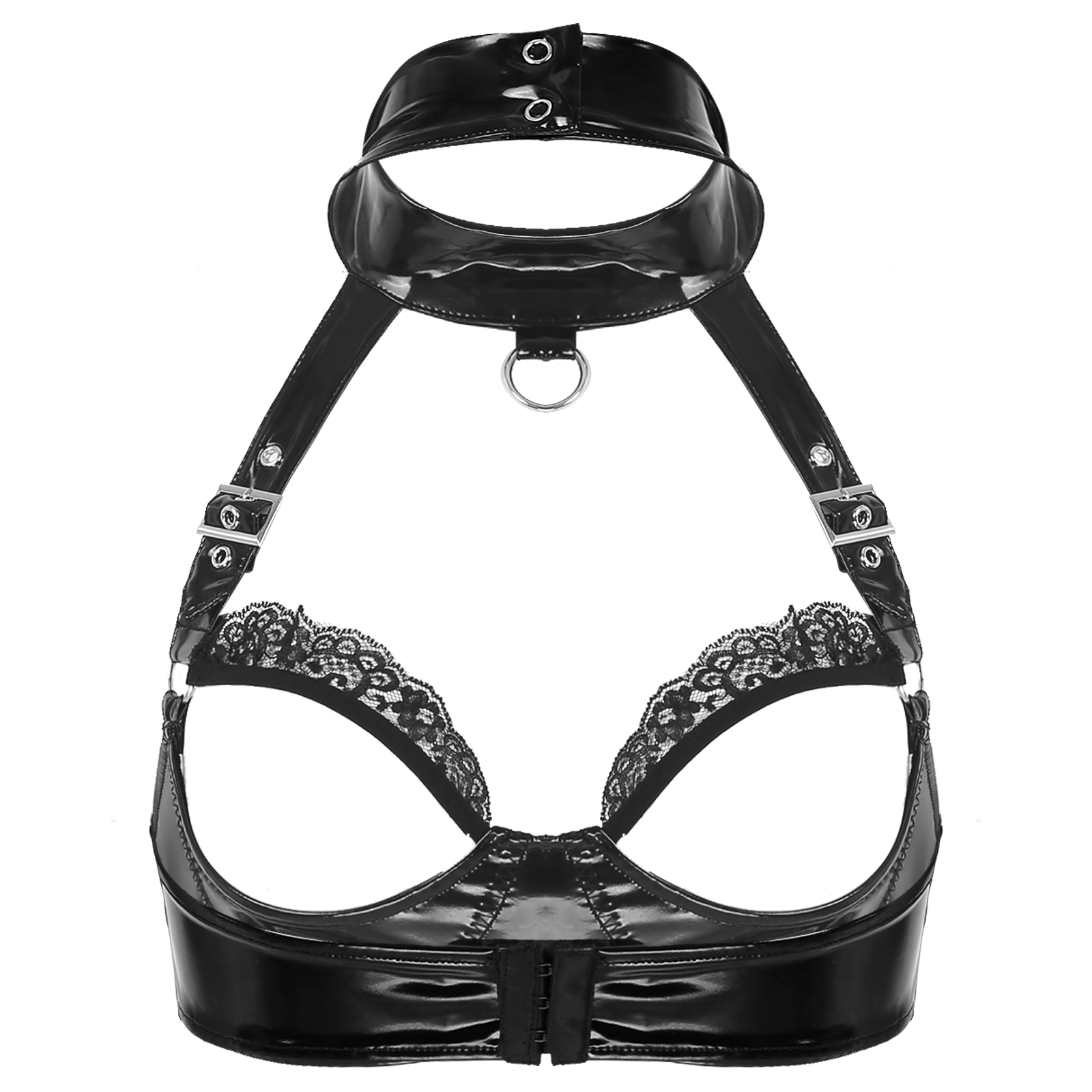 Женский кружевной бюстгальтер из лакированной кожи с вырезами на шее.