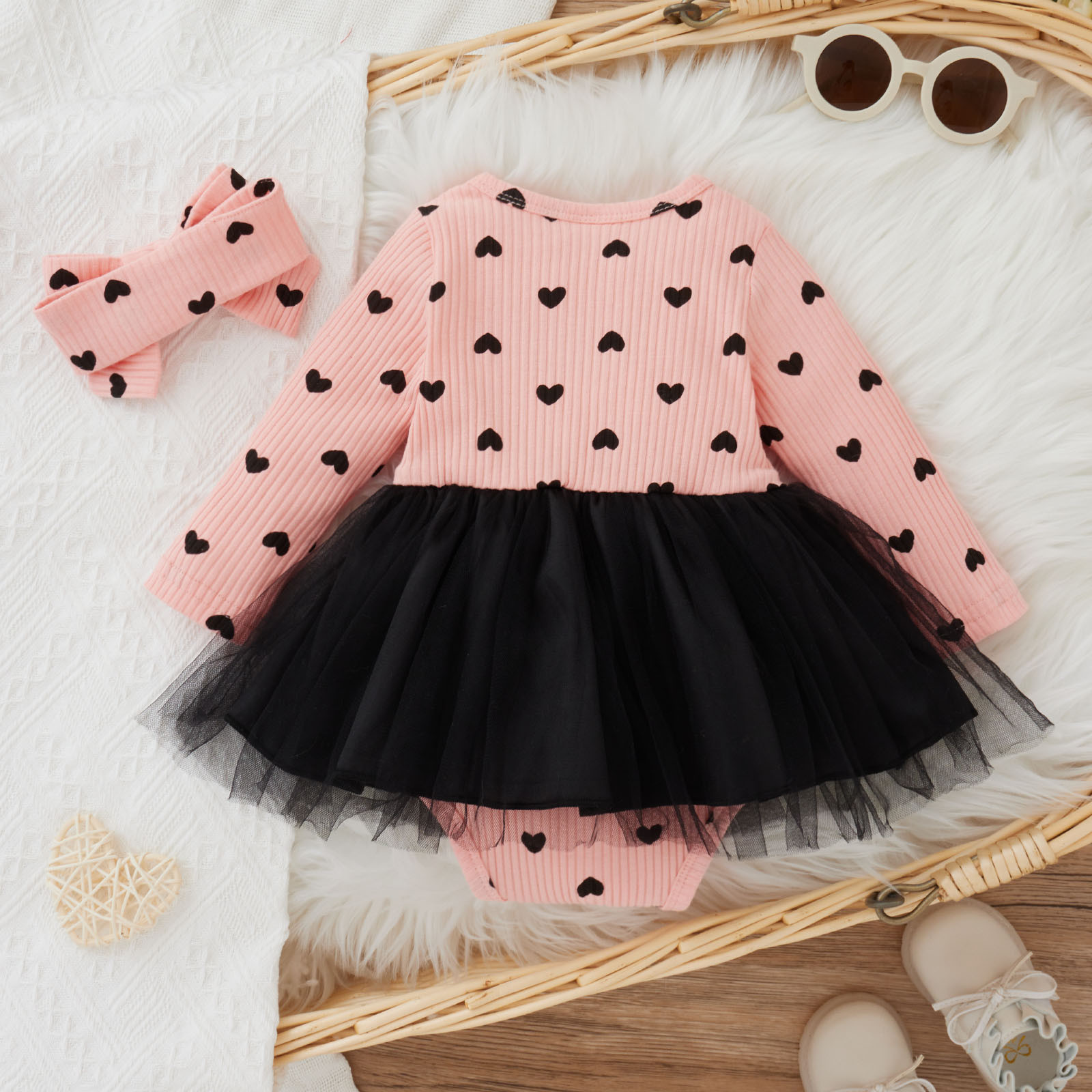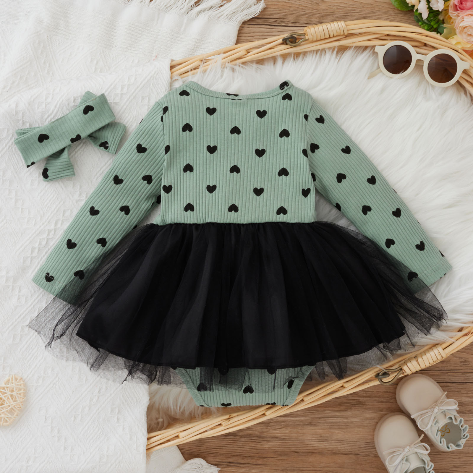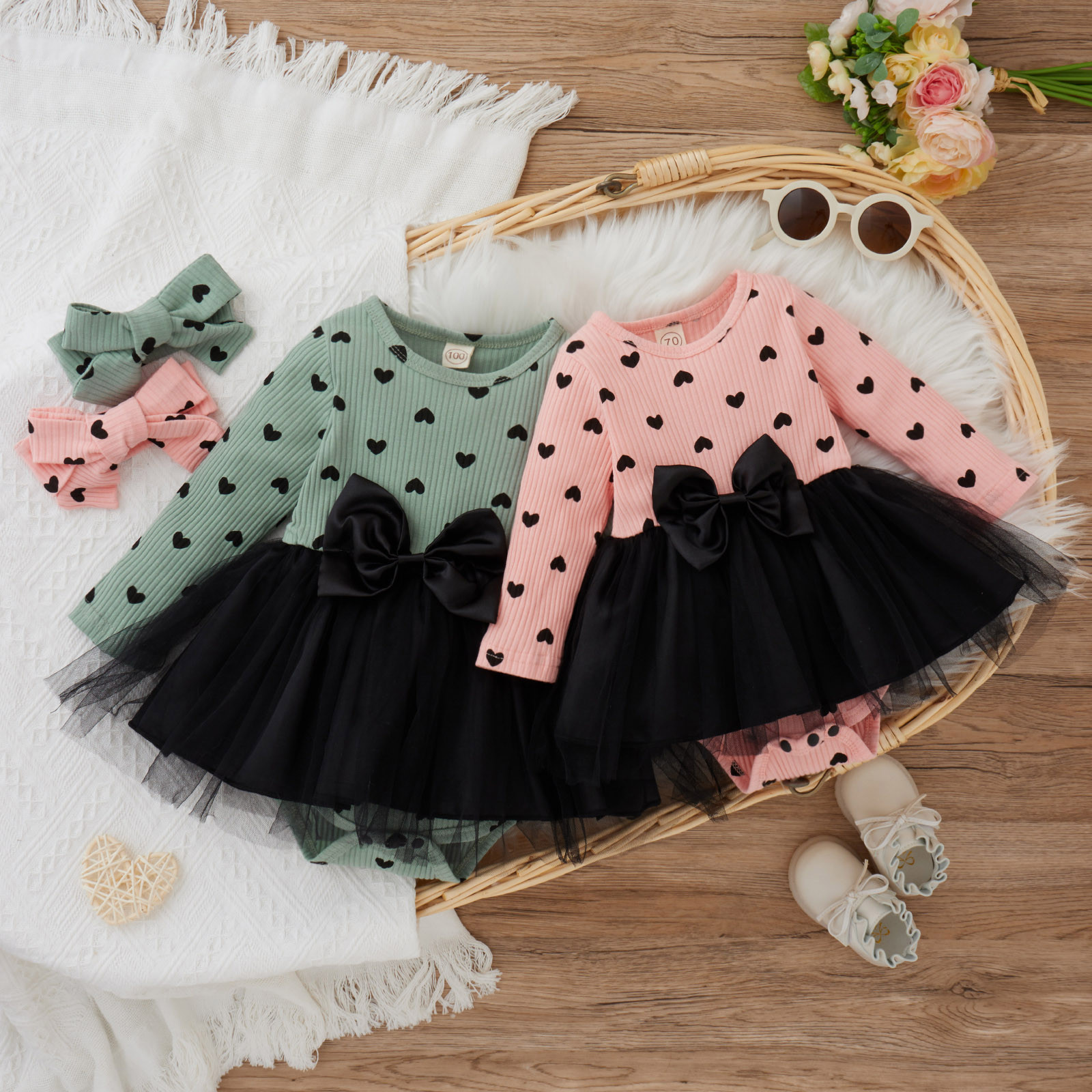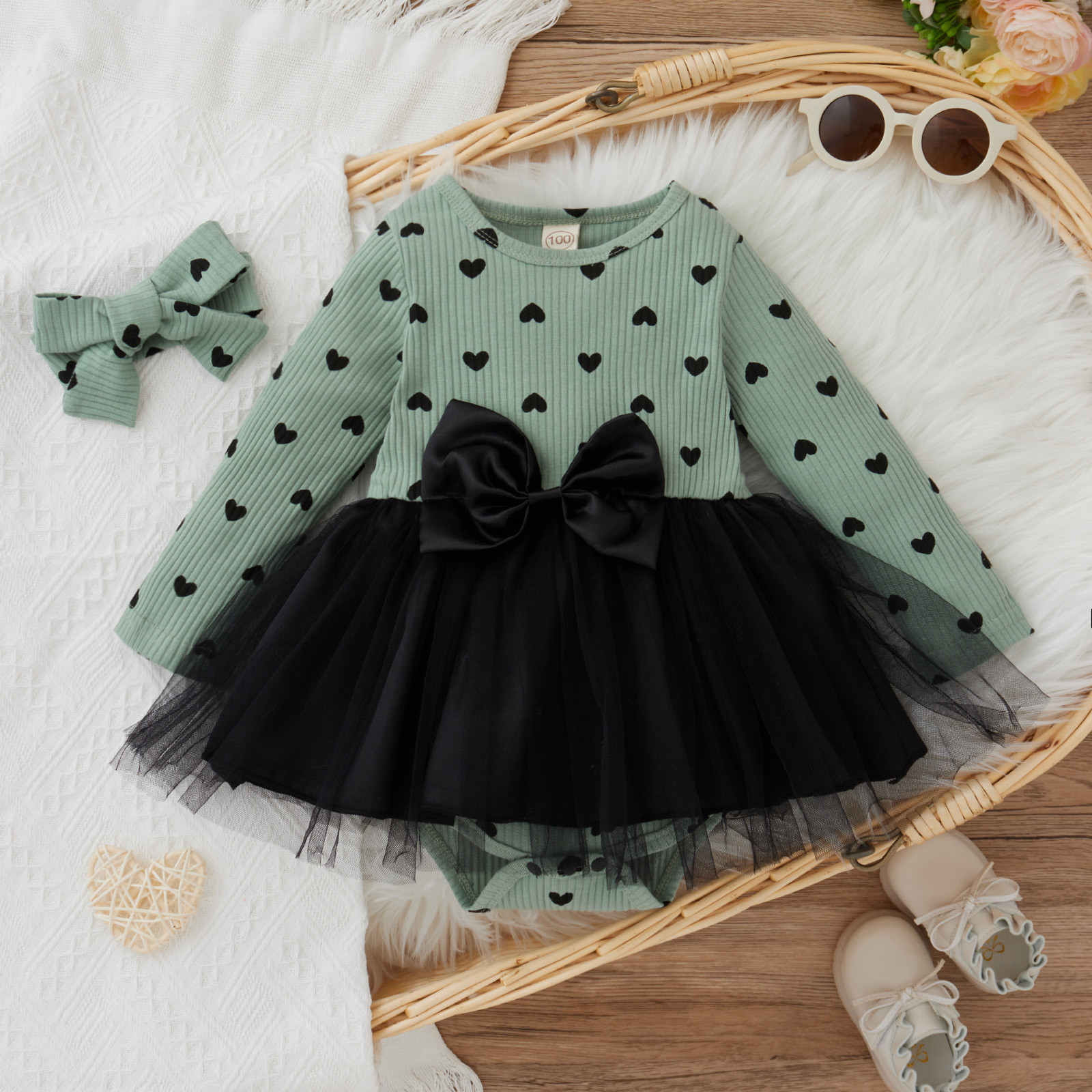 Детское фатиновое платье-боди с длинными рукавами и принтом в виде сердечек и бантом для маленьких девочек; Комбинезон с повязкой на голову