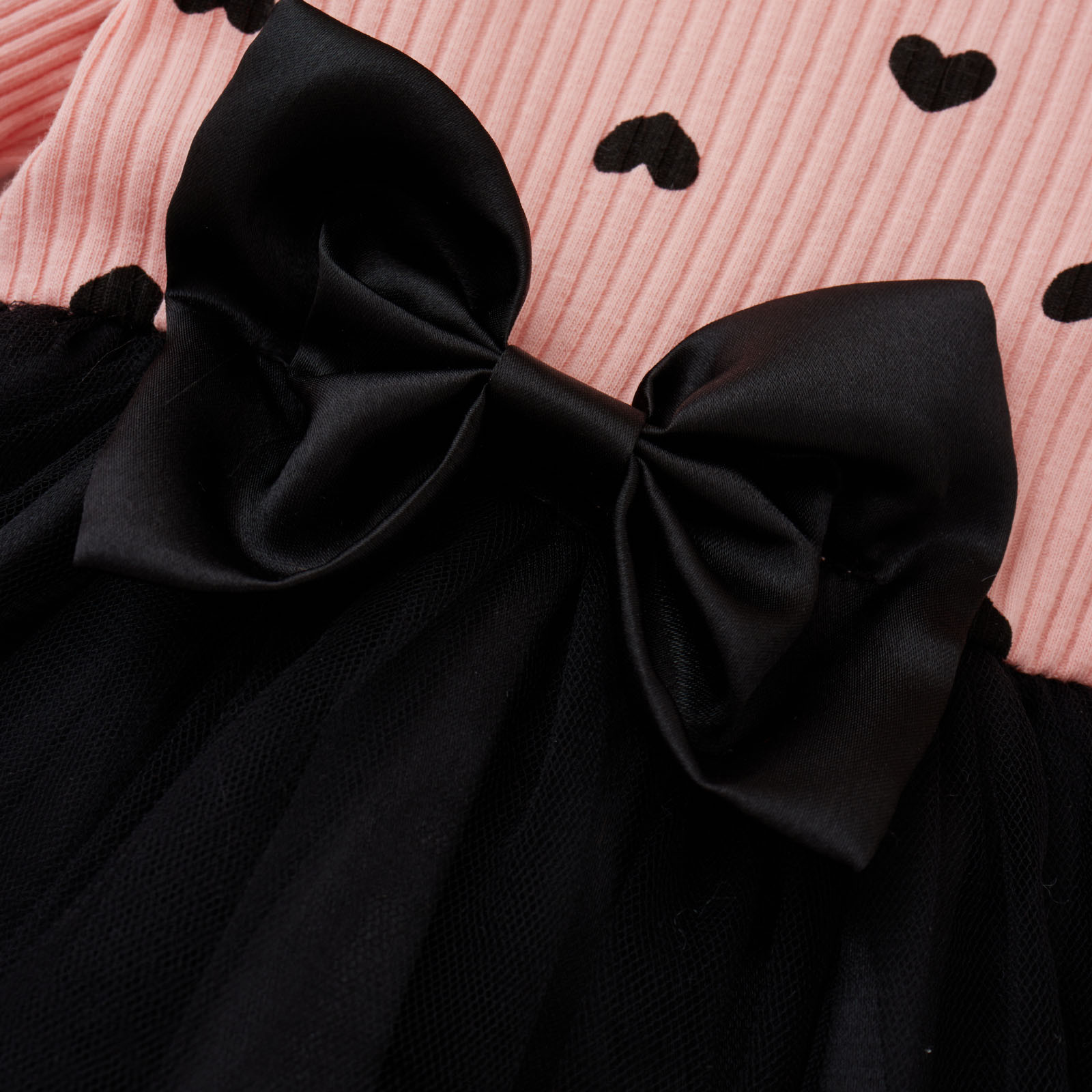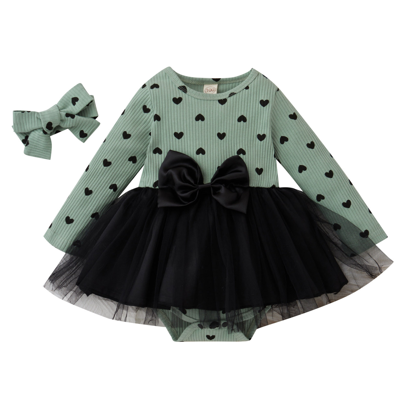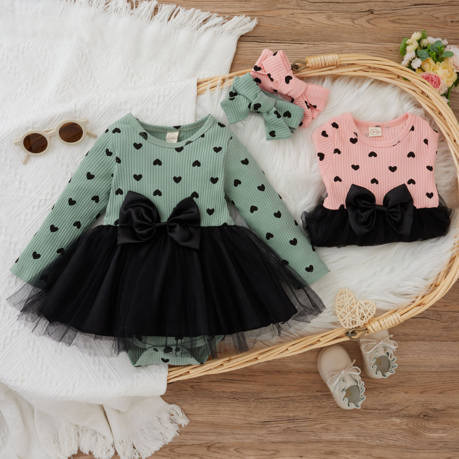 Детское фатиновое платье-боди с длинными рукавами и принтом в виде сердечек и бантом для маленьких девочек; Комбинезон с повязкой на голову