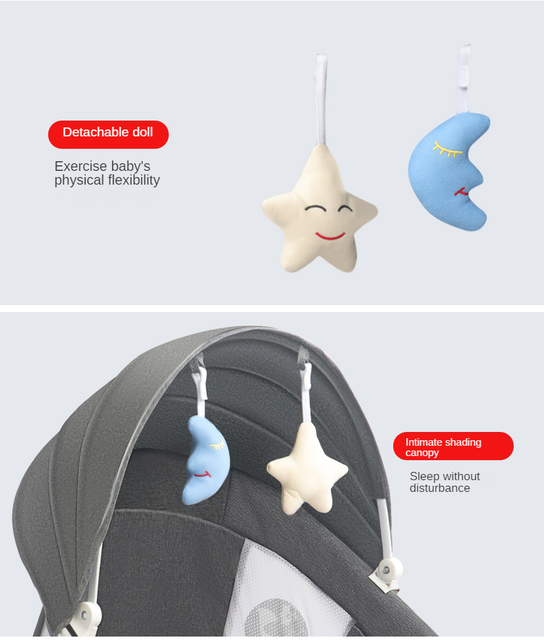 Включает в себя 2 висящие мягкие игрушки, которые позволят Вашему ребенку играть счастливо. Кроме того, расширенный 5-ти точечные ремни безопасности и анти-москитные сетки может держать ваши дети безопасным и защищенным.
