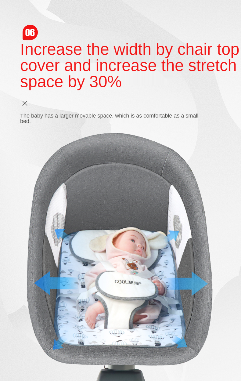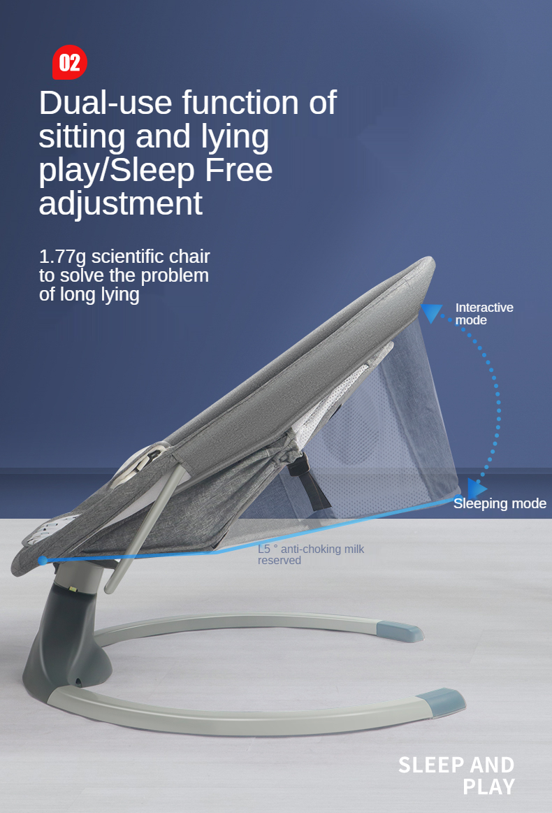 Имитируйте естественные горизонтальные качели родителей на пяти различных скоростях. Конструкция «Два в одном» преобразуется из сиденья-качалки в вибрирующее сиденье. 175 ° режим лежа, 145 ° интерактивный режим, ребенок более удобный