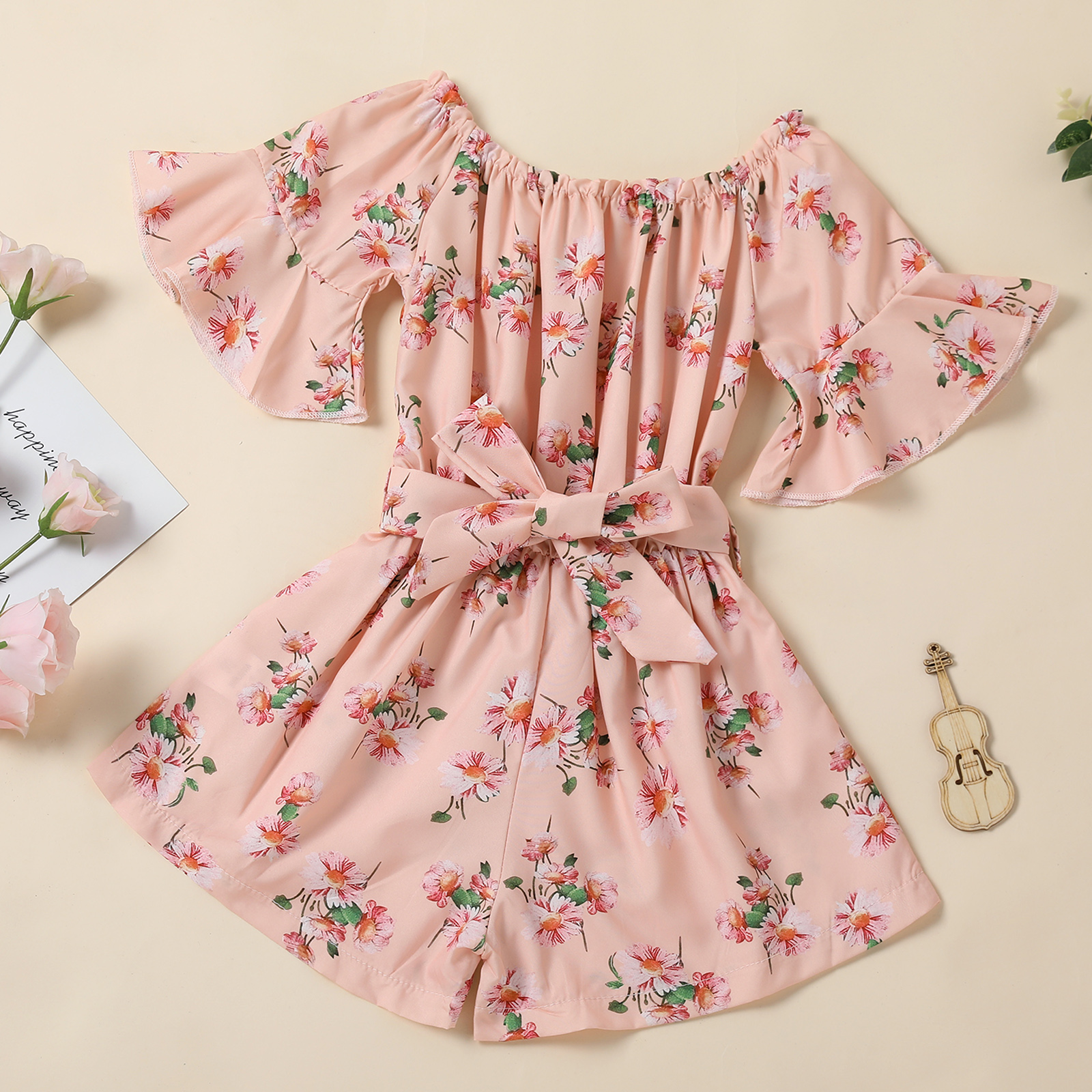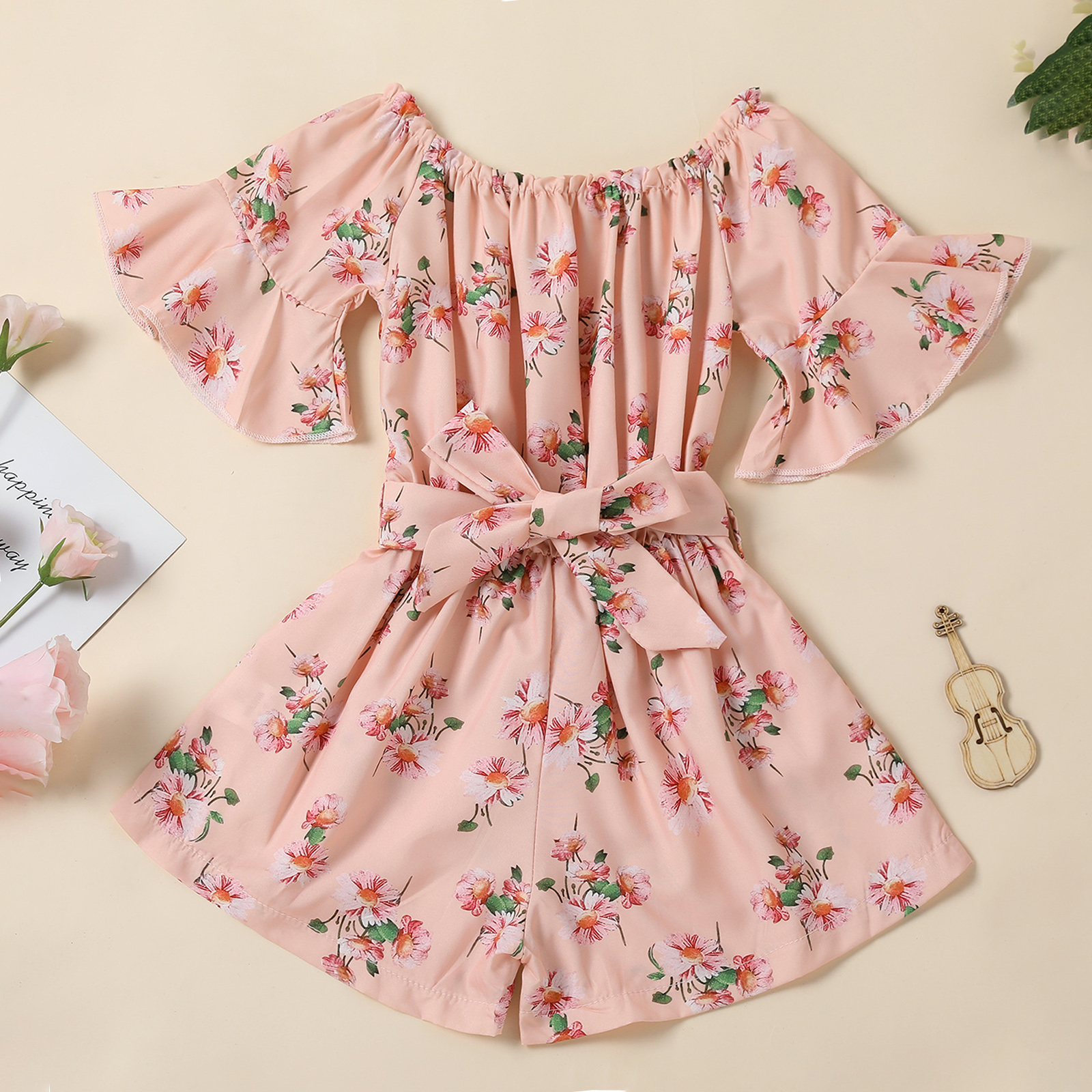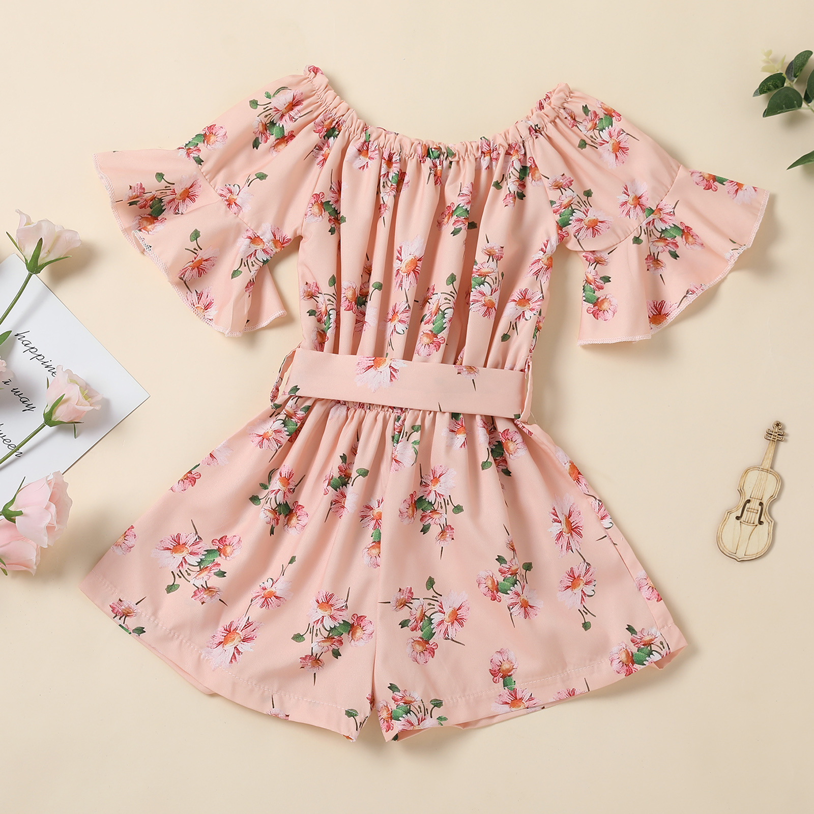 Модный комбинезон с короткими рукавами и поясом для маленьких девочек