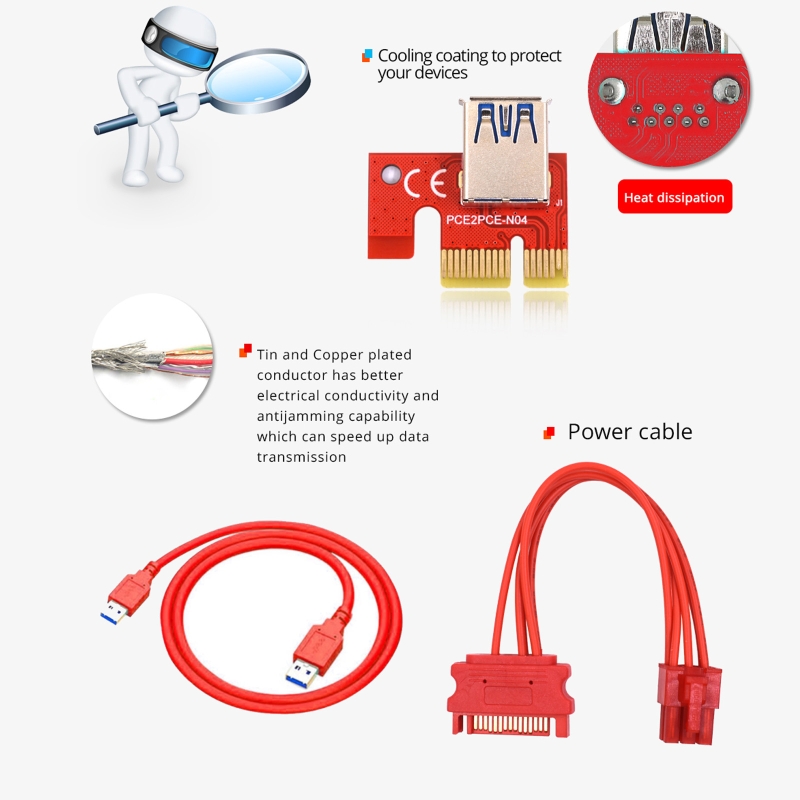 Этот Удлинительный кабель подходит для материнской платы PCI-E slot (1X 2X 4X 8X 16X). При использовании Подключите шнур питания флоппи-накопителя.