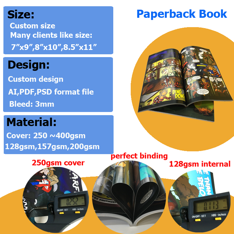 Книга с мягкой обложкой:Книга мягкой обложки-это мягкий чехол с идеальной вязкой, седловой строчкой и французскими закрылками. Чехол и текстовый запас могут быть покрыты или без покрытия. Также может быть дерево, матовый или блестящий.Крышка будет 250gsm ~ 400gsm, внутренняя может быть 105gsm ~ 200gsm