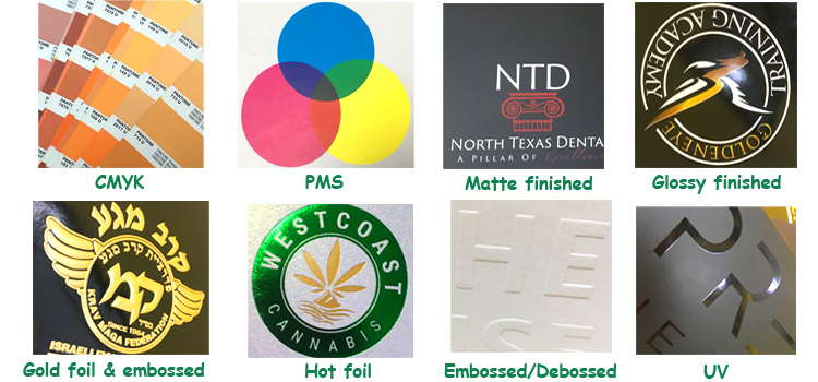 ПечатьCMYK цвет, PMS цвет, белые чернила, горячая фольга штамп (золото/slver/красный/черный, и т. Д.), пятно УФ