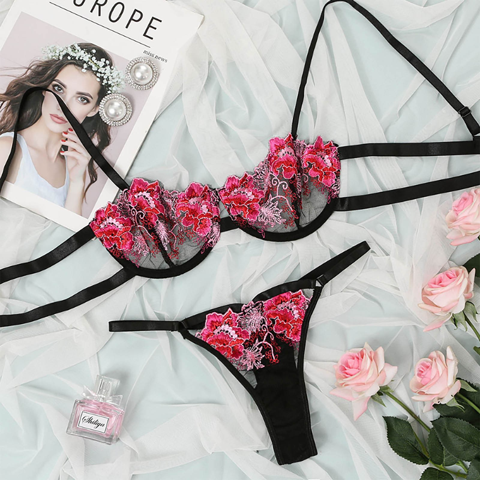 Material: Lace Style: sexy style Seasons: four seasons Type: Two-piece Suit Chest pad: none Fabric: slight stretch Location: Honeymoon, wedding night, lingerie party, pajamas, Valentine's Day, etc.product information: