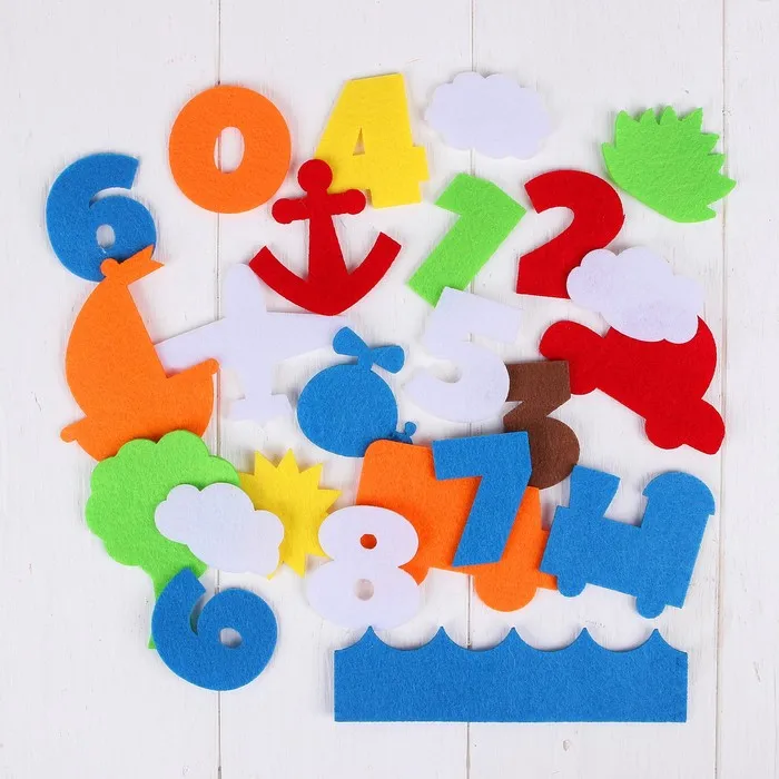 Рассмотрите элементы вместе с малышом. Предложите ребёнку назвать каждый предмет. Прикрепите элементы на коврике так, чтобы получилась картина.