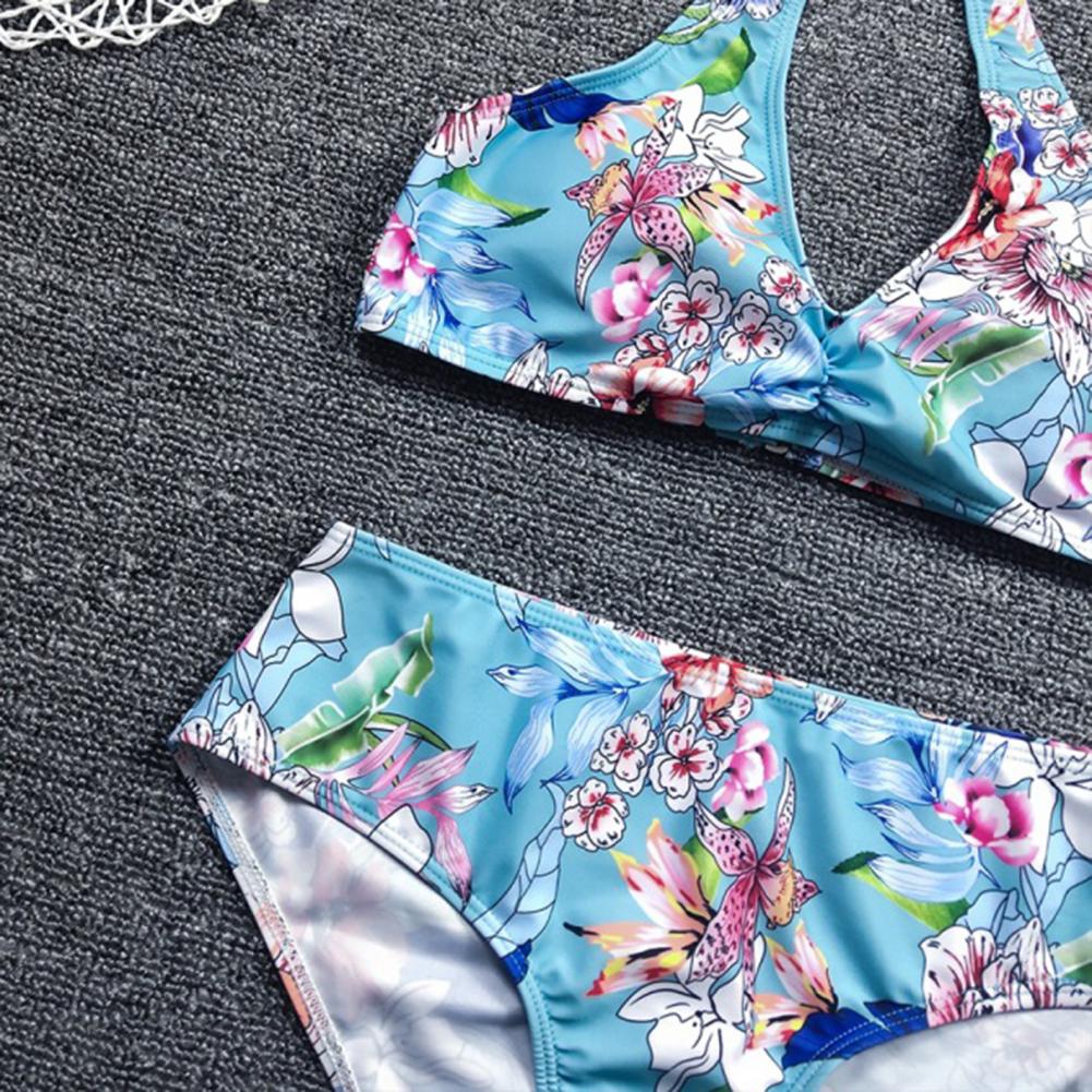 Бандажный мягкий пляжный комплект бикини из двух предметов с цветочным принтом, бюстгальтер с лямкой на шее, трусы с высокой талией, купальник для водной активности