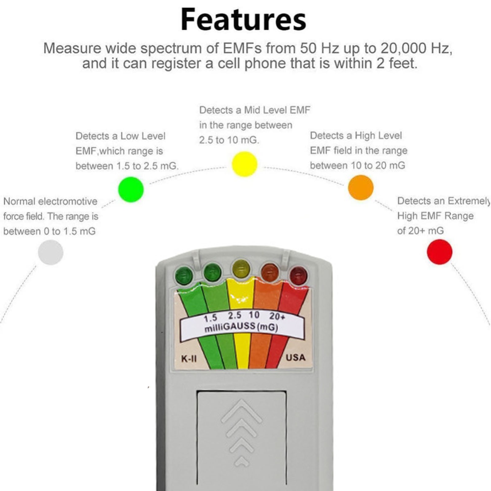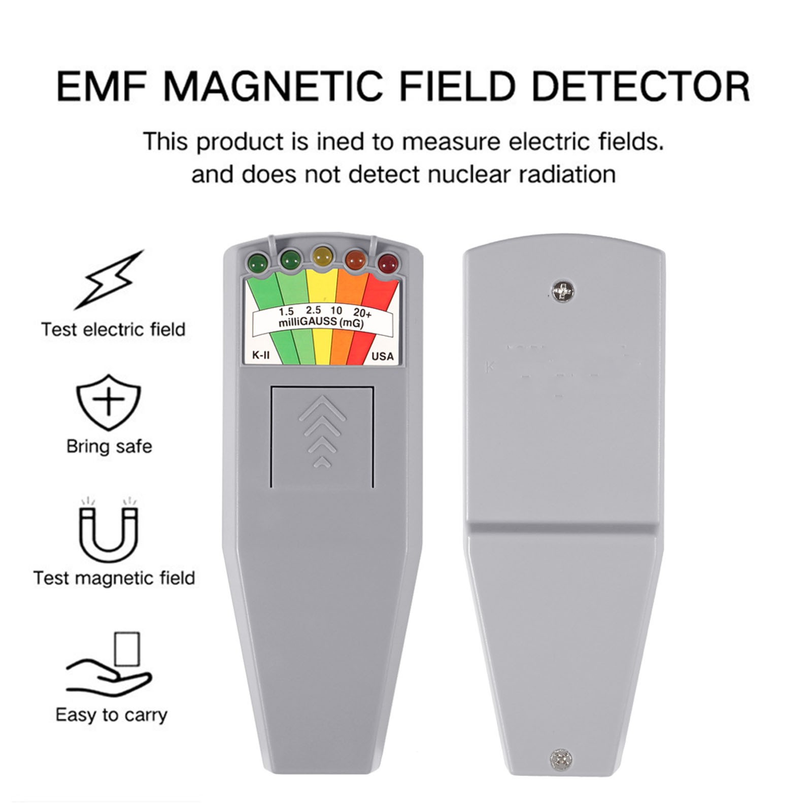 The ghost hunting equipment range used for ghost hunting helps to measure electromagnetic fields to identify equipment that generates high radiation and enables users to decide to limit exposure Easy-to-read :The colored led lights make readings obvious to notice in day light or dark; It is easy to always bring along since it fits in your pocket or purse! Levels are measured to guard against potentially harmful long-term overexposure to EMF Measuring a wide frequency spectrum of 50 Hz to 20,000 Hz, you can register a mobile phone with a distance of less than 2 feet LED Magnetic field detector table = reliable, sturdy, outstanding effect, super sensitive product description: material: ABS Size: 14.3x5.2cm Color: grayContain:1xTester (battery not included)