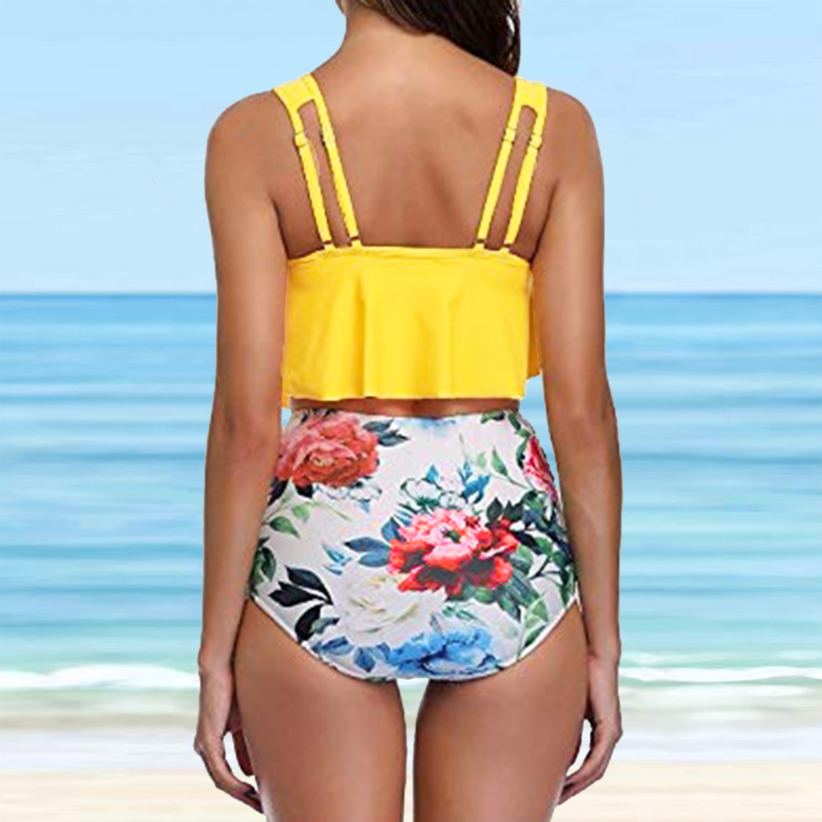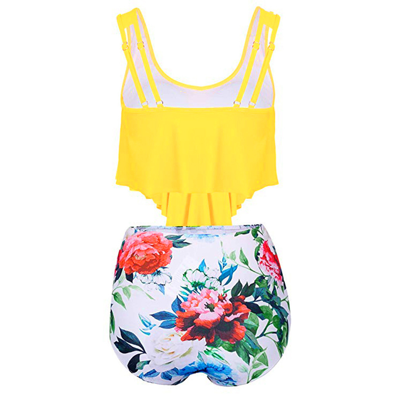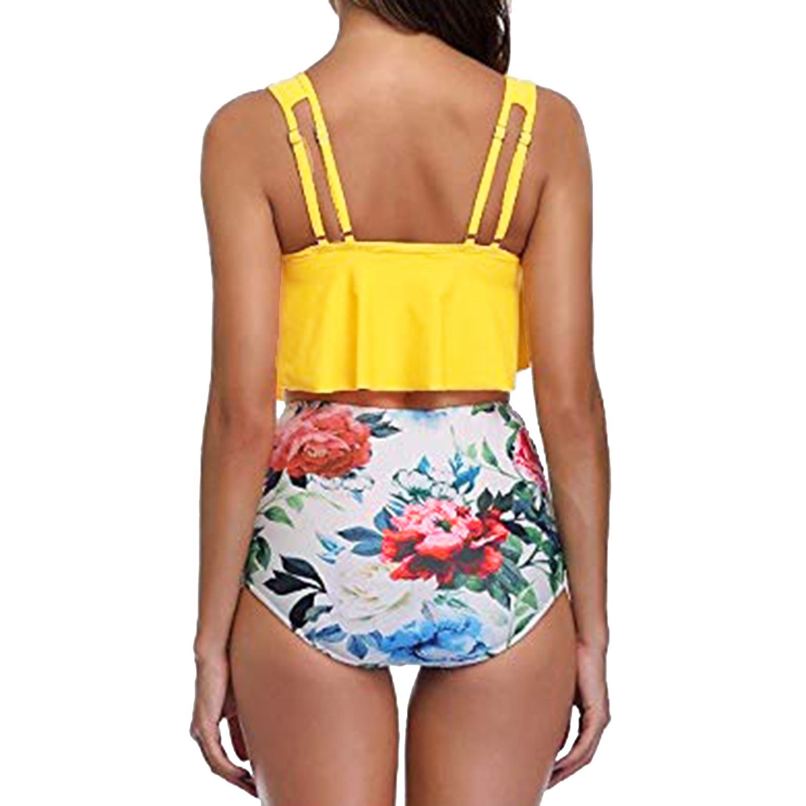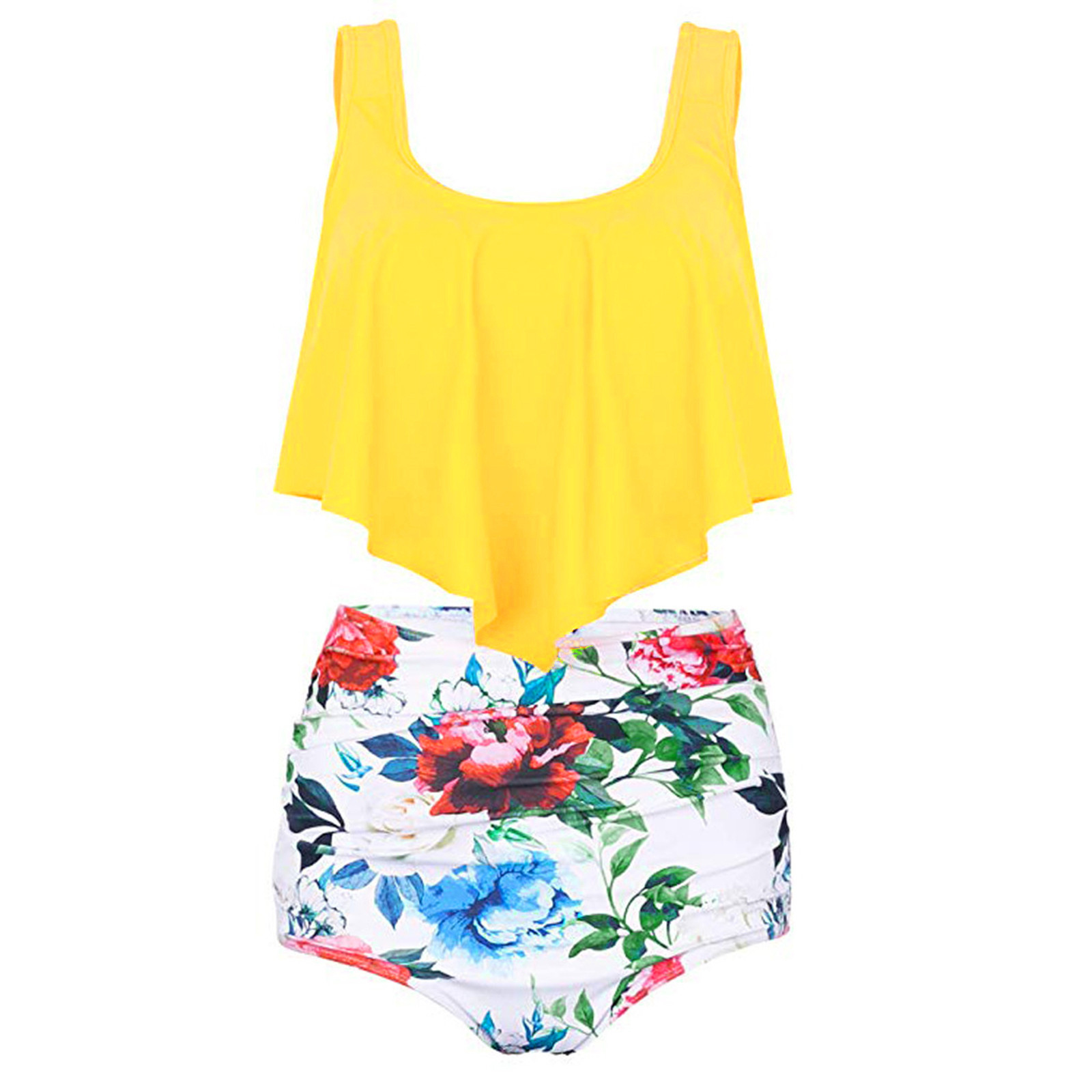 Женский винтажный купальник, два предмета, Ретро стиль, Холтер, с рюшами, высокая талия, принт, бикини, набор, Подсолнух, принт, накладной купальник, танкини
