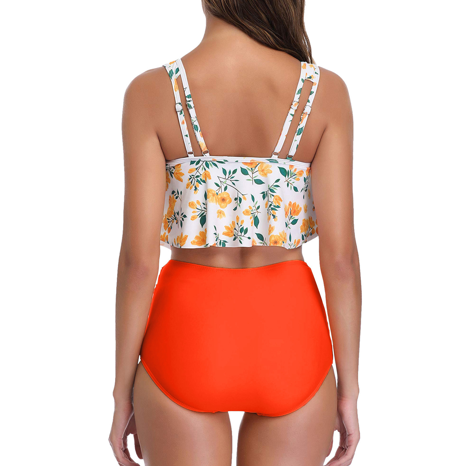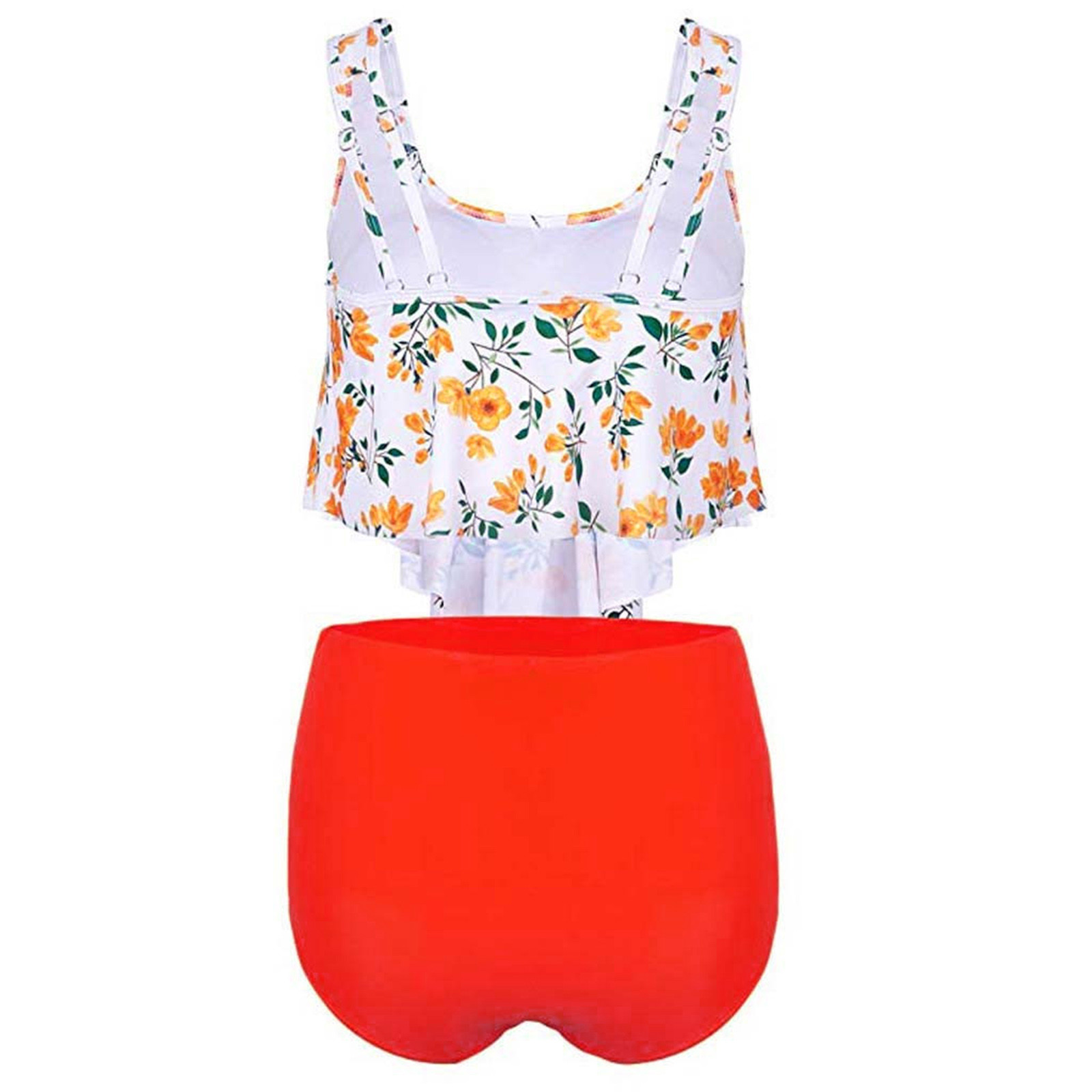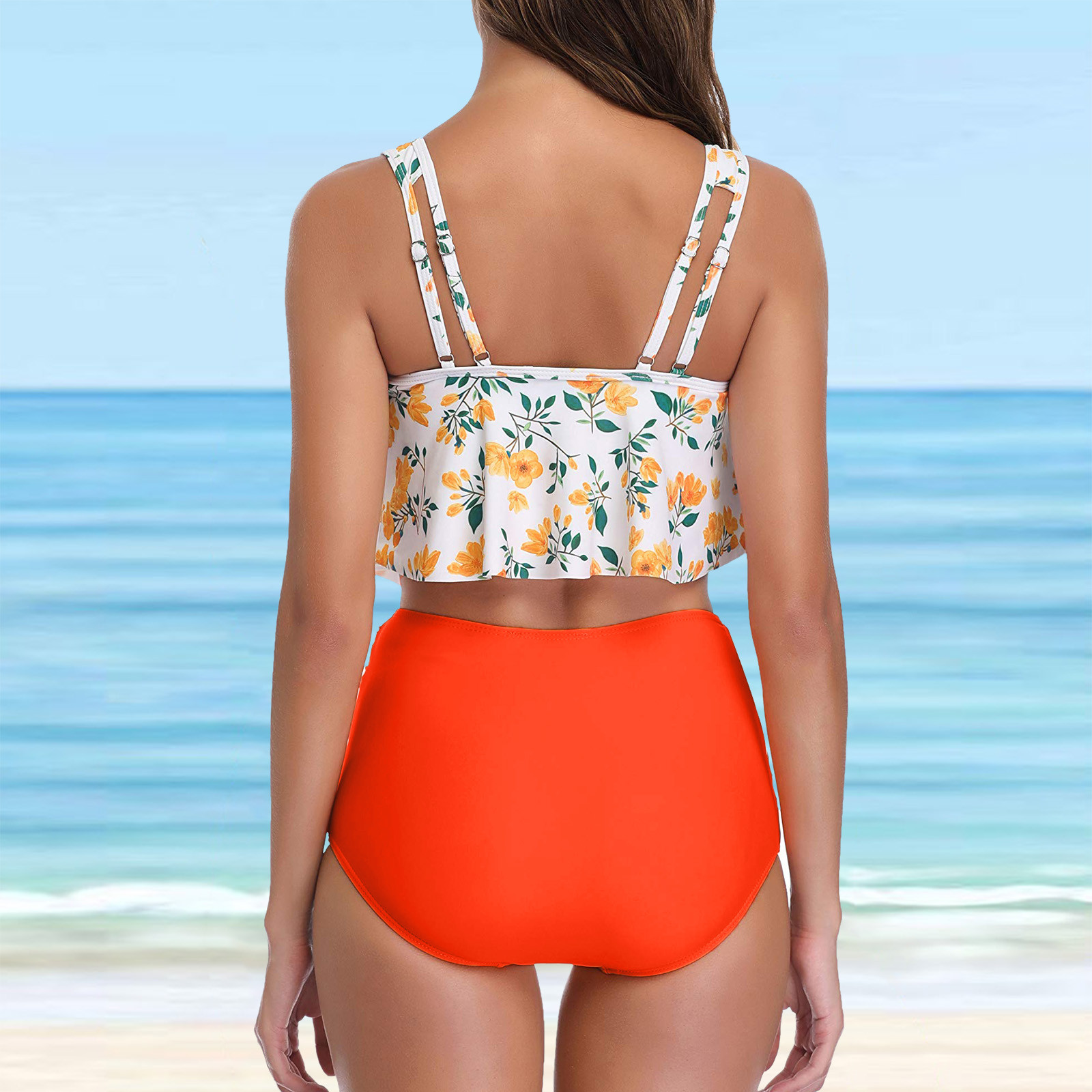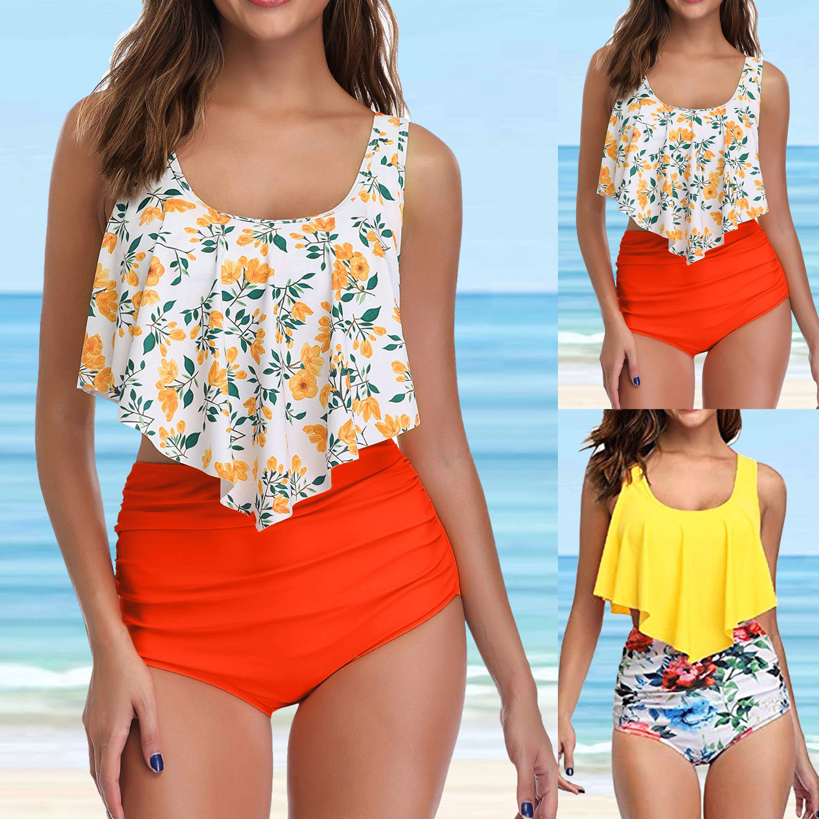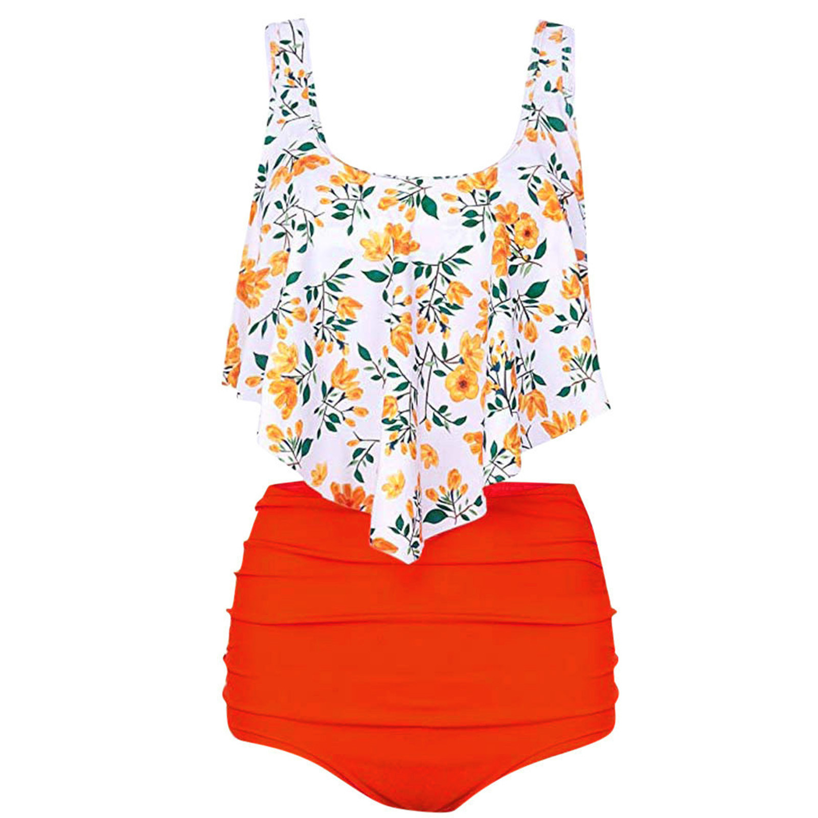Женский винтажный купальник, два предмета, Ретро стиль, Холтер, с рюшами, высокая талия, принт, бикини, набор, Подсолнух, принт, накладной купальник, танкини
