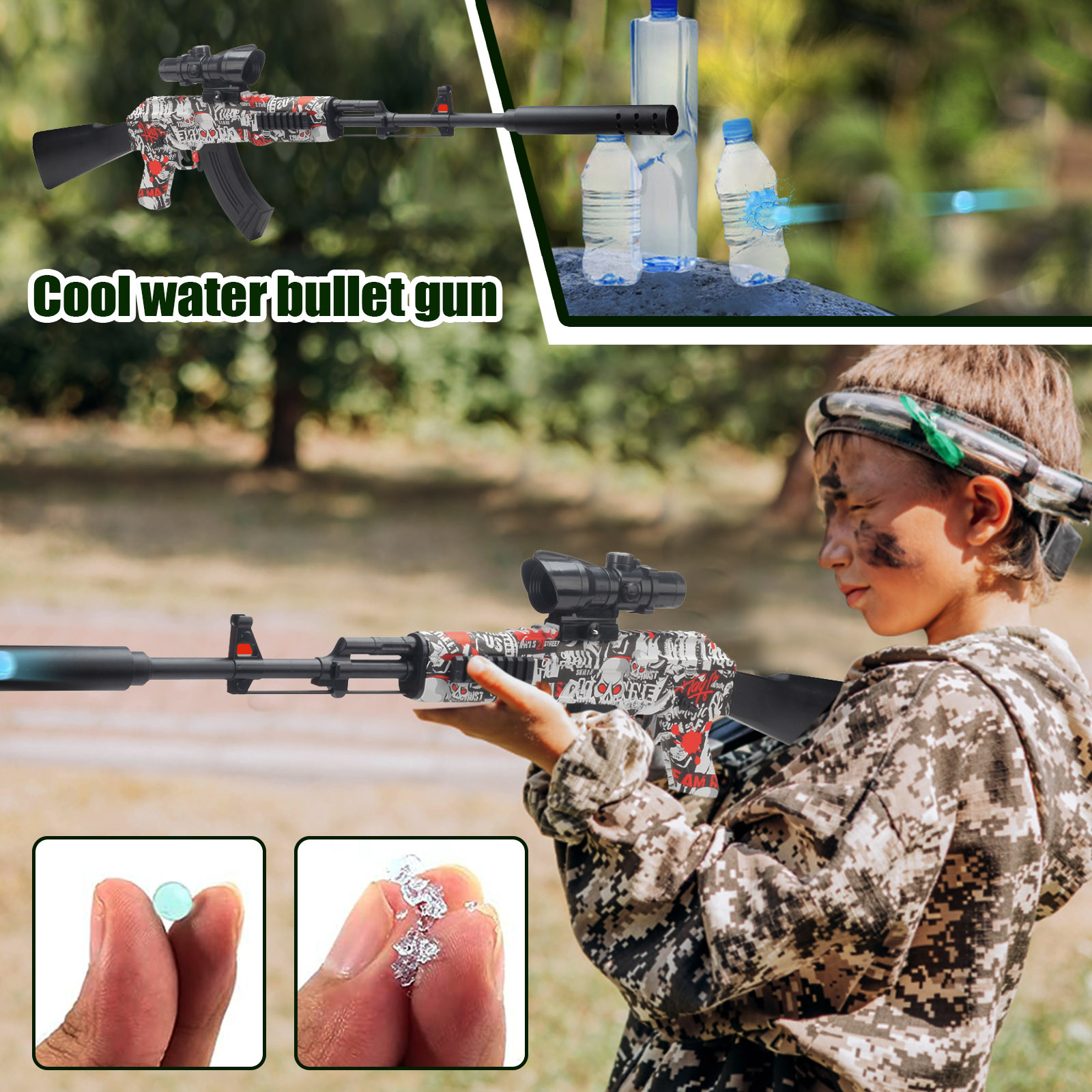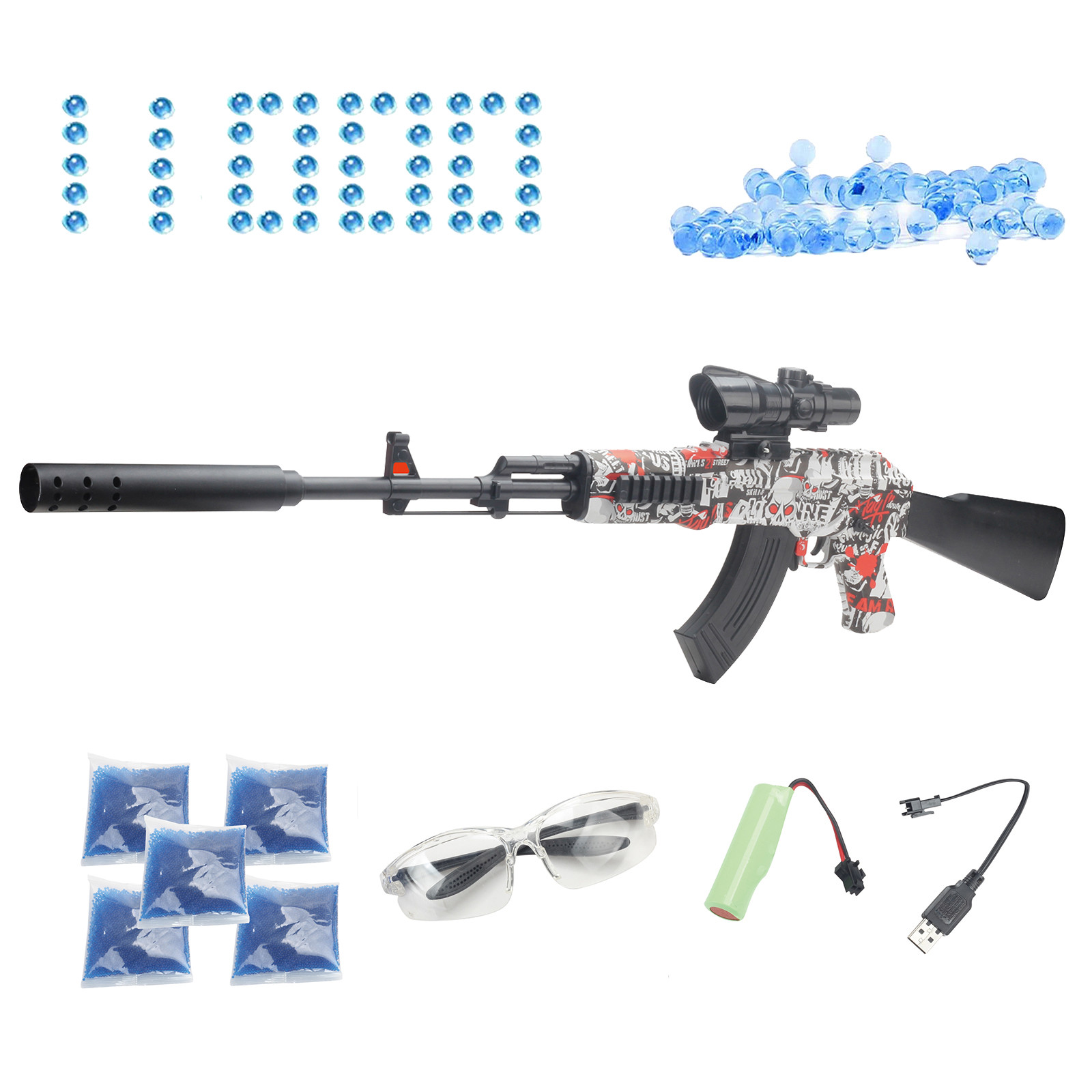 В комплекте]: 1 гелевый шаровой бластер, 1 многоразовый аккумулятор, 1 зарядное устройство USB, 1 бутылка, 11000 бусин для воды, 1 очки.