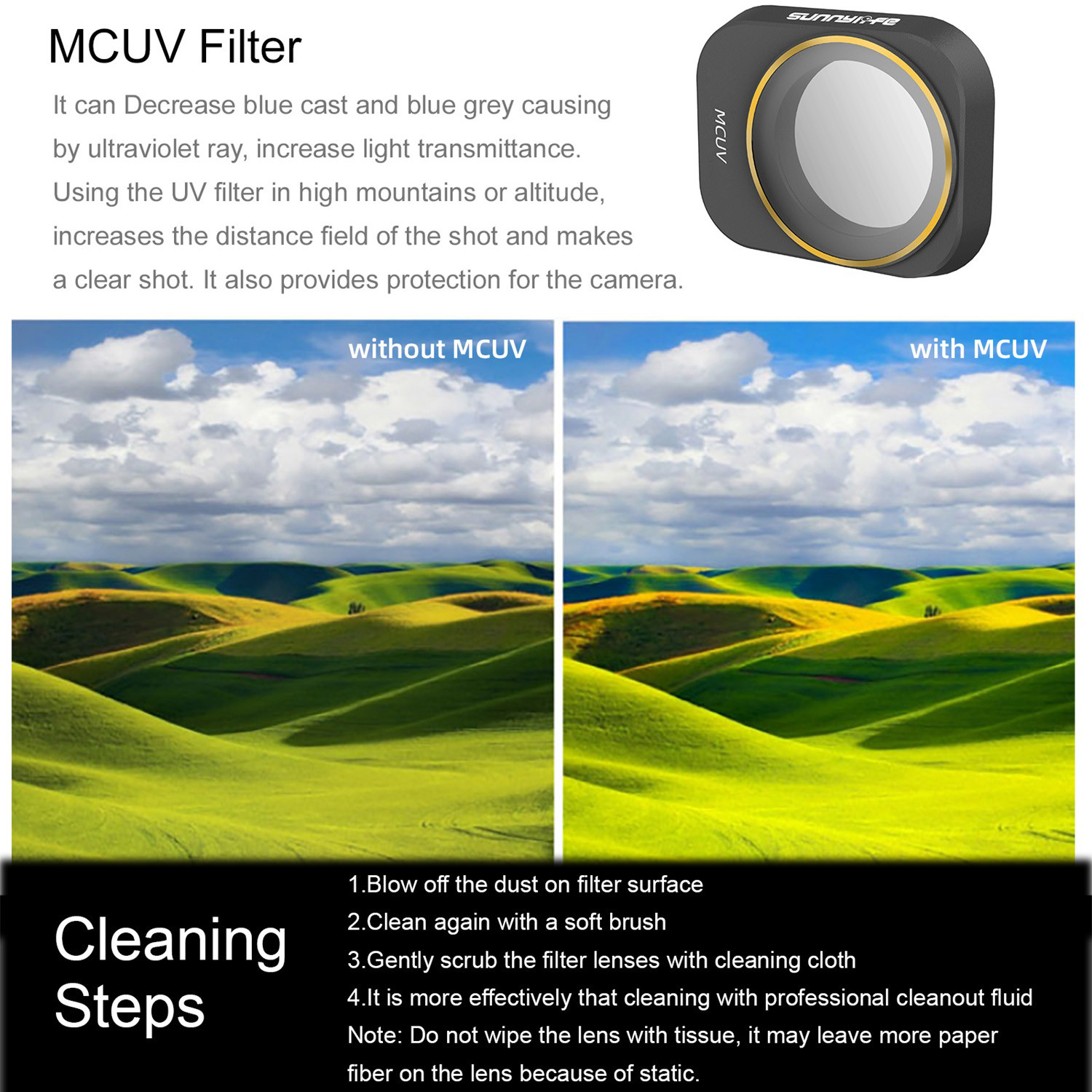 1. ВыдуйтеDu-st На поверхности фильтра 2. Очистите снова с помощью Мягкая щетка 3. Аккуратно протирайте Фильтрующие линзы с салфеткой для очистки 4. Это больше Эффективная очистка с помощью профессиональной жидкости для очистки Примечание: Не протирайте объектив С тканью, это может оставить больше бумажного волокна на объектив из-за статического.Посылка: