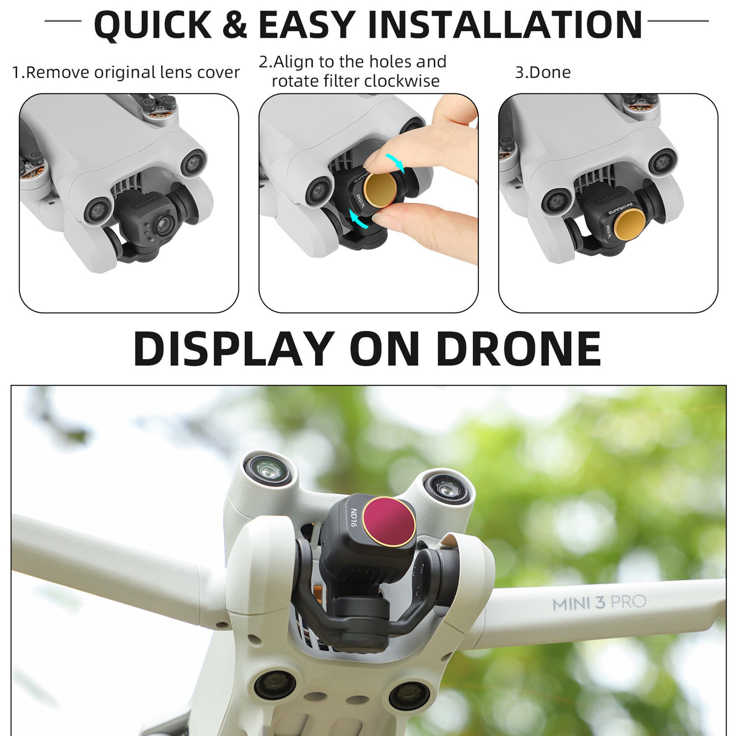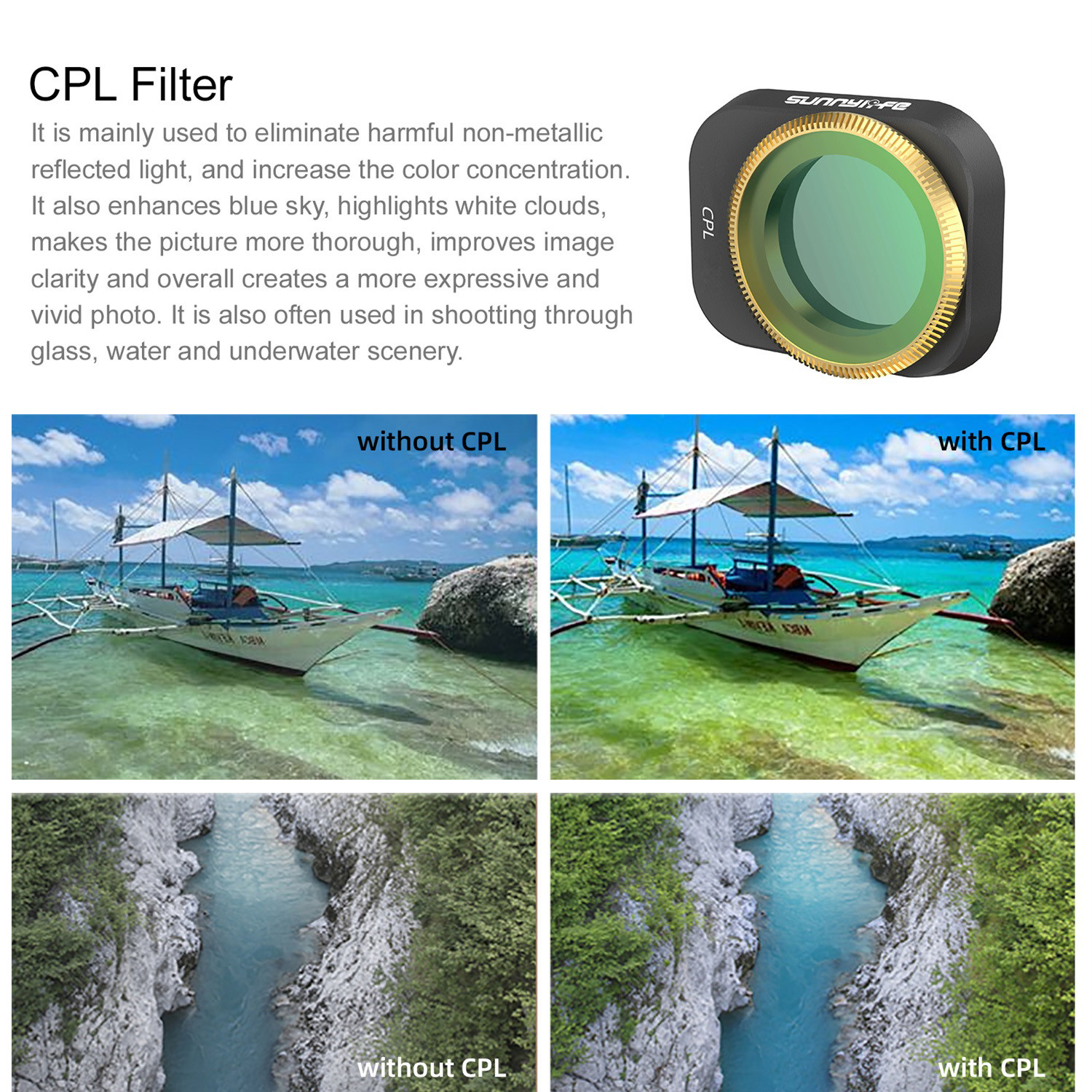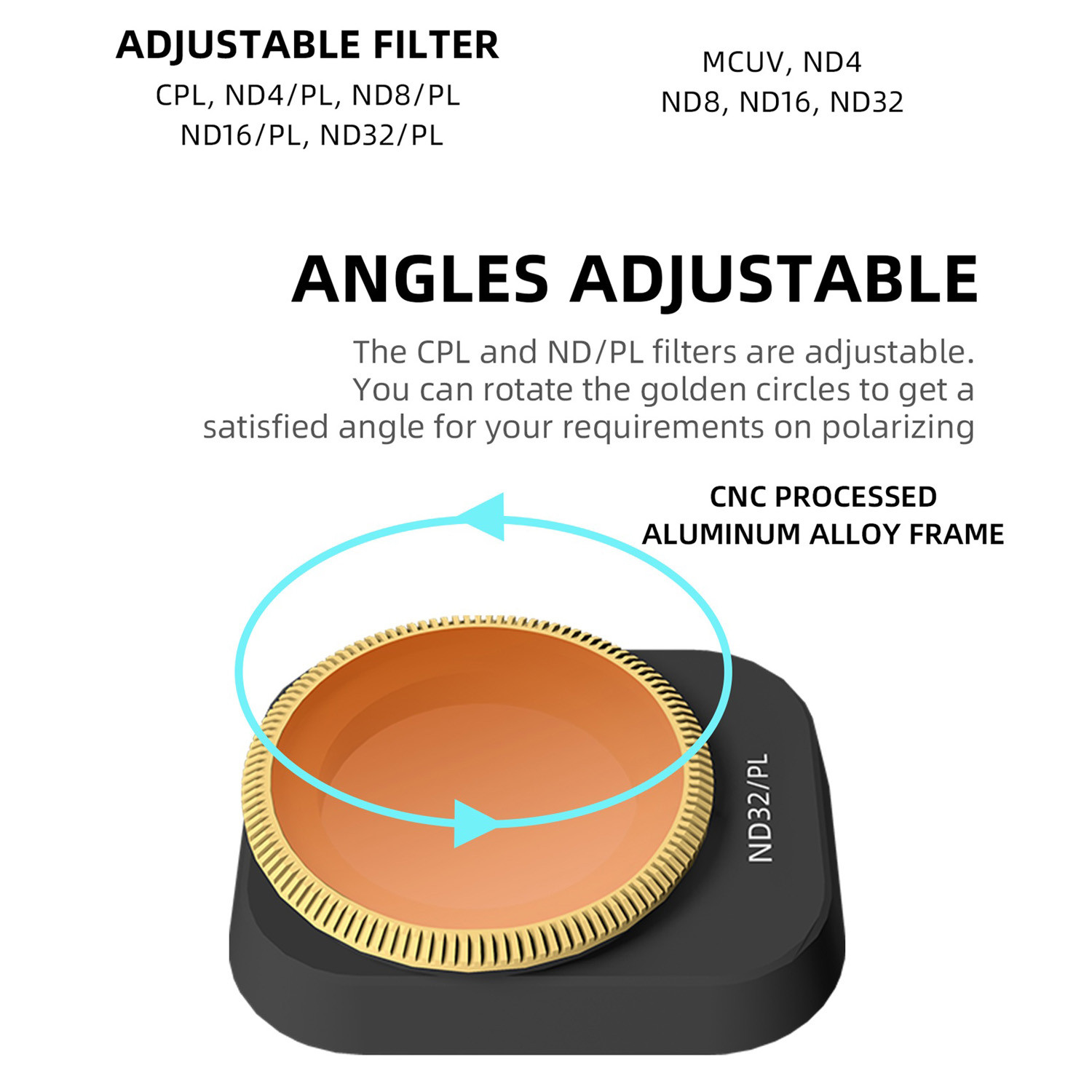 CPL и ND-PL Фильтры регулируются. Вы можете повернуть золотые круги, чтобы получить удовольствие Угол для ваших требований по поляризации. Профессиональный оптический Стеклянные линзы, специально подобранные Профессиональный оптический Стеклянные линзы (импортированные из Германии) с превосходным процессом обработки, хорошо Физические и hcemical свойства. Многослойное покрытие Пленки, высокий коэффициент пропускания, четкое изображение, восстановление цвета. Водонепроницаемость и Маслостойкий и устойчивый к царапинам, эффективно защищает мини-камеру Интегрированное моделирование Рамка, без темного угла. Бронзовая рамка, Великолепный и элегантный. Используется с оригинальным Защита карданного шарнира, непродуваемая и быстрая установка, плотно прилегает и Неразрушающее изображение.Регулируемый CPL фильтр: