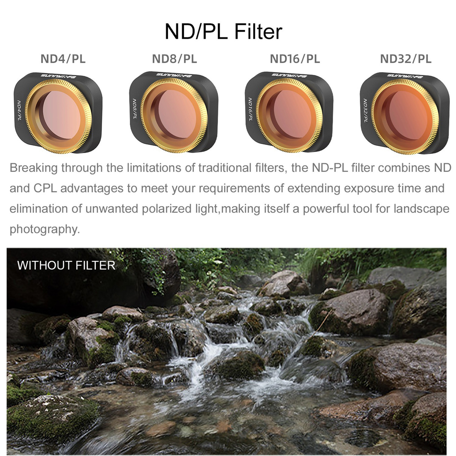 Прорвав через Ограничение традиционных фильтров, ND-PL фильтр сочетает ND и CPL Преимущества, чтобы удовлетворить ваши требования о продлении времени экспозиции и Устранение нежелательного поляризованного светильник, что делает себя мощным инструментом для Ландшафтная фотография.ND фильтр