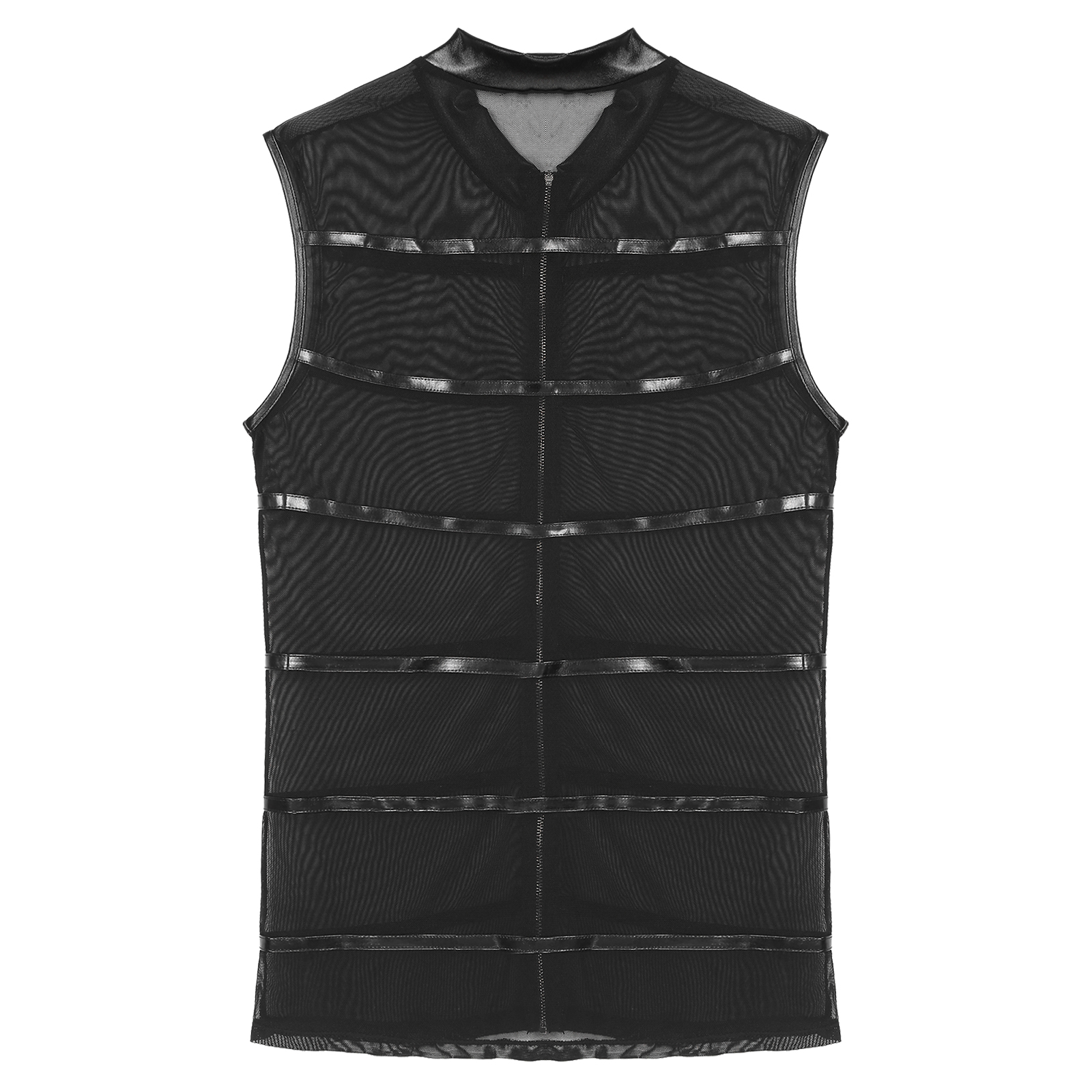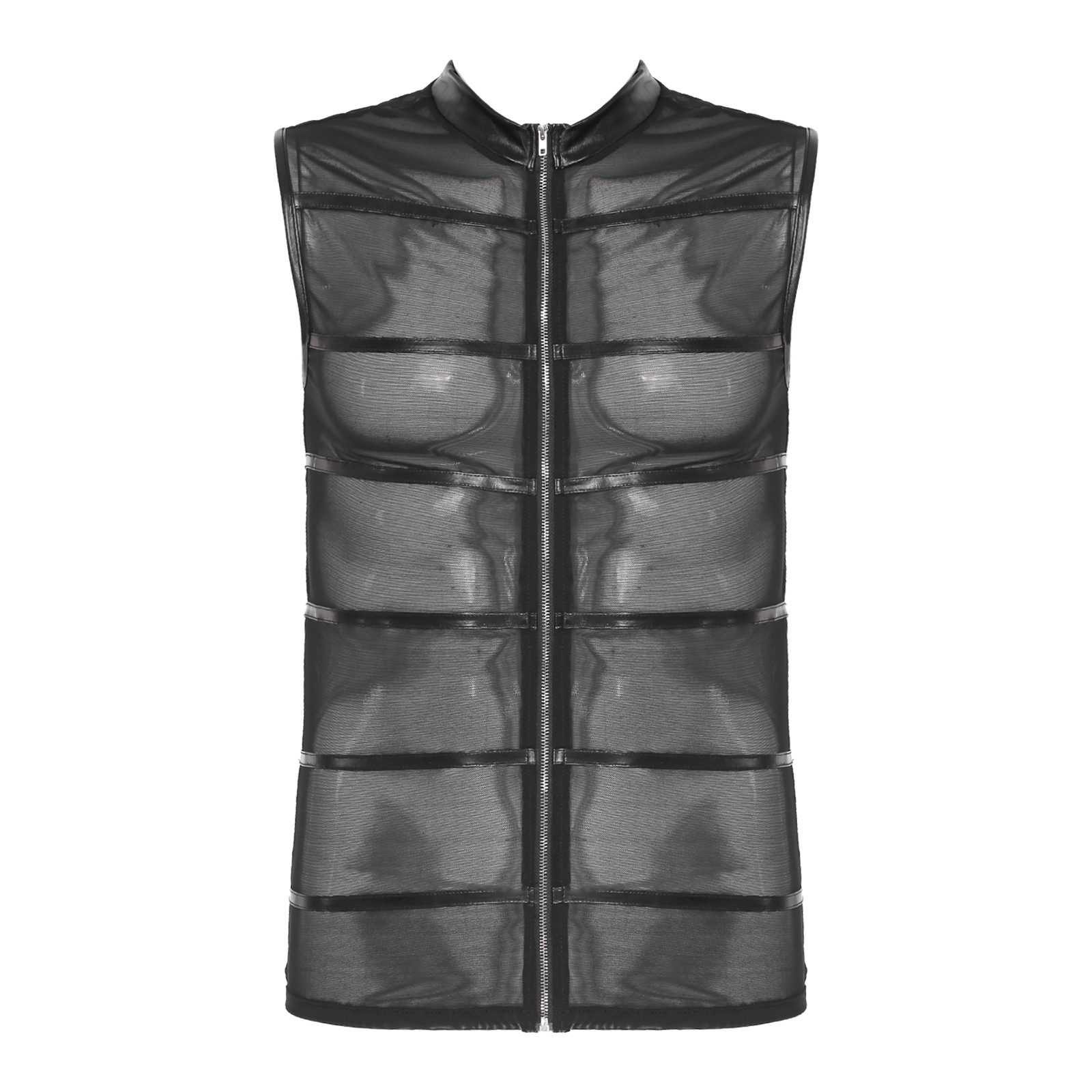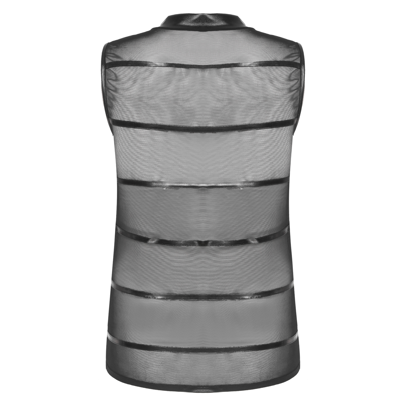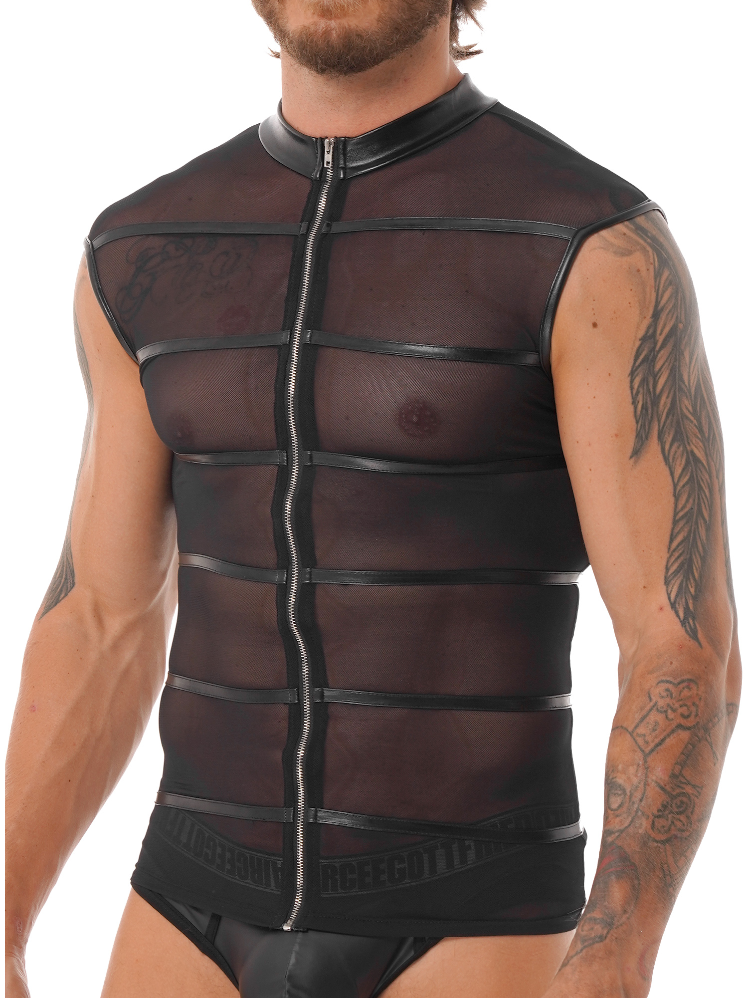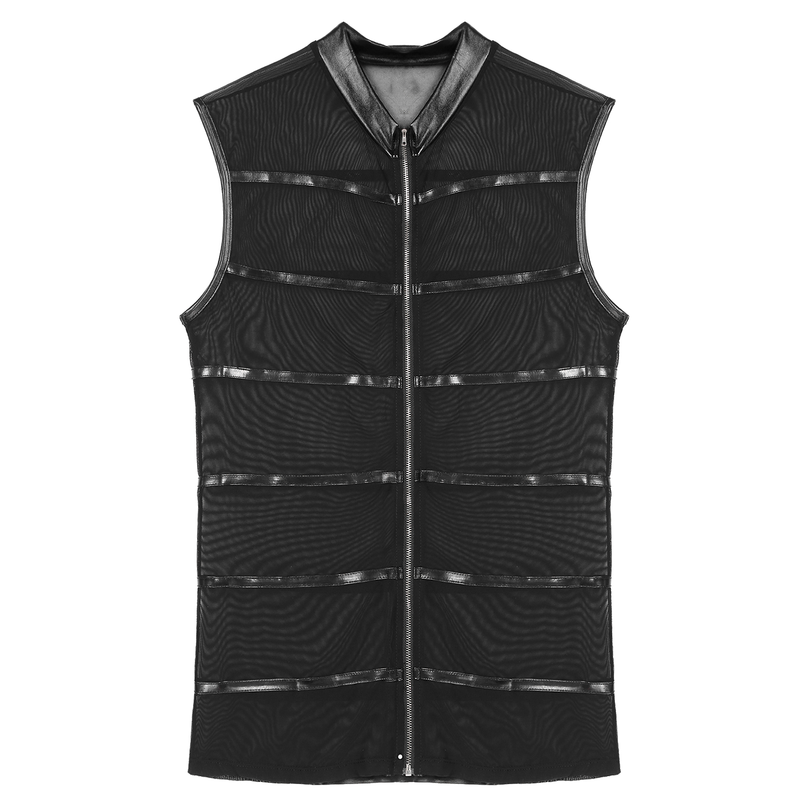 Мужская футболка из искусственной кожи в полоску с прозрачной сеткой на молнии без рукавов.