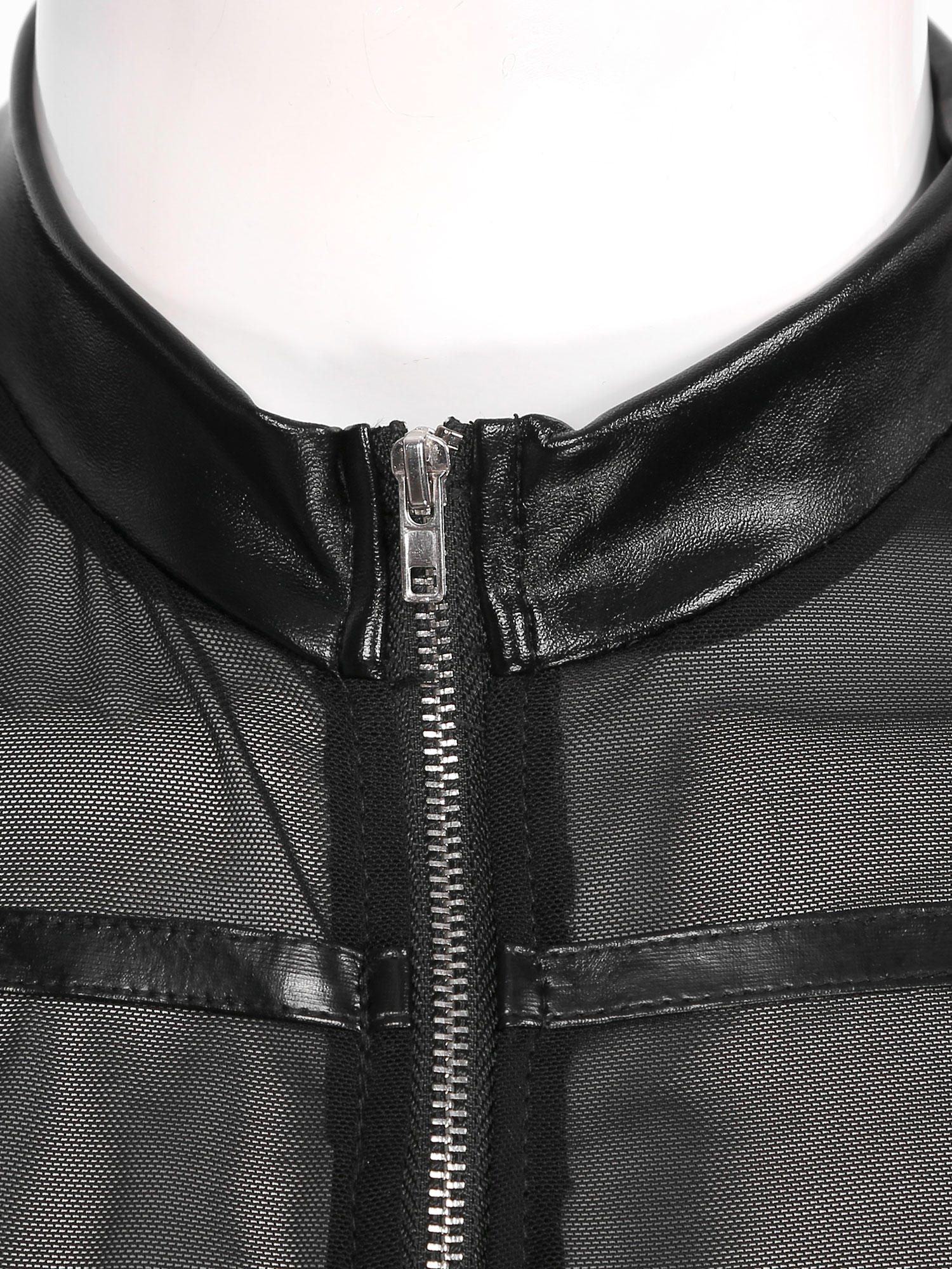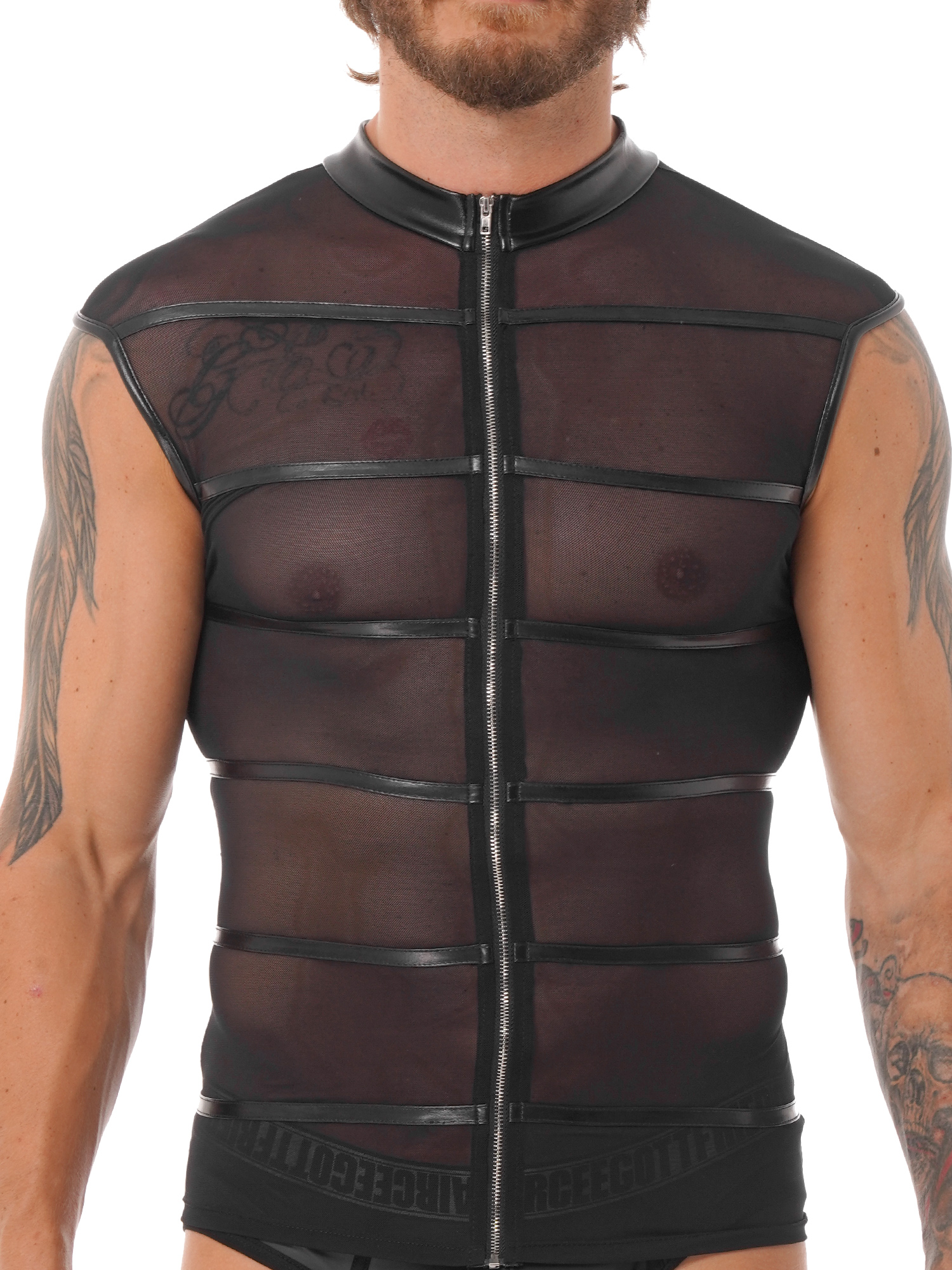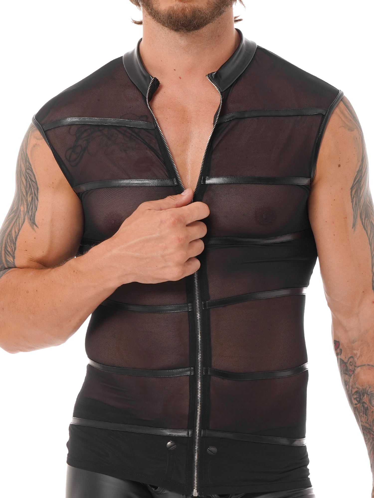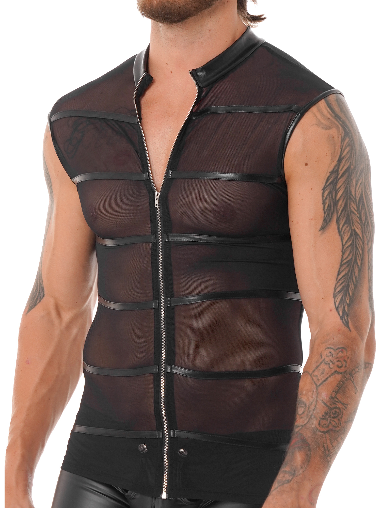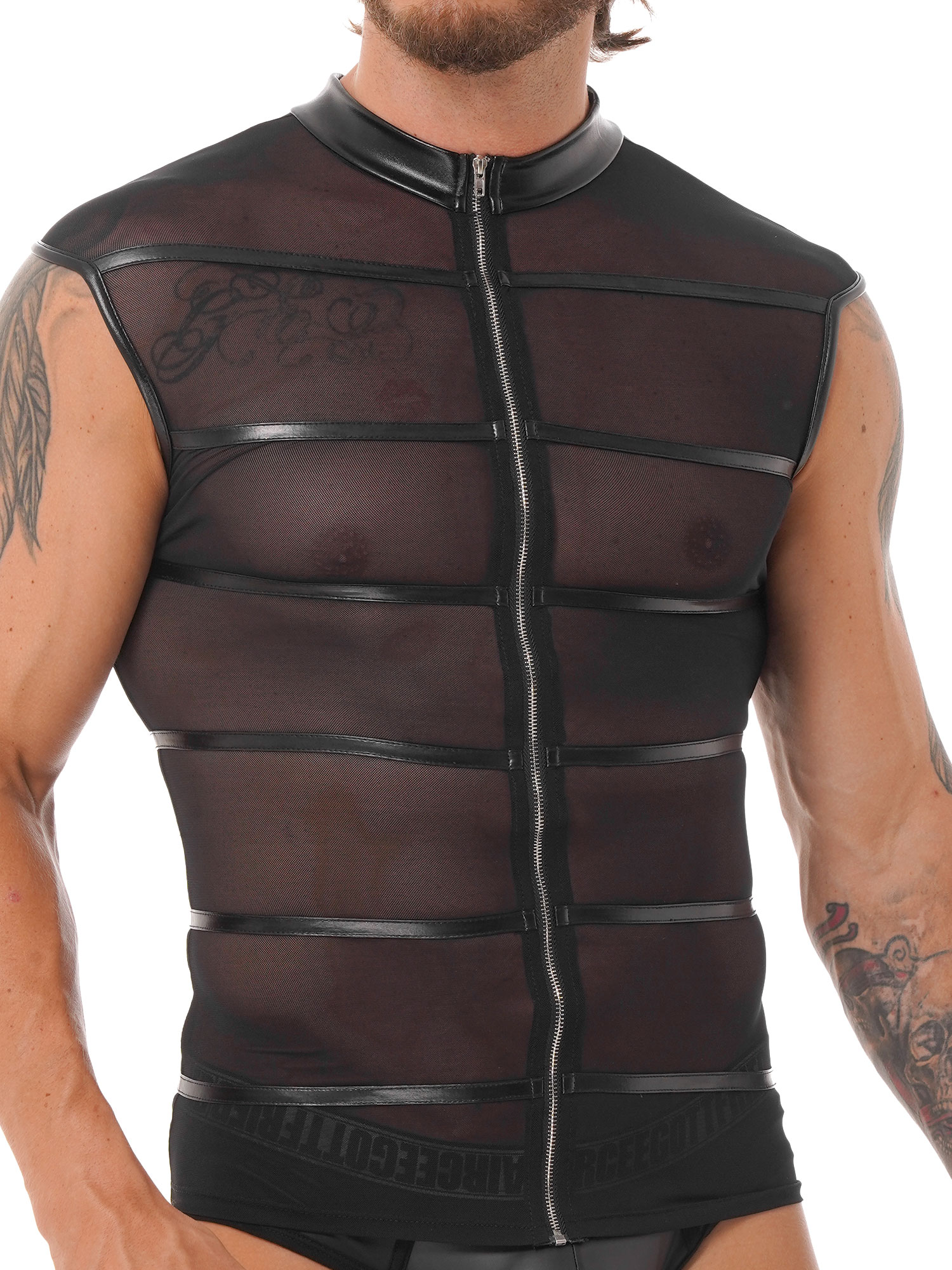 Мужская футболка из искусственной кожи в полоску с прозрачной сеткой на молнии без рукавов.