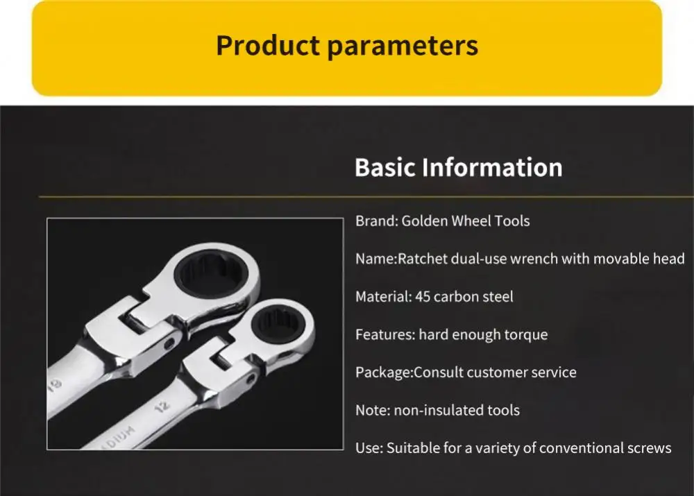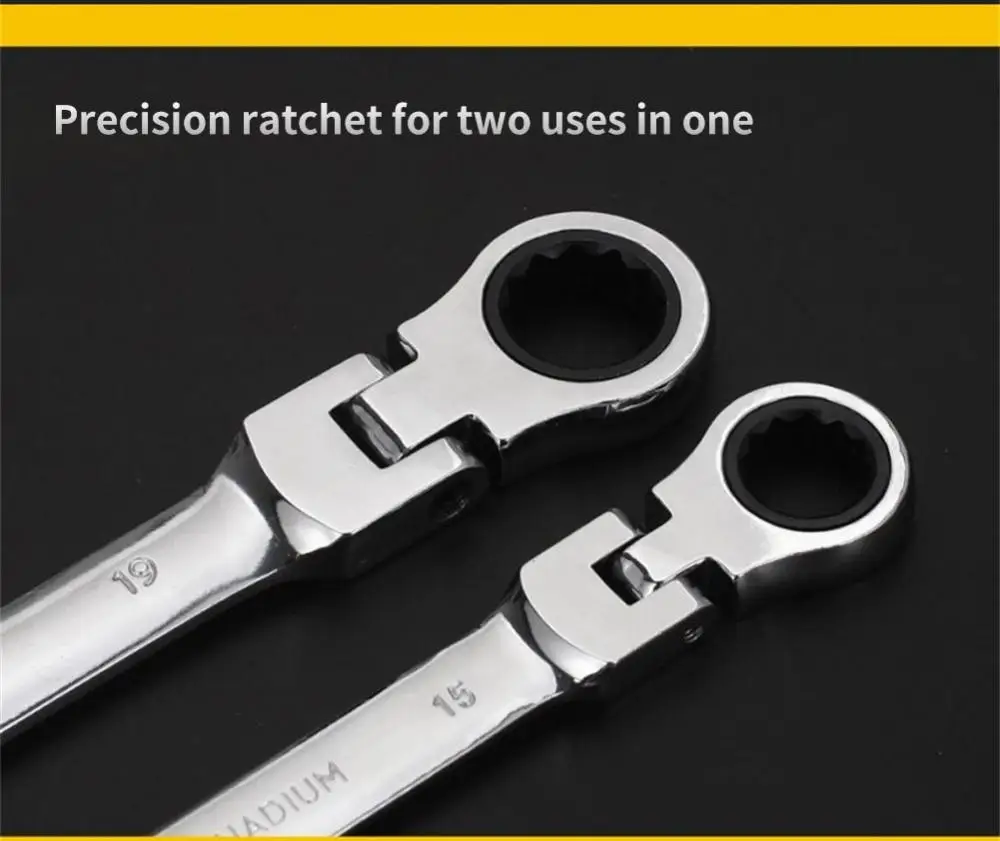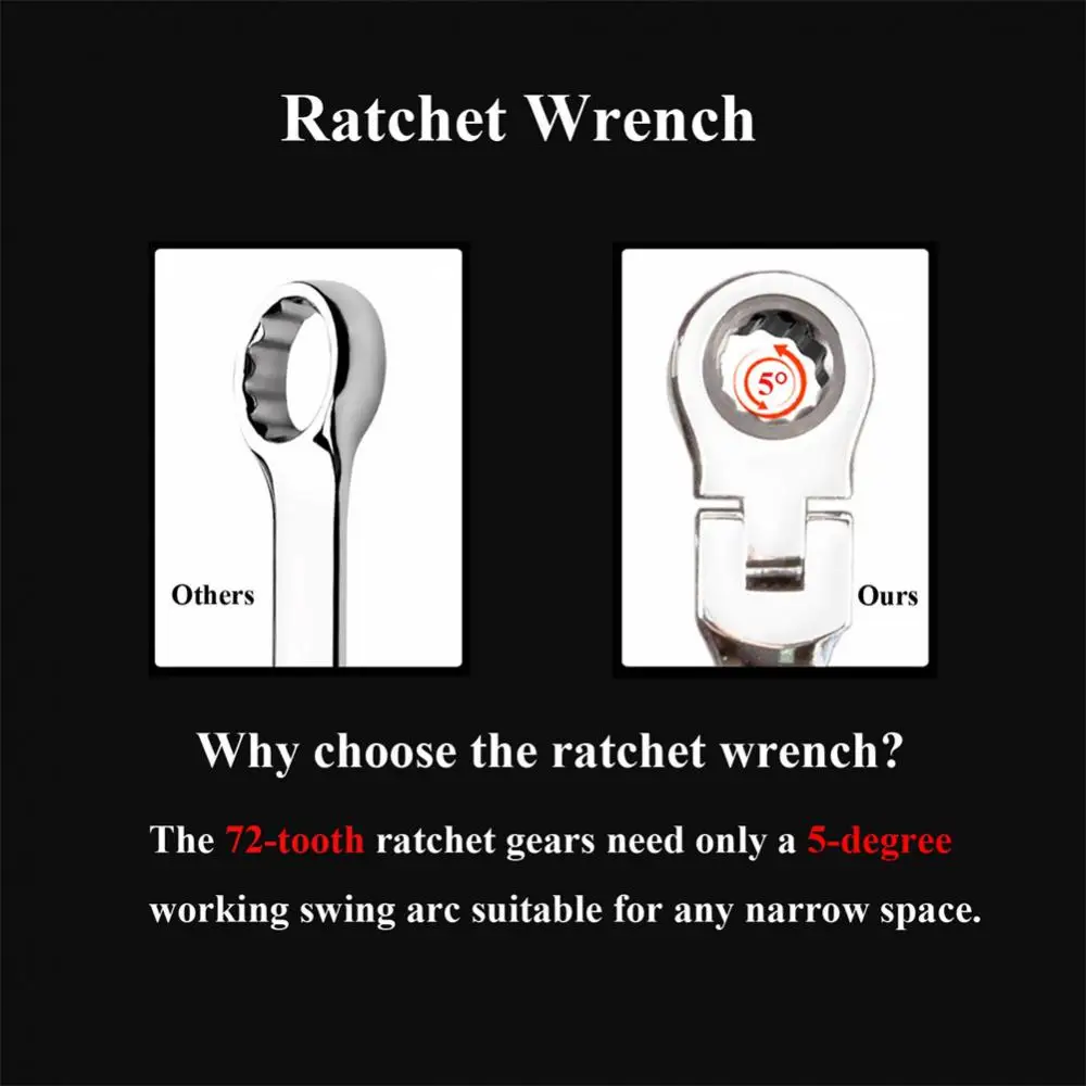 [Конструкция гибкой головки на 180 °]: изгиб на 180 ° может достигать тех позиций, которые большинство храповых ключей не могут. Болты и гайки легко затягиваются или ослабляются. Набор трещоточных ключей предназначен для использования в плотных помещениях.