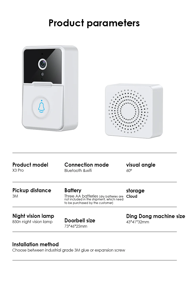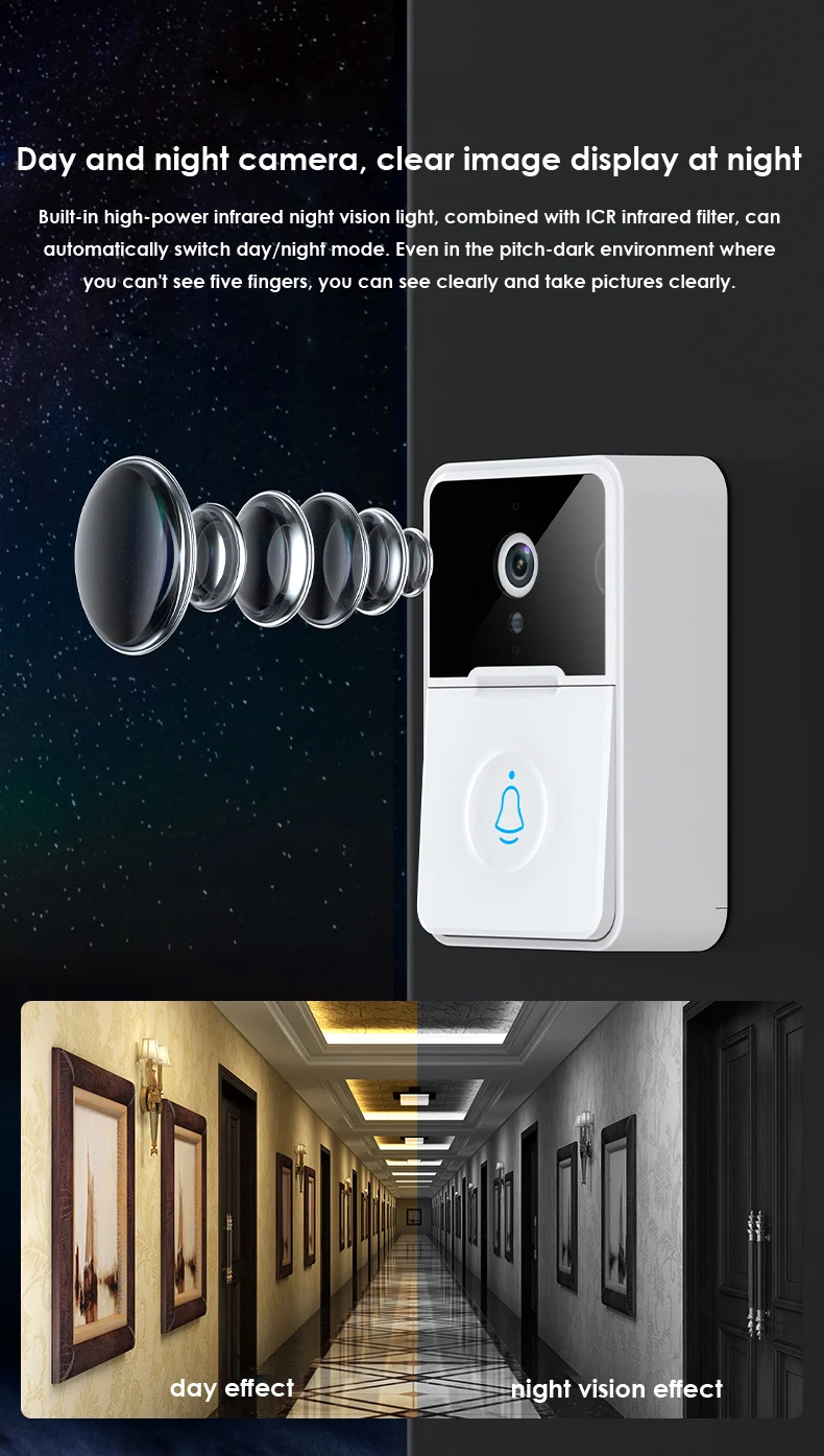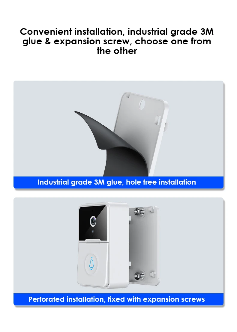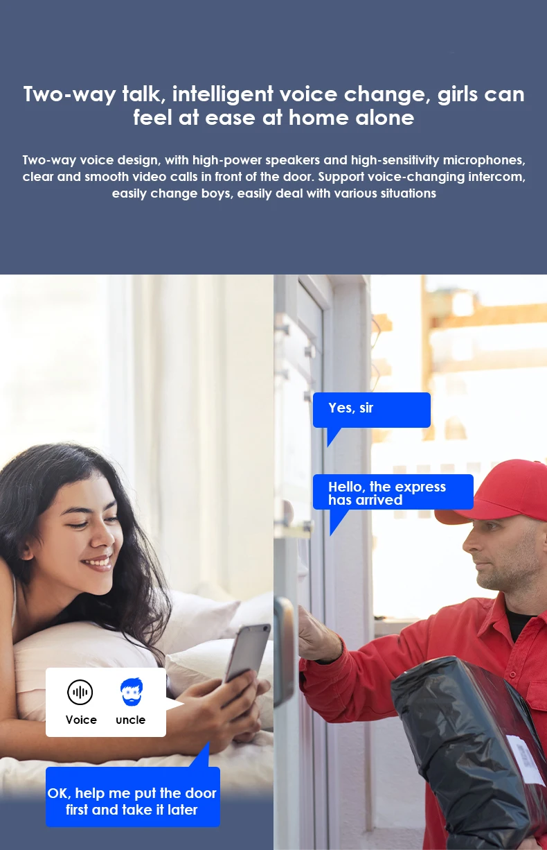 Двухсторонний голосовой дизайн, с мощными динамиками и высокочувствительными микрофонами, визуальный звонок перед дверью четкий и гладкий. Поддержка голосовой связи, легко менять мальчиков и легко справляться с различными условиями
