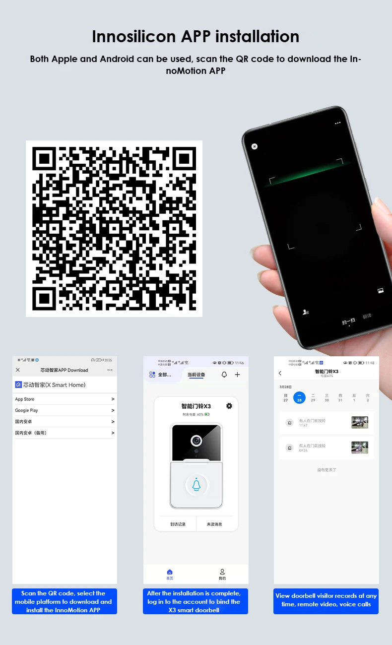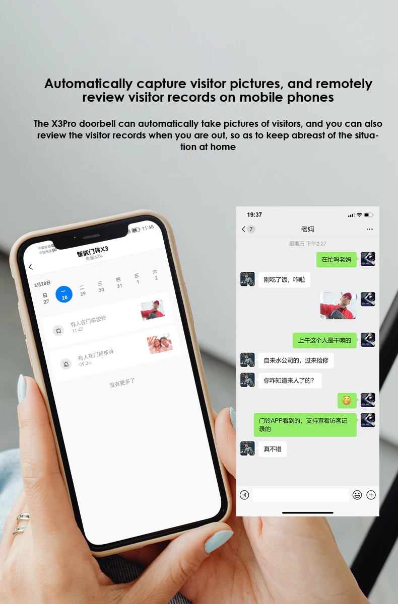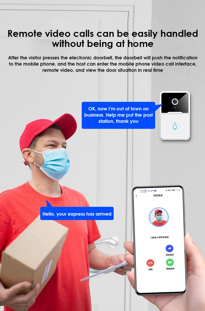 После того, как Посетитель нажимает электронный дверной звонок, дверной звонок будет нажимать уведомление на мобильный телефон, и хост может войти в мобильный телефон с интерфейсом видеозвонка, удаленным видео и просмотреть ситуацию с дверью в режиме реального времени